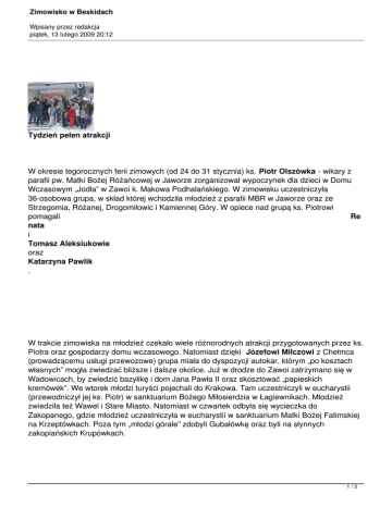 Zimowisko w Beskidach Wpisany przez redakcja piątek, 13 lutego 2009 20:12 Tydzień pełen atrakcji W okresie tegorocznych ferii zimowych (od 24 do 31 stycznia) ks. Piotr Olszówka - wikary z parafii pw. Matki Bożej Różańcowej w Jaworze zorganizował wypoczynek dla dzieci w Domu Wczasowym „Jodła” w Zawoi k. Makowa Podhalańskiego. W zimowisku uczestniczyła 36-osobowa grupa, w skład której wchodziła młodzież z parafii MBR w Jaworze oraz ze Strzegomia, Różanej, Drogomiłowic i Kamiennej Góry. W opiece nad grupą ks. Piotrowi pomagali Re nata i Tomasz Aleksiukowie oraz Katarzyna Pawlik . W trakcie zimowiska na młodzież czekało wiele różnorodnych atrakcji przygotowanych przez ks. Piotra oraz gospodarzy domu wczasowego. Natomiast dzięki Józefowi Milczowi z Chełmca (prowadzącemu usługi przewozowe) grupa miała do dyspozycji autokar, którym „po kosztach własnych” mogła zwiedzać bliższe i dalsze okolice. Już w drodze do Zawoi zatrzymano się w Wadowicach, by zwiedzić bazylikę i dom Jana Pawła II oraz skosztować „papieskich kremówek”. We wtorek młodzi turyści pojechali do Krakowa. Tam uczestniczyli w eucharystii (przewodniczył jej ks. Piotr) w sanktuarium Bożego Miłosierdzia w Łagiewnikach. Młodzież zwiedziła też Wawel i Stare Miasto. Natomiast w czwartek odbyła się wycieczka do Zakopanego, gdzie młodzież uczestniczyła w eucharystii w sanktuarium Matki Bożej Fatimskiej na Krzeptówkach. Poza tym „młodzi górale” zdobyli Gubałówkę oraz byli na słynnych zakopiańskich Krupówkach. 1/3 Zimowisko w Beskidach Wpisany przez redakcja piątek, 13 lutego 2009 20:12 Dni spędzone w Zawoi przepełnione były ruchem na świeżym powietrzu połączonym z poznawaniem okolicy. Odbyły się wycieczki w góry, m.in. na Mosorny Groń czy ścieżką edukacyjną Wawrzyńca Szkolnika, zwiedzanie skansenu „Kurna chata” i Muzeum Babiogórskiego Parku Narodowego. Uczestnicy zimowiska byli również w kościele o.o. Karmelitów Bosych znajdującym się na skraju miasteczka. Oprócz tego wzięli udział w spotkaniach z ciekawymi ludźmi. Garncarz pokazał jak z gliny można wykonać wazony, miski czy garnki, a młodzież mogła spróbować swoich sił w tym zanikającym rzemiośle. Ludowy artysta zapoznał uczestników zimowiska ze sztuką malowania na szkle, czego młode cepry mogły także spróbować. Natomiast leśnik opowiadał o faunie i florze Babiogórskiego Parku Narodowego. Dużą atrakcją był kulig z pieczeniem kiełbasek, lepienie bałwana i „śnieżna bitwa” oraz „zbójnickie gibanie”, podczas którego miejscowi górale przedstawili historię regionu, opowiadali legendy oraz zaprezentowali ludowe stroje, muzykę i śpiew. Centrum każdego dnia pobytu na zimowisku stanowiła eucharystia (z udziałem gospodarzy domu), której oprawę liturgiczną przygotowywała młodzież pod opieką p. Tomasza. W tak wypełnionych dniach znalazł się jeszcze czas na wspólne obejrzenie filmu „Patch Adams”, a na zakończenie pobytu - pogodny wieczorek. A oto jak wyjazd do Zawoi komentują jego uczestnicy. Marta: - Wyjazd uważam za bardzo udany. Przez 7 dni ani razu nie zdążyłam się nudzić. Codzienne atrakcje były mniej lub bardziej udane, myślę jednak, że każdy znalazł coś dla siebie. Podobały mi się wycieczki do Krakowa i Zakopanego, wspólne oglądanie filmu i kulig. Pierwszy raz jechałam takimi wielkimi saniami i była to dla mnie naprawdę świetna rozrywka. Wycieczki w góry były męczące, aczkolwiek cieszę się, że „pokonałam” te góry. NN: - Przyznaję, że na początku troszkę przestraszył mnie „rekreacyjny” spacer na Mosorny Groń (ponad 1000 m n.p.m.). Skoro tak, to jak wygląda prawdziwa wyprawa w góry? Żałuję, że więcej się tak nie zmęczyłam, bo to daje prawdziwą satysfakcję. Nie mogę powiedzieć, że się nudziłam lub jestem niezadowolona. Całodniowe wycieczki, spotkania z góralami i garncarzem miło mnie zaskoczyły. Wydawało się, że to rozrywka dla trochę młodszego towarzystwa, ale to zmyłka. Grupa była zgrana. Może nie zdążyliśmy się mocno zżyć, ale polubiliśmy się. Opiekunowie byli fajni. Ksiądz lubi trochę „pogrozić” ale to tylko „maska”. 2/3 Zimowisko w Beskidach Wpisany przez redakcja piątek, 13 lutego 2009 20:12 M and M: - Znakomity wypad! Kamiennogórska młodzież czuje się zaszczycona, że mogła spędzić tak przyjemny tydzień w tak miłym towarzystwie. Przez całe życie nie przeszłyśmy tak wielu kilometrów i nigdy nie przeżyłyśmy śnieżnej bitwy jak na zimowisku. Najważniejszym jednak wydarzeniem w ciągu dnia była wspólna eucharystia. Było to rewelacyjne oderwanie się od rzeczywistości. Napełnione radością, możemy wracać do szkoły. Natalia: - Warunki były fantastyczne! Dobre jedzonko i miałyśmy łazienkę w pokoju. Opiekunowie zapewnili nam wiele atrakcji. Fuxik: - Wyjazd ogólnie bardzo fajny. Czasami przegięciem była dyscyplina, jednak rozumiem to, bo zapanować nad prawie 40-osobową grupą nie jest łatwo, a jakiś porządek musi być. A sama myśl o wzięciu odpowiedzialności za to wszystko przyprawia o zawrót głowy. Pomysł zorganizowania wyjazdu młodzieży na tegoroczne ferie w Beskidy mógł być zrealizowany głównie dzięki życzliwej akceptacji i wsparciu (również finansowemu) proboszcza parafii MBR ks. kan. Waldemara Hawrylewicza. Również inni „cisi sponsorzy” przyczynili się do tego, że młodzież (niewielkim kosztem) miło i pożytecznie mogła spędzić część ferii poza miejscem zamieszkania, nabierając sił fizycznych i duchowych na kolejne miesiące nowego roku. Na podst. tekstu Brygidy Gucwa oprac. RW 3/3