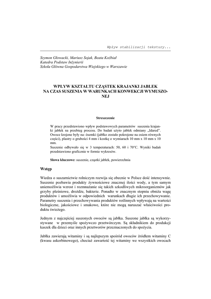Wpływ stabilizacji tekstury... Szymon Głowacki, Mariusz Sojak, Beata Koźbiał Katedra Podstaw Inżynierii Szkoła Główna Gospodarstwa Wiejskiego w Warszawie WPŁYW KSZTAŁTU CZĄSTEK KRAJANKI JABŁEK NA CZAS SUSZENIA W WARUNKACH KONWEKCJI WYMUSZONEJ Streszczenie W pracy przedstawiono wpływ podstawowych parametrów suszenia krajanki jabłek na przebieg procesu. Do badań użyto jabłek odmiany „Idared”. Owoce krojone były na: ósemki (jabłko zostało pokrojone na osiem równych części), plastry o grubości 4 mm i kostkę o wymiarach 10 mm x 10 mm x 10 mm. Suszenie odbywało się w 3 temperaturach: 50, 60 i 70°C. Wyniki badań przedstawiono graficznie w formie wykresów. Słowa kluczowe: suszenie, cząstki jabłek, powierzchnia Wstęp Wiedza o suszarnictwie rolniczym rozwija się obecnie w Polsce dość intensywnie. Suszenie pozbawia produkty żywnościowe znacznej ilości wody, a tym samym uniemożliwia wzrost i rozmnażanie się takich szkodliwych mikroorganizmów jak grzyby pleśniowe, drożdże, bakterie. Ponadto w znacznym stopniu obniża wagę produktów i umożliwia w odpowiednich warunkach długie ich przechowywanie. Parametry suszenia i przechowywania produktów roślinnych wpływają na wartości biologiczne, jakościowe i smakowe, które nie mogą naruszać właściwości produktu świeżego. Jednym z najczęściej suszonych owoców są jabłka. Suszone jabłka są wykorzystywane w przemyśle spożywczo przetwórczym. Są składnikiem do produkcji kaszek dla dzieci oraz innych przetworów przeznaczonych do spożycia. Jabłka zawierają witaminy i są najlepszym spośród owoców źródłem witaminy C (kwasu askorbinowego), chociaż zawartość tej witaminy we wszystkich owocach Agnieszka Wierzbicka jest dużo mniejsza niż w owocach jagodowych. Innymi związkami bardzo ważnymi ze względów dietetycznych są substancje pektynowe, których właściwości lecznicze mogą mieć większe znaczenie niż zawartość witaminy C [„Pomologia” 1976]. Ze względu na bardzo dużą zawartość wody około 10 kgH2O/kgs.s, czas konwekcyjnego suszenia krajanki jabłek jest długi. Teoretycznie można go skrócić, zwiększając temperaturę i prędkość czynnika suszącego. Jednakże ze względu na zawartość cukrów i możliwość jego karmelizacji w temperaturze powyżej 75°C, suszenie w tak podwyższonej temperaturze jest niewskazane, gdyż obniża jakość suszu. Stosowanie zmian prędkości przepływu czynnika suszącego również niesie ze sobą pewne ograniczenia. Mogą one wynikać z samej konstrukcji urządzenia suszarniczego oraz użytego osprzętu (wentylator, silnik), który posiada pewien zakres roboczy. Jak również nie można zwiększyć prędkości przepływu powietrza do dużej wartości gdyż groziłoby to usunięciem suszonego materiału z sit suszarki. Zatem jeszcze innym możliwym sposobem zwiększenia szybkości suszenia może być takie przygotowanie krajanki tak aby miara jej rozwiniętej powierzchni była największa. Celem pracy było zbadanie wpływu rozdrobnienia jabłek na przebieg ich suszenia w warunkach konwekcji wymuszonej, a więc w warunkach jakie występują w suszarkach przemysłowych. Badania polegały na wyznaczeniu zależności zmian zawartości wody w krajance jabłek od czasu od czasu ich suszenia. Metodyka badań Badania przeprowadzone zostały w laboratoryjnej suszarce tunelowej, znajdującej się w Laboratorium Suszarnictwa Katedry Podstaw Inżynierii SGGW w Warszawie. Metodyka badań została opracowana w oparciu o metodykę badań suszarek do suszenia owoców i warzyw [Kulik, Pabis 1989]. Metodyka badań obejmuje metody pomiarów parametrów procesu suszenia oraz dobór i zastosowanie aparatury kontrolno-pomiarowej do badań laboratoryjnych oaz innych badań mających związek z procesem suszenia. Każde doświadczenie powtórzono trzykrotnie. Pomiary zmian masy próbek przeprowadzone były w trzech różnych temperaturach powietrza: 1) 50°C, 2) 60°C, 3) 70°C; przy stałej prędkości czynnika suszącego v = 0,9 m/s i stałym obciążeniu sita wilgotnym materiałem 8 kg /m2. Wpływ stabilizacji tekstury... Do badań użyto jabłek odmiany „Idared” pochodzących z jednego źródła. Jabłka zostały odpowiednio rozdrobnione, kolejno: ósemki, plastry i kostka (10 mm × 10mm). Podczas trwania eksperymentu mierzono ubytki wody w suszonych jabłkach w czasie: przez pierwsze 2 godziny co 15 minut, następnie przez 3 godziny co 30 minut zaś dalej co 60 minut, do momentu gdy próbki były bliskie osiągnięcia równowagowej zawartości wody. Podczas trwania procesu suszenia kontrolowano stałość zadanych parametrów czynnika suszącego. Badany materiał został odpowiednio przygotowany i rozdrobniony: – ósemki – jabłko zostało pokrojone na osiem równych części – plastry – jabłka zostały pokrojone na krajalnicy w plastry o jednakowej grubości wynoszącej 4 mm. – kostka – jabłka zostały pokrojone w kostkę 10mm × 10mm. Wyniki badań W celu zrealizowania tematu badań przeprowadzono trzy powtórzenia pomiarów zawartości wody. Przedmiotem badań było jabłko krojone kolejno w kształcie „ósemek”, plastrów i kostki w temperaturze 50, 60 i 70°C, przy stałej prędkości przepływu powietrza w komorze suszenia v = 0,9 m/s i przy stałym obciążeniu sita wilgotnym materiałem wynoszącym 8 kg/m2. Rezultaty pomiarów zostały przedstawione graficznie. Rysunki od 1 do 3 przedstawiają wykresy zmian zawartości wody w czasie suszenia w krajance jabłek kolejno w temperaturze 50, 60 i 70°C a rysunki od 4 do 6 przedstawiają wpływ temperatury dla trzech różnych cząstek krajanki jabłek. Rysunek 1 przedstawia zmianę zawartości wody w czasie suszenia w krajance jabłek o różnych kształtach w temperaturze suszenia 50°C. Możemy zauważyć, że początkowa zawartość wody u zawierała się w przedziale od u0 = 6,4 do u0 = 7,2 kgH2O/kgs.s. Taka różnica może wynikać z niejednorodności mate