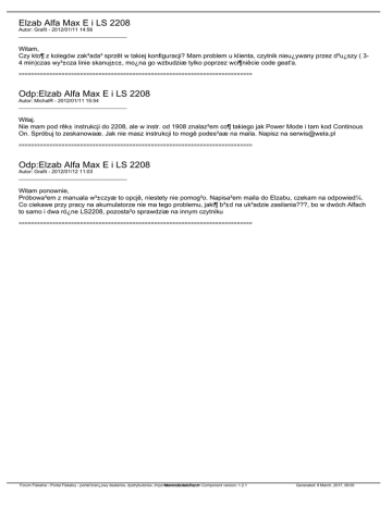 Elzab Alfa Max E i LS 2208 Autor: Grafit - 2012/01/11 14:56 _____________________________________ Witam, Czy kto¶ z kolegów zak³ada³ sprzêt w takiej konfiguracji? Mam problem u klienta, czytnik nieu¿ywany przez d³u¿szy ( 34 min)czas wy³±cza linie skanuj±c±, mo¿na go wzbudziæ tylko poprzez wci¶niêcie code geat'a. ============================================================================ Odp:Elzab Alfa Max E i LS 2208 Autor: MichalR - 2012/01/11 15:54 _____________________________________ Witaj. Nie mam pod rêk± instrukcji do 2208, ale w instr. od 1908 znalaz³em co¶ takiego jak Power Mode i tam kod Continous On. Spróbuj to zeskanowaæ. Jak nie masz instrukcji to mogê podes³aæ na maila. Napisz na [email protected] ============================================================================ Odp:Elzab Alfa Max E i LS 2208 Autor: Grafit - 2012/01/12 11:03 _____________________________________ Witam ponownie, Próbowa³em z manuala w³±czyæ to opcjê, niestety nie pomog³o. Napisa³em maila do Elzabu, czekam na odpowied¼. Co ciekawe przy pracy na akumulatorze nie ma tego problemu, jaki¶ b³±d na uk³adzie zasilania???, bo w dwóch Alfach to samo i dwa ró¿ne LS2208, pozosta³o sprawdziæ na innym czytniku ============================================================================ Forum Fiskalne - Portal Fiskalny - portal bran¿owy dealerów, dystrybutorów, importerów MamboBoard kas fiskalnych Forum Component version: 1.2.1 Generated: 8 March, 2017, 06:00