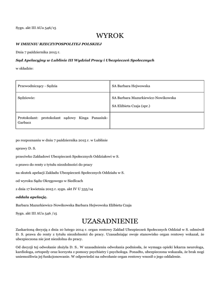 Sygn. akt III AUa 546/15 WYROK W IMIENIU RZECZYPOSPOLITEJ POLSKIEJ Dnia 7 października 2015 r. Sąd Apelacyjny w Lublinie III Wydział Pracy i Ubezpieczeń Społecznych w składzie: Przewodniczący - Sędzia SA Barbara Hejwowska Sędziowie: SA Barbara Mazurkiewicz-Nowikowska SA Elżbieta Czaja (spr.) Protokolant: protokolant sądowy Kinga PanasiukGarbacz po rozpoznaniu w dniu 7 października 2015 r. w Lublinie sprawy D. S. przeciwko Zakładowi Ubezpieczeń Społecznych Oddziałowi w S. o prawo do renty z tytułu niezdolności do pracy na skutek apelacji Zakładu Ubezpieczeń Społecznych Oddziału w S. od wyroku Sądu Okręgowego w Siedlcach z dnia 17 kwietnia 2015 r. sygn. akt IV U 335/14 oddala apelację. Barbara Mazurkiewicz-Nowikowska Barbara Hejwowska Elżbieta Czaja Sygn. akt III AUa 546 /15 UZASADNIENIE Zaskarżoną decyzją z dnia 10 lutego 2014 r. organ rentowy Zakład Ubezpieczeń Społecznych Oddział w S. odmówił D. S. prawa do renty z tytułu niezdolności do pracy. Uzasadniając swoje stanowisko organ rentowy wskazał, że ubezpieczona nie jest niezdolna do pracy. Od decyzji tej odwołanie złożyła D. S.. W uzasadnieniu odwołania podniosła, że wymaga opieki lekarza neurologa, kardiologa, ortopedy oraz korzysta z pomocy psychiatry i psychologa. Ponadto, ubezpieczona wskazała, że brak nogi uniemożliwia jej funkcjonowanie. W odpowiedzi na odwołanie organ rentowy wnosił o jego oddalenie. Wyrokiem z dnia 17 kwietnia 2015 roku Sąd Okręgowy w Siedlcach zmienił zaskarżoną decyzję i ustalił D. S. prawo do renty z tytułu częściowej niezdolności do pracy na okres od 1 stycznia 2014 roku do 31 grudnia 2016 roku. Podstawą wyroku były następujące ustalenia: D. S., urodzona (...), była uprawniona do renty z tytułu częściowej niezdolności do pracy od dnia 3 marca 2007 r. i świadczenie to było jej przyznawane okresowo, ostatnio na podstawie wyroku Sądu Okręgowego w Siedlcach z dnia 18 sierpnia 2011 r. wydanego w sprawie o sygn. akt IV U 858/10 do 31 grudnia 2013 r. W dniu 8 listopada 2013 r. ubezpieczona złożyła wniosek o ponowne ustalenie prawa do renty z tytułu niezdolności do pracy. Lekarz Orzecznik ZUS. stwierdził, że ubezpieczona nie jest niezdolna do pracy. W dniu 29 stycznia 2014 r. Komisja Lekarska ZUS orzekła, iż D. S. nie jest niezdolna do pracy. Decyzją z dnia 10 lutego 2014 r. Zakład Ubezpieczeń Społecznych Oddział w S. odmówił ubezpieczonej prawa do renty z tytułu niezdolności do pracy. Sąd dopuścił dowód z opinii biegłego lekarza neurologa, ortopedy, psychiatry i psychologa. Biegli sądowi w opinii rozpoznali u D. S. stan po amputacji urazowej podudzia prawego w 1/3, stan po przebytym urazie czaszkowomózgowym, bóle i zawroty głowy oraz organiczną chwiejność afektywną i stwierdzili, że ubezpieczona jest zdolna do pracy. Wobec zgłoszenia przez ubezpieczoną zastrzeżeń do opinii biegłych, Sąd dopuścił dowód z opinii innych biegłych z zakresu ortopedii i neurologii. Biegli rozpoznali u badanej stan po amputacji urazowej podudzia prawego w 1/3 w 2006 r. z zaprotezowaniem, stan po urazie czaszkowo-mózgowym z krwiakiem przymózgowym prawej półkuli mózgu w 2006 r., który był leczony zachowawczo oraz przewlekłe bóle i zawroty głowy typu napięciowego i naczyniowego. Na podstawie powyższego, ze względu na ogólny stan zdrowia D. S., biegli uznali, iż jest ona częściowo niezdolna do pracy w okresie od 1 stycznia 2014 r. do 31 grudnia 2016 r. Sąd uznał, że odwołanie jest uzasadnione. Zgodnie z art. 57 ustawy z dnia 17 grudnia 1998r.o emeryturach i rentach z Funduszu Ubezpieczeń Społecznych (j.t. Dz. U. z 2013 r. poz. 1440 ze zm.) renta z tytułu niezdolności do pracy przysługuje ubezpieczonemu, który jest niezdolny do pracy, ma wymagany okres składkowy i nieskładkowy, a niezdolność do pracy powstała w okresach określonych w ustawie, albo nie później niż w ciągu 18 miesięcy od ustania tych okresów. Analiza materiału dowodowego zebranego w sprawie wskazuje, że ubezpieczona spełnia wszystkie warunki zawarte w tym przepisie. D. S. otrzymywała bowiem rentę z tytułu częściowej niezdolności do pracy, ostatnio w okresie do dnia 31 grudnia 2013 r. Sporną okolicznością w niniejszej sprawie było, czy D. S. jest niezdolna do pracy. Aby ustalić powyższe okoliczności, Sąd przeprowadził dowód z opinii biegłych neurologa, ortopedy, psychiatry i psychologa. Z pierwszej opinii biegłych wywołanej w niniejszej sprawie wynika, że D. S. w 2006 r. doznała urazu wielonarządowego tj. urazu głowy z krwawieniem podpajęczynówkowym, skręcenia kręgosłupa szyjnego, urazu klatki piersiowej oraz złamania podudzia prawego. W wyniku wystąpienia zapalenia podudzia prawego, doszło do jej amputacji. Biegli stwierdzili u ubezpieczonej prawidłowo uformowany kikut bez zmian troficznych i bez przebarwień skóry w okolicy szczytu kikuta oraz, że na kikucie nie występują cechy zapalne, krwawienie ani wysięk. Zdaniem biegłych, stawy kolanowe D. S. są prawidłowej ruchomości oraz są stabilne. Biegli uznali, iż ubezpieczona porusza się sprawnie na zaprotezowanej kończynie oraz, że stan ortopedyczno-neurologiczny badanej jest dobry, za aktualny charakter i stopień nasilenia objawów psychopatologicznych nie powoduje niezdolności ubezpieczonej do pracy zgodnej z jej kwalifikacjami. Wobec faktu zgłoszenia przez ubezpieczoną zastrzeżeń do sporządzonej opinii, Sąd uznał za zasadne dopuszczenie dowodu z opinii innych biegłych: ortopedy i neurologa. Biegli K. K. i E. K. stwierdzili, iż kończyna dolna prawa ubezpieczonej tj. kikut podudzia jest wygojony, z modzelami oraz, że chód w protezie z utykaniem na kończynę dolną prawą jest wydolny. Biegli wskazali, iż dokonana u ubezpieczonej amputacja na trwale upośledziła funkcje podpórczą i lokomocyjną kończyny dolnej prawej. Biegli uznali, iż ubezpieczona jest częściowo niezdolna do pracy w okresie od 1 stycznia 