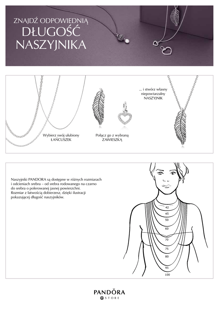 Znajdź odpowiednią DŁUGOŚĆ NASZYJNIKA ... i stwórz własny niepowtarzalny NASZYJNIK Wybierz swój ulubiony ŁAŃCUSZEK Połącz go z wybraną ZAWIESZKĄ Naszyjniki PANDORA są dostępne w różnych rozmiarach i odcieniach srebra – od srebra rodowanego na czarno do srebra o polerowanej jasnej powierzchni. Rozmiar z łatwością dobierzesz, dzięki ilustracji pokazującej długość naszyjników.