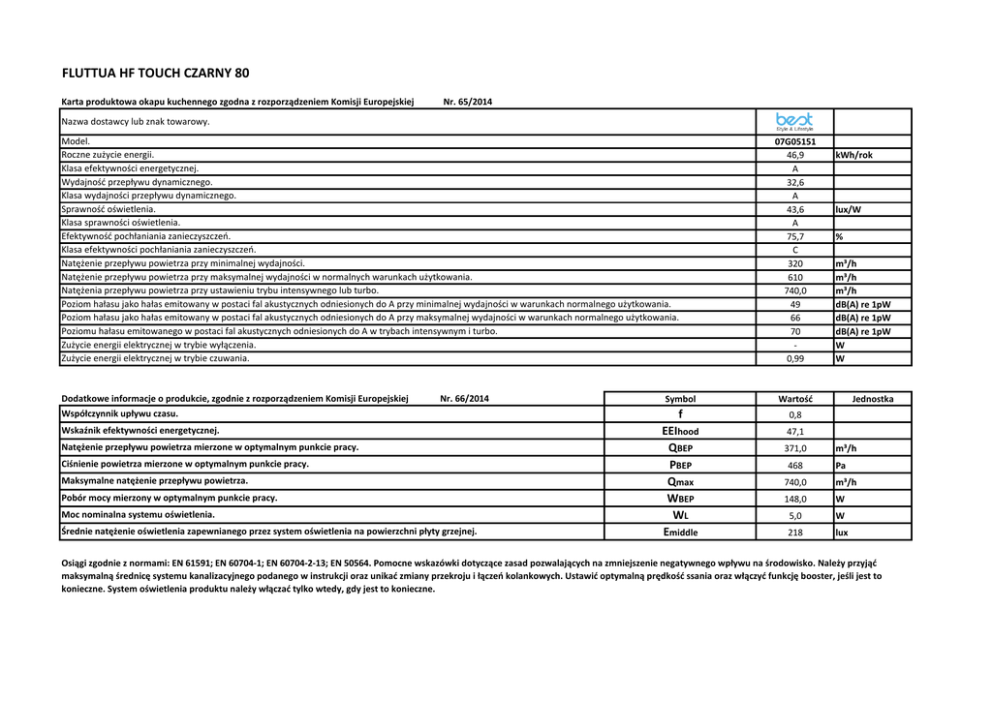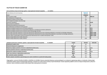 FLUTTUA HF TOUCH CZARNY 80 Karta produktowa okapu kuchennego zgodna z rozporządzeniem Komisji Europejskiej Nr. 65/2014 Nazwa dostawcy lub znak towarowy. Model. Roczne zużycie energii. Klasa efektywności energetycznej. Wydajność przepływu dynamicznego. Klasa wydajności przepływu dynamicznego. Sprawność oświetlenia. Klasa sprawności oświetlenia. Efektywność pochłaniania zanieczyszczeń. Klasa efektywności pochłaniania zanieczyszczeń. Natężenie przepływu powietrza przy minimalnej wydajności. Natężenie przepływu powietrza przy maksymalnej wydajności w normalnych warunkach użytkowania. Natężenia przepływu powietrza przy ustawieniu trybu intensywnego lub turbo. Poziom hałasu jako hałas emitowany w postaci fal akustycznych odniesionych do A przy minimalnej wydajności w warunkach normalnego użytkowania. Poziom hałasu jako hałas emitowany w postaci fal akustycznych odniesionych do A przy maksymalnej wydajności w warunkach normalnego użytkowania. Poziomu hałasu emitowanego w postaci fal akustycznych odniesionych do A w trybach intensywnym i turbo. Zużycie energii elektrycznej w trybie wyłączenia. Zużycie energii elektrycznej w trybie czuwania. Dodatkowe informacje o produkcie, zgodnie z rozporządzeniem Komisji Europejskiej Nr. 66/2014 Współczynnik upływu czasu. Wskaźnik efektywności energetycznej. Natężenie przepływu powietrza mierzone w optymalnym punkcie pracy. Ciśnienie powietrza mierzone w optymalnym punkcie pracy. Maksymalne natężenie przepływu powietrza. Pobór mocy mierzony w optymalnym punkcie pracy. Moc nominalna systemu oświetlenia. Średnie natężenie oświetlenia zapewnianego przez system oświetlenia na powierzchni płyty grzejnej. 07G05151 46,9 A 32,6 A 43,6 A 75,7 C 320 610 740,0 49 66 70 0,99 Symbol Wartość f 0,8 EEIhood QBEP PBEP Qmax WBEP WL Emiddle 47,1 371,0 468 kWh/rok lux/W % m³/h m³/h m³/h dB(A) re 1pW dB(A) re 1pW dB(A) re 1pW W W Jednostka m³/h Pa 740,0 m³/h 148,0 W 5,0 W 218 lux Osiągi zgodnie z normami: EN 61591; EN 60704-1; EN 60704-2-13; EN 50564. Pomocne wskazówki dotyczące zasad pozwalających na zmniejszenie negatywnego wpływu na środowisko. Należy przyjąć maksymalną średnicę systemu kanalizacyjnego podanego w instrukcji oraz unikać zmiany przekroju i łączeń kolankowych. Ustawić optymalną prędkość ssania oraz włączyć funkcję booster, jeśli jest to konieczne. System oświetlenia produktu należy włączać tylko wtedy, gdy jest to konieczne.
