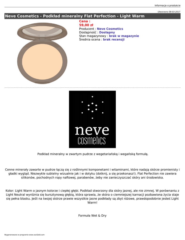 Informacje o produkcie Utworzono 08-03-2017 Neve Cosmetics - Podkład mineralny Flat Perfection - Light Warm Cena : 59,00 zł Producent : Neve Cosmetics Dostępność : Dostępny Stan magazynowy : brak w magazynie Średnia ocena : brak recenzji Podkład mineralny w zwartym pudrze z wegetariańską i wegańską formułą. Cenne minerały zawarte w pudrze łączą się z roślinnymi komponetami i witaminami, które nadają skórze promienisty i gładki wygląd. Niezwykle subtelny wizualnie jak i w dotyku (dotknij, a się przekonasz!). Flat Perfection nie zawiera silikonów, pochodnych ropy naftowej, parabenów, żeby nie zanieczyszczać skóry ani środowiska. Kolor: Light Warm o jasnym kolorze i ciepłej głębi. Podkład stworzony dla skóry jasnej, ale nie zimnej. W porównaniu z Light Neutral wyróżnia się bursztynową głębią, która sprawia, że skóra o ciemniejszej karnacji pozbawiona życia staje się pełna blasku. Jeśli na twojej skórze prawie wszystkie jasne podkłady są zbyt różowe, prawdopodobnie jesteś Light Warm! Formuła Wet & Dry Wygenerowano w programie www.oscGold.com Doskonały dla wegetarian i wegan: nie zawiera składników zwierzęcych, ani pochodzenia zwierzęcego. Lip safe Aksamitne wykończenie: matowe, ale żywe. Pojemność: Pojemnik z lusterkiem zawiera 8 g podkładu w zasobniku o średnikcy 5,8 cm. Zastosowanie: twarz √ bez silikonów, parabenów i pochodnych ropy naftowej √ formuła wet & dry, maksymalna uniwersalność zastosowania √ całkowicie Made in Italy √ cruelty free: nietestowany na zwierzętach! Sprawdzony przez make up artists Data przydatności: 12 miesięcy od otwarcia. Składniki: Talc, Mica, Silica, Titanium Dioxide (Titanium Dioxide), Octyldodecyl Stearoyl Stearate, Lauroyl Lysine, Zinc Stearate, Cetearyl Ethylhexanoate, Caprylyl Glycol, Aluminum Hydroxide, Retinyl Palmitate, Tocopheryl Acetate, CI 77491 (Iron Oxide), CI 77492 (Iron Oxide), CI 77499 (Iron Oxide).