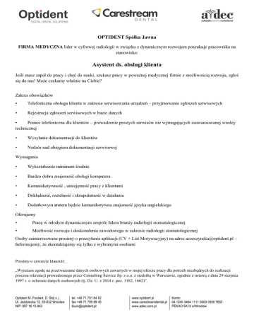 OPTIDENT Spółka Jawna FIRMA MEDYCZNA lider w cyfrowej radiologii w związku z dynamicznym rozwojem poszukuje pracownika na stanowisko: Asystent ds. obsługi klienta Jeśli masz zapał do pracy i chęć do nauki, szukasz pracy w poważnej medycznej firmie z możliwością rozwoju, zgłoś się do nas! Może czekamy właśnie na Ciebie? Zakres obowiązków • Telefoniczna obsługa klienta w zakresie serwisowania urządzeń – przyjmowanie zgłoszeń serwisowych • Rejestracja zgłoszeń serwisowych w bazie danych • Pomoc telefoniczna dla klientów – prowadzenie prostych serwisów nie wymagających zaawansowanej wiedzy technicznej • Wysyłanie dokumentacji do klientów • Nadzór nad obiegiem dokumentacji serwisowej Wymagania • Wykształcenie minimum średnie • Bardzo dobra znajomość obsługi komputera • Komunikatywność , umiejętność pracy z klientami • Dokładność, rzetelność i skrupulatność w działaniu • Dodatkowym atutem będzie komunikatywna znajomość języka angielskiego Oferujemy • Pracę w młodym dynamicznym zespole lidera branży radiologii stomatologicznej • Możliwość rozwoju i doskonalenia zawodowego w zakresie radiologii stomatologicznej Osoby zainteresowane prosimy o przesyłanie aplikacji (CV + List Motywacyjny) na adres [email protected] – Informujemy, że skontaktujemy się tylko z wybranymi osobami Prosimy o zawarcie klauzuli: „Wyrażam zgodę na przetwarzanie danych osobowych zawartych w mojej ofercie pracy dla potrzeb niezbędnych do realizacji procesu rekrutacji prowadzonego przez Consulting Service Sp. z o.o. z siedzibą w Warszawie, zgodnie z ustawą z dnia 29 sierpnia 1997 r. o ochronie danych osobowych (tj. Dz. U. z 2014 r. poz. 1182, 1662)”. Optident M. Foubert, D. Stój s .j Ul. Jeździecka 12, 53-032 Wrocław NIP: 897 16 15 843 tel. +48 71 781 84 62 fax +48 71 799 89 45 [email protected] www.optident.pl www.carestreamdental.pl www.adec.com.pl Konto: 04 1240 3464 1111 0000 3558 7653 PEKAO SA III o/Wrocław