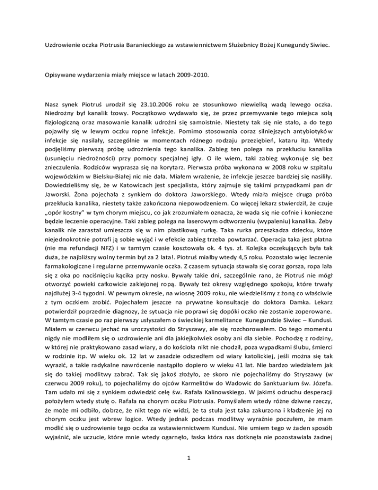 Uzdrowienie oczka Piotrusia Baranieckiego za wstawiennictwem Służebnicy Bożej Kunegundy Siwiec. Opisywane wydarzenia miały miejsce w latach 2009-2010. Nasz synek Piotruś urodził się 23.10.2006 roku ze stosunkowo niewielką wadą lewego oczka. Niedrożny był kanalik łzowy. Początkowo wydawało się, że przez przemywanie tego miejsca solą fizjologiczną oraz masowanie kanalik udrożni się samoistnie. Niestety tak się nie stało, a do tego pojawiły się w lewym oczku ropne infekcje. Pomimo stosowania coraz silniejszych antybiotykó w infekcje się nasilały, szczególnie w momentach różnego rodzaju przeziębieo, kataru itp. Wtedy podjęliśmy pierwszą próbę udrożnienia tego kanalika. Zabieg ten polega na przekłuciu kanalika (usunięciu niedrożności) przy pomocy specjalnej igły. O ile wiem, taki zabieg wykonuje się bez znieczulenia. Rodziców wyprasza się na korytarz. Pierwsza próba wykonana w 2008 roku w szpitalu wojewódzkim w Bielsku-Białej nic nie dała. Miałem wrażenie, że infekcje jeszcze bardziej się nasiliły. Dowiedzieliśmy się, że w Katowicach jest specjalista, który zajmuje się takimi przypadkami pan dr Jaworski. Żona pojechała z synkiem do doktora Jaworskiego. Wtedy miała miejsce druga próba przekłucia kanalika, niestety także zakooczona niepowodzeniem. Co więcej lekarz stwierdził, że czuje „opór kostny” w tym chorym miejscu, co jak zrozumiałem oznacza, że wada się nie cofnie i konieczne będzie leczenie operacyjne. Taki zabieg polega na laserowym odtworzeniu (wypaleniu) kanalika. Żeby kanalik nie zarastał umieszcza się w nim plastikową rurkę. Taka rurka przeszkadza dziecku, które niejednokrotnie potrafi ją sobie wyjąd i w efekcie zabieg trzeba powtarzad. Operacja taka jest płatna (nie ma refundacji NFZ) i w tamtym czasie kosztowała ok. 4 tys. zł. Kolejka oczekujących była tak duża, że najbliższy wolny termin był za 2 lata!. Piotruś miałby wtedy 4,5 roku. Pozostało więc leczenie farmakologiczne i regularne przemywanie oczka. Z czasem sytuacja stawała się coraz gorsza, ropa lała się z oka po naciśnięciu kącika przy nosku. Bywały takie dni, szczególnie rano, że Piotruś nie mógł otworzyd powieki całkowicie zaklejonej ropą. Bywały też okresy względnego spokoju, które trwały najdłużej 3-4 tygodni. W pewnym okresie, na wiosnę 2009 roku, nie wiedzieliśmy z żoną co właściwie z tym oczkiem zrobid. Pojechałem jeszcze na prywatne konsultacje do doktora Damka. Lekarz potwierdził poprzednie diagnozy, że sytuacja nie poprawi się dopóki oczko nie zostanie zoperowane. W tamtym czasie po raz pierwszy usłyszałem o świeckiej karmelitance Kunegundzie Siwiec – Kundusi. Miałem w czerwcu jechad na uroczystości do Stryszawy, ale się rozchorowałem. Do tego momentu nigdy nie modliłem się o uzdrowienie ani dla jakiejkolwiek osoby ani dla siebie. Pochodzę z rodziny, w której nie praktykowano zasad wiary, a do kościoła nikt nie chodził, poza wypadkami ślubu, śmierci w rodzinie itp. W wieku ok. 12 lat w zasadzie odszedłem od wiary katolickiej, jeśli można się tak wyrazid, a takie radykalne nawrócenie nastąpiło dopiero w wieku 41 lat. Nie bardzo wiedziałem jak się do takiej modlitwy zabrad. Tak się jakoś złożyło, ze skoro nie pojechaliśmy do Stryszawy (w czerwcu 2009 roku), to pojechaliśmy do ojców Karmelitów do Wadowic do Sanktuarium św. Józefa. Tam udało mi się z synkiem odwiedzid celę św. Rafała Kalinowskiego. W jakimś odruchu desperacji położyłem wtedy stułę o. Rafała na chorym oczku Piotrusia. Pomyślałem wtedy różne dziwne rzeczy, że może mi odbiło, dobrze, że nikt tego nie widzi, że ta stuła jest taka zakurzona i kładzenie jej na chorym oczku jest wbrew logice. Wtedy jednak podczas modlitwy wyraźnie poczułem, że mam modlid się o uzdrowienie tego oczka za wstawiennictwem Kundusi. Nie umiem tego w żaden sposób wyjaśnid, ale uczucie, które mnie wtedy ogarnęło, łaska która nas dotknęła nie pozostawiała żadnej 1 wątpliwości. Od tego momentu, po powrocie do domu zacząłem modlid się rano i wieczorem „o uzdrowienie oczka Piotrusia” za wstawiennictwem Służebnicy Bożej Kunegundy Siwiec. Po kilku dniach, mniej więcej 3 albo 4 infekcja ustąpiła całkowicie. Początkowo nie zrobiło to na mnie w zasadzie żadnego wrażenia, bo podobne polepszenia sytuacji już bywały i infekcja zawsze wracała najpóźniej po kilku tygodniach. Tymczasem mijały miesiące i oczko było czyste. Codziennie rano sprawdzałem stan tego oczka i było ono czyste. Mniej więcej po 6-ciu miesiącach moja żona zapytała kiedyś wieczorem „Czy to nie dziwne, że Piotruś ma zdrowe oczko tak długo? No właśnie! – odpowiedziałem”. Postanowiłem czekad minimum cały rok żeby na pewno przekonad się, że uzdrowienie to jest trwałe, żeby zobaczyd czy oczko będzie zdrowe nawet podczas katarów, przeziębieo, albo kiedy dziecko dotknie czasem przypadkowo brudną rączką oka, itp. Tak więc sprawdzam je codziennie, a oczko jest czyste po dziś dzieo! Już ok. 1,5 roku od czasu kiedy w modlitwie zwróciłem się do Kundusi Siwiec. Właściwie na tym można by zakooczyd to świadectwo gdyby nie inna chyba jeszcze ważniejsza rzecz – przemiana życia całej naszej rodziny. Przyznam, że czuję się jak człowiek, który mimo całej małości i biedy swojej wiary dotknięty został promieniem łaski Boga Miłosiernego , Boga Żywego. Czy tak mógł się czud ów „drugi uczeo”, który wszedł do pustego grobu Paoskiego i jak mówi pismo „ujrzał i uwierzył”? Od czasu tego uzdrowienia zauważamy z żoną głęboką przemianę życia duchowego całej naszej rodziny, a nawet naszego otoczenia. W czerwcu 2010 roku byliśmy całą rodziną w Stryszawie żeby podziękowad Kundusi za wszelkie łaski, a jest ich już wielka ilośd, otrzymywanych za jej wstawiennictwem. Beata i Tomasz Baranieccy Pisarzowice luty’2011 rok. 2