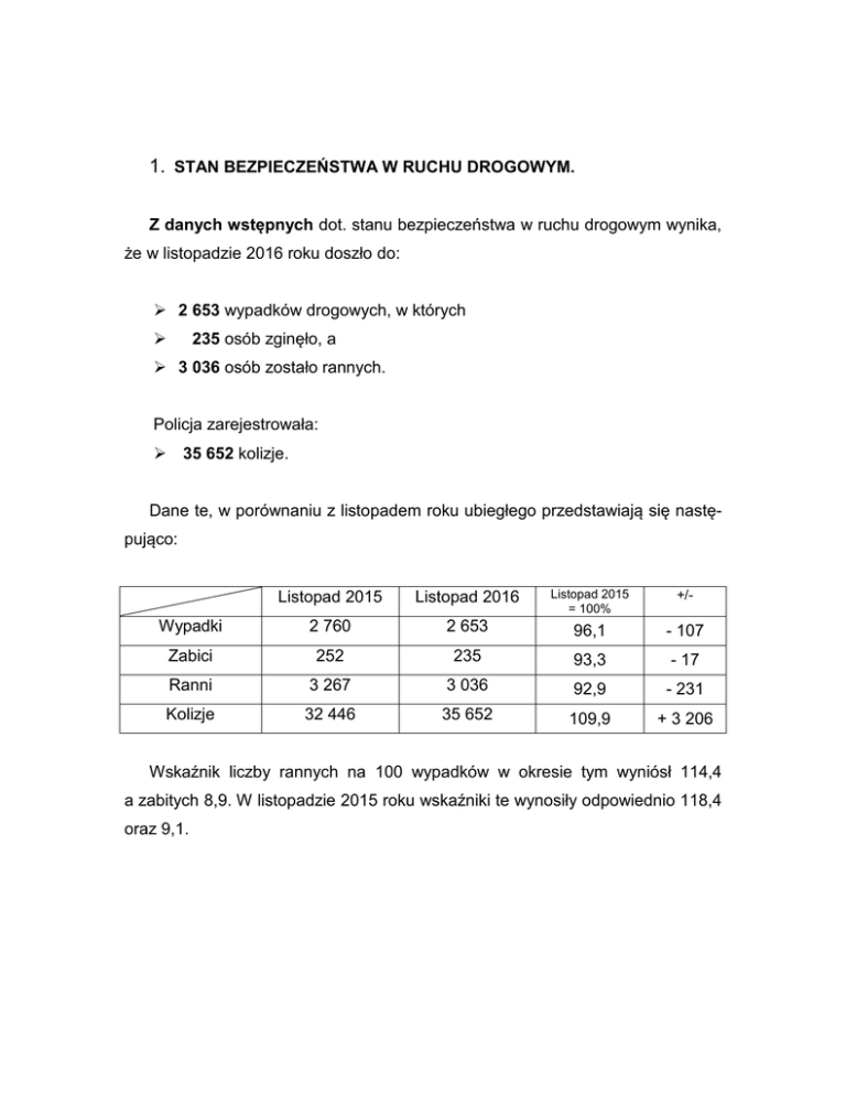 1. STAN BEZPIECZEŃSTWA W RUCHU DROGOWYM. Z danych wstępnych dot. stanu bezpieczeństwa w ruchu drogowym wynika, że w listopadzie 2016 roku doszło do: 2 653 wypadków drogowych, w których 235 osób zginęło, a 3 036 osób zostało rannych. Policja zarejestrowała: 35 652 kolizje. Dane te, w porównaniu z listopadem roku ubiegłego przedstawiają się następująco: Listopad 2015 Listopad 2016 Listopad 2015 = 100% +/- Wypadki 2 760 2 653 96,1 - 107 Zabici 252 235 93,3 - 17 Ranni 3 267 3 036 92,9 - 231 Kolizje 32 446 35 652 109,9 + 3 206 Wskaźnik liczby rannych na 100 wypadków w okresie tym wyniósł 114,4 a zabitych 8,9. W listopadzie 2015 roku wskaźniki te wynosiły odpowiednio 118,4 oraz 9,1. STAN BEZPIECZEŃSTWA W RUCHU DROGOWYM W LISTOPADZIE 2016 ROKU W UKŁADZIE WOJEWÓDZTW L.p. Województwo Zabici Ranni XI’2015 XI’2016 % XI’2015 XI’2016 % XI’2015 XI’2016 % 208 182 -12,5 14 11 -21,4 279 225 -19,4 1. Dolnośląskie 2. 79 72 -8,9 15 15 - 85 70 -17,6 3. Kujawsko – pomorskie Lubelskie 107 116 +8,4 16 14 -12,5 120 136 +13,3 4. Lubuskie 31 46 +48,4 0 7 - 47 45 -4,3 5. Łódzkie 347 341 -1,7 20 16 -20,0 416 399 -4,1 6. Małopolskie 346 287 -17,1 26 12 -53,8 390 322 -17,4 7. 183 160 -12,6 27 26 -3,7 201 181 -10,0 8. Mazowieckie (bez KSP) Opolskie 68 62 -8,8 8 10 +25,0 71 66 -7,0 9. Podkarpackie 125 133 +6,4 15 16 +6,7 147 151 +2,7 10. Podlaskie 62 43 -30,6 6 9 +50,0 73 50 -31,5 11. Pomorskie 207 229 +10,6 10 9 -10,0 245 260 +6,1 12. Śląskie 303 275 -9,2 26 17 -34,6 390 312 -20,0 13. Świętokrzyskie 125 102 -18,4 14 15 +7,1 160 117 -26,9 109 123 +12,8 10 17 +70,0 130 151 +16,2 15. Warmińsko – mazurskie Wielkopolskie 192 201 +4,7 30 17 -43,3 206 234 +13,6 16. Zachodniopomorskie 115 109 -5,2 4 11 +175,0 136 116 -14,7 17. KSP 153 172 +12,4 11 13 +18,2 171 201 +17,5 2 760 2 653 - 3,9 252 235 - 6,7 3 267 3 036 - 7,1 14. * Ogółem * Wypadki Dane obejmują Komendę Stołeczną Policji wraz z podległymi jej Komendami Powiatowymi Policji. Dla samego m.st. Warszawa dane są następujące: WY- PADKI –111, ZABICI –2, RANNI –131. W listopadzie 2016 roku, w porównaniu z rokiem ubiegłym, zanotowano spadek liczby: wypadków drogowych o 107 (-3,9%) oraz osób zabitych o 17 (-6,7%), oraz liczby osób rannych o 231 osób (-7,1%). Spadek liczby wypadków nastąpił w 10 województwach, największy na terenie woj. podlaskiego (-30,6%). Wzrost nastąpił w 7 województwach, największy w woj. lubuskim (+48,4%). Spadek liczby zabitych nastąpił w 8 województwach, największy: na terenie woj. małopolskiego (-53,8%). Wzrost zanotowano w 8 województwach, największy w woj. zachodniopomorskim (+175%). Województwa: kujawsko- pomorskie na poziomie roku ubiegłego. Spadek liczby rannych nastąpił w 11 województwach, największy na terenie woj. podlaskiego (-31,5%). Wzrost nastąpił w 6 województwach, największy na terenie działania KSP (+17,5%). OFIARY ŚMIERTELNE W LISTOPADZIE 2016 ROKU. Zabici ogółem Zabici XI’2015 Województwo L.p. XI’2016 zgony zgony w zgony zgony w n/m szpitalu n/m szpitalu XI’2015 XI’2016 Wzrost/ spadek 2015= 100% 1. Dolnośląskie 11 3 7 4 14 11 -3 78,6 2. Kujawsko – pomorskie 11 4 11 4 15 15 - - 3. Lubelskie 8 8 11 3 16 14 -2 87,5 4. Lubuskie - - 7 0 0 7 +7 - 5. Łódzkie 17 3 10 6 20 16 -4 80,0 6. Małopolskie 20 6 6 6 26 12 -14 46,2 7. 17 10 22 4 27 26 -1 96,3 8. Mazowieckie (bez KSP) Opolskie 5 3 7 3 8 10 +2 125,0 9. Podkarpackie 10 5 9 7 15 16 +1 106,7 10. Podlaskie 5 1 8 1 6 9 +3 150,0 11. Pomorskie 6 4 4 5 10 9 -1 90,0 12. Śląskie 15 11 10 7 26 17 -9 65,4 13. Świętokrzyskie 10 4 10 5 14 15 +1 107,1 14. Warmińsko-mazurskie 9 1 13 4 10 17 +7 170,0 15. Wielkopolskie 20 10 10 7 30 17 -13 56,7 16. Zachodniopomorskie 2 2 7 4 4 11 +7 275,0 17. KSP 8 3 10 3 11 13 +2 118,2 174 78 162 73 252 235 - 17 93,3 Ogółem . WYPADKI ZE SKUTKIEM ŚMIERTELNYM W PAŹDZIERNIKU 2016 R. Dolnośląskie Zgony na miejscu zdarzenia Wypadki Województwa Zgony w ciągu 30 dni 2015 r. 2016 r. 2015 r. 2016 r. 2015 r. 2016 r. 13 27 11 17 5 10 Kujawsko – pomorskie Lubelskie 9 19 10 18 3 5 26 17 24 17 3 3 Lubuskie 2 5 1 4 1 3 Łódzkie 25 15 21 12 5 3 Małopolskie 12 20 8 15 4 5 32 24 33 25 5 4 5 9 4 6 2 3 Podkarpackie 9 15 4 10 6 8 Podlaskie 10 10 9 12 3 1 Pomorskie 16 12 11 8 7 4 Śląskie 26 19 13 19 14 4 Świętokrzyskie 7 14 2 12 6 2 Warmińsko – mazurskie Wielkopolskie 10 15 8 11 2 4 18 26 11 18 9 10 Zachodniopomorskie 12 13 7 12 5 3 KSP 13 14 8 10 7 5 245 274 185 226 87 77 Mazowieckie (bez KSP) Opolskie Ogółem WYPADKI DROGOWE ZE SKUTKIEM ŚMIERTELNYM W PAŹDZIERNIKU 2016 R.* Województwo Wypadki Zabici 2015 r. 2016 r. Dynamika 2015 r. 2016 r. Dynamika Dolnośląskie 13 27 207,7 16 27 168,8 Kujawsko – pomorskie 9 19 211,1 13 23 176,9 Lubelskie 26 17 65,4 27 20 74,1 Lubuskie 2 5 250,0 2 7 350,0 Łódzkie 25 15 60,0 26 15 57,7 Małopolskie 12 20 166,7 12 20 166,7 Mazowieckie(bez KSP) Opolskie 32 24 75,0 38 29 76,3 5 9 180,0 6 9 150,0 Podkarpackie 9 15 166,7 10 18 180,0 Podlaskie 10 10 100,0 12 13 108,3 Pomorskie 16 12 75,0 18 12 66,7 Śląskie 26 19 73,1 27 23 85,2 Świętokrzyskie 7 14 200,0 8 14 175,0 Warmińsko – mazurskie Wielkopolskie 10 15 150,0 10 15 150,0 18 26 144,4 20 28 140,0 Zachodniopomorskie 12 13 108,3 12 15 125,0 KSP 13 14 107,7 15 15 100,0 245 274 111,8 272 303 111,4 Ogółem * dane SEWIK na dzień 05.12.2016 r. 2. STAN BEZPIECZEŃSTWA W RUCHU DROGOWYM W OKRESIE STYCZEŃ – LISTOPAD 2016 ROKU. Wg danych wstępnych, w okresie od stycznia do listopada 2016 roku doszło do: 30 627 wypadków drogowych, w których 2 710 osób zginęło, a 37 119 osób odniosło obrażenia ciała. Policji zgłoszono: 365 454 kolizje Dane te w porównaniu z analogicznym okresem roku poprzedniego wykazują: I- XI’2015 I- XI’2016 I-XI’2015 = 100% +/- Wypadki 29 975 30 627 102,2 + 652 Zabici 2 615 2 710 103,6 + 95 Ranni 36 400 37 119 102,0 + 719 Kolizje 329 025 365 454 111,1 + 36 429 Wskaźnik liczby rannych na 100 wypadków w tym okresie wyniósł 12