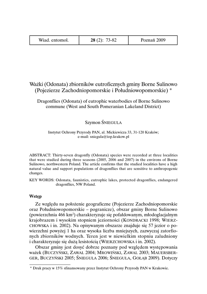 Wiad. entomol. 28 (2): 73-82 Poznań 2009 Ważki (Odonata) zbiorników eutroficznych gminy Borne Sulinowo (Pojezierze Zachodniopomorskie i Południowopomorskie) * Dragonflies (Odonata) of eutrophic waterbodies of Borne Sulinowo commune (West and South Pomeranian Lakeland District) Szymon ŚNIEGULA Instytut Ochrony Przyrody PAN, al. Mickiewicza 33, 31-120 Kraków; e-mail: [email protected] ABSTRACT: Thirty-seven dragonfly (Odonata) species were recorded at three localities that were studied during three seasons (2005, 2006 and 2007) in the environs of Borne Sulinowo, northwestern Poland. The article confirms that the studied localities have a high natural value and support populations of dragonflies that are sensitive to anthropogenic changes. KEY WORDS: Odonata, faunistics, eutrophic lakes, protected dragonflies, endangered dragonflies, NW Poland. Wstęp Ze względu na położenie geograficzne (Pojezierze Zachodniopomorskie oraz Południowopomorskie – pogranicze), obszar gminy Borne Sulinowo (powierzchnia 466 km2) charakteryzuje się pofałdowanym, młodoglacjalnym krajobrazem i wysokim stopniem jeziorności (KONDRACKI 1998; WIERZCHOWSKA i in. 2002). Na opisywanym obszarze znajduje się 57 jezior o powierzchni powyżej 1 ha oraz wysoka liczba mniejszych, zazwyczaj zatorfionych zbiorników wodnych. Teren jest w niewielkim stopniu zaludniony i charakteryzuje się dużą lesistością (WIERZCHOWSKA i in. 2002). Obszar gminy jest dosyć dobrze poznany pod względem występowania ważek (BUCZYŃSKI, ZAWAL 2004; MROWIŃSKI, ZAWAL 2003; MAUERSBERGER, BUCZYŃSKI 2005; ŚNIEGULA 2006; ŚNIEGULA, GOŁĄB 2009). Dotyczy * Druk pracy w 15% sfinansowany przez Instytut Ochrony Przyrody PAN w Krakowie. 74 SZ. ŚNIEGULA to jednak w przeważającej mierze owadów zasiedlających zbiorniki torfowisk sfagnowych oraz otoczonych płem. Znacznie mniej wiadomo o ważkach zbiorników eutroficznych. W niniejszym opracowaniu przedstawiono skład gatunkowy ważek żyjących w dwóch jeziorach eutroficznych położonych w północno-zachodniej części gminy i zespole małych zbiorników eutroficznych (ZMZE), zlokalizowanych w jej południowej części (obszar byłego poligonu radzieckiego Borne Sulinowo), wzbogacając tym samym wiedzę o ważkach jezior Pojezierza Zachodniopomorskiego Metody i materiał Badania prowadzone były w okresie od maja do września na trzech stanowiskach: (1) Jezioro Rakowskie – 12 kontroli w sezonach: 2005, 2006 i 2007; (2) Jezioro Lubicko Małe – 9 kontroli w sezonach: 2006 i 2007 oraz (3) Zespół małych zbiorników eutroficznych (ZMZE) – 9 kontroli w sezonach: 2006 i 2007. Opierały się one przede wszystkim na odłowach imagines przy pomocy siatki entomologicznej (złowione osobniki wypuszczano po oznaczeniu), obserwacjach imagines (zwracano szczególną uwagę na sposób zachowania się imagines) oraz na zbieraniu wylinek z roślinności szuwarowej i przybrzeżnej na wyznaczonych wcześniej stanowiskach różniących się od siebie składem gatunkowym flory oraz pokryciem dna. Ogółem zebrano 1064 wylinki. Materiał przechowywany jest na sucho w kolekcji autora. Opis stanowisk Przy opisie zastosowano skróty: wys. – wysokość lustra wody n.p.m. (według FILIPIAKA, RACZYŃSKIEGO 2000), pow. – powierzchnia; gł. – głębokość maksymalna; widz. – widzialność krążka Secchi’ego (data pomiarów: 25 maja 2007 – dane własne). 1. Jezioro Rakowskie (UTM: WV94). Śródleśne, przepływowe, eutroficzne jezioro położone 750 m na północny-wschód od wsi Rakowo, z pewnymi cechami mezotrofii (patrz niżej). Wys. – 130,9; pow. – 17 ha (1000×170 m); gł. – 12,2 m; widz. – 4,5 m. Woda przejrzysta, charakteryzująca się brakiem zakwitów wiosennych i jesiennych. Dno piaszczysto-kamienisto-żwirowe, miejscami zamulone (zwłaszcza w północno-zachodniej części jeziora) lub pokryte detrytusem. Zbiornik prawie w całości otoczony wąskim pasem olch (Alnus glutinosa GAERTN.), dalej lasem sosnowym. Po południowo-wschodniej stronie, na wysokości odpływu, brzeg o długości 30 m jest pozbawiony drzew i graniczy bezpośrednio z łąką. Po północnozachodniej stronie (wysokość wypływu) otoczony jest pasem szuwaru o szerokość do 4 m, złożonym z: Phragmites australis (CAV.) TRIN. ex WAŻKI ZBIORNIKÓW EUTROFICZNYCH GMINY BORNE SULINOWO 75 S TEUD ., Carex sp. , Typha sp., Iris pseudacorus L., Glyceria maxima (HARTM.) HOLMB., Lysimachia thyrsiflora L. i Equisetum fluviatile L. W kilku innych miejscach brzeg zbiornika przerośnięty jest wąskim pasem albo P. australis, albo Carex sp. i Eleocharis palustris (L.) ROEM. et SCHULT. Roślinność zanurzona: po północno-zachodniej i południowowschodniej stronie jeziora, wypłycenia gęsto przerośnięte Myriophyllum sp. i Ceratophyllum demersum L. oraz punktowo Stratiotes aloides L., która w czasie wiosny nie wypływa na powierzchnię wody. W jeziorze żyje liczna populacja ryb. 2. Jezioro Lubicko Małe (WV94). Eutroficzny, przepływowy zbiornik 2 km na wschód od wsi Rakowo. Jezioro otoczone jest wąskim pasem Alnus glutinosa, dalej drzewami liściastym z dużym udziałem buka. Wys. – 130,4; pow. – 8,4 ha (300×280 m); gł. – 8 m; widz. – 4,25 m. Według FILIPIAKA i RACZYŃSKIEGO (2000) zbiornik zaliczany jest do jezior linowo -szczupakowych. Woda przejrzysta, charakteryzująca się brakiem zakwitów wiosennych i jesiennych. Dno piaszczyste, miejscami zamulone (szczególnie po północnej i południowo-wschodniej stronie zbiornika, przy odpływie i wypływie) lub pokryte detrytusem. Brzeg południowowschodni zatoki o powierzchni ok. 50×50 m silnie przerośnięty szuwarem i roślinnością przybrzeżną: Carex sp. Phragmites australis, Equisetum fluviatile, Sparganium sp., Lysimachia thyrsiflora L., miejscami: Shoenoplectus lacustris (L.) PALLA i Rumex hudrolapathum HUDS. Wzdłuż brzegu, w kilku pozostałych miejscach, szuwar turzycowy (Carex sp.). Około 2/3 powierzchni wody południowo-wschodniej