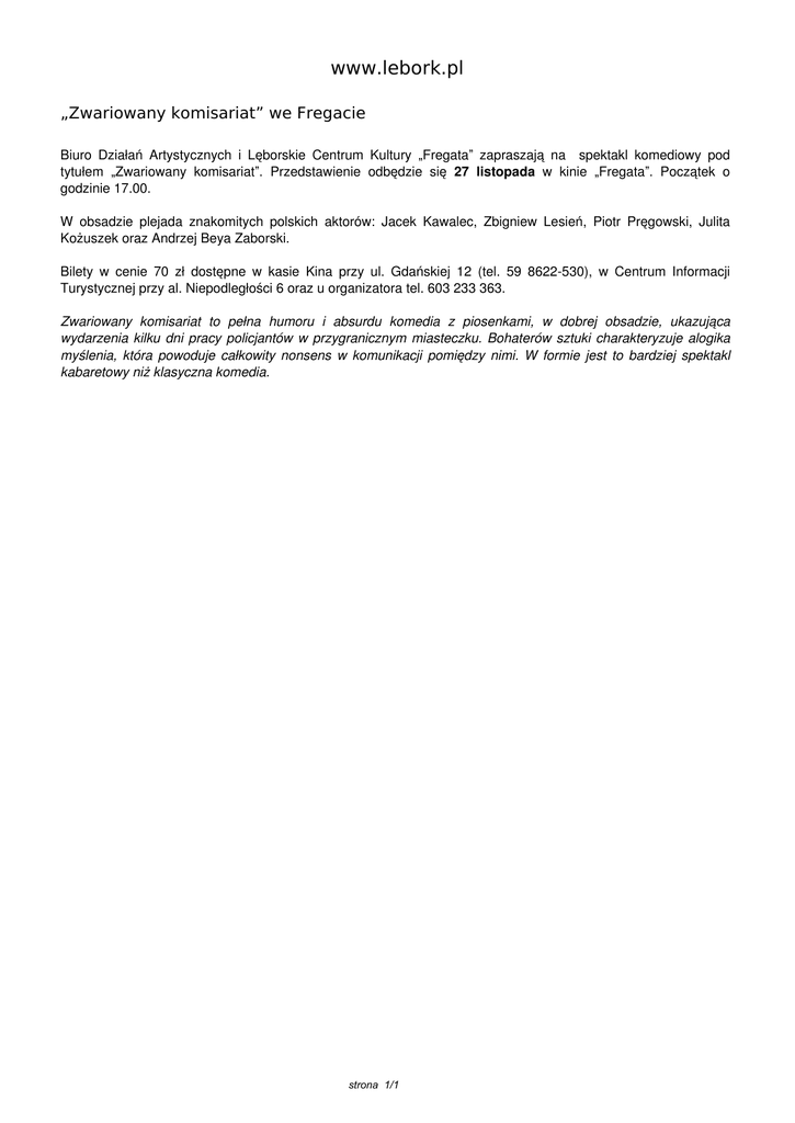 www.lebork.pl „Zwariowany komisariat” we Fregacie Biuro Działań Artystycznych i Lęborskie Centrum Kultury „Fregata” zapraszają na spektakl komediowy pod tytułem „Zwariowany komisariat”. Przedstawienie odbędzie się 27 listopada w kinie „Fregata”. Początek o godzinie 17.00. W obsadzie plejada znakomitych polskich aktorów: Jacek Kawalec, Zbigniew Lesień, Piotr Pręgowski, Julita Kożuszek oraz Andrzej Beya Zaborski. Bilety w cenie 70 zł dostępne w kasie Kina przy ul. Gdańskiej 12 (tel. 59 8622-530), w Centrum Informacji Turystycznej przy al. Niepodległości 6 oraz u organizatora tel. 603 233 363. Zwariowany komisariat to pełna humoru i absurdu komedia z piosenkami, w dobrej obsadzie, ukazująca wydarzenia kilku dni pracy policjantów w przygranicznym miasteczku. Bohaterów sztuki charakteryzuje alogika myślenia, która powoduje całkowity nonsens w komunikacji pomiędzy nimi. W formie jest to bardziej spektakl kabaretowy niż klasyczna komedia. strona 1/1 Powered by TCPDF (www.tcpdf.org)
