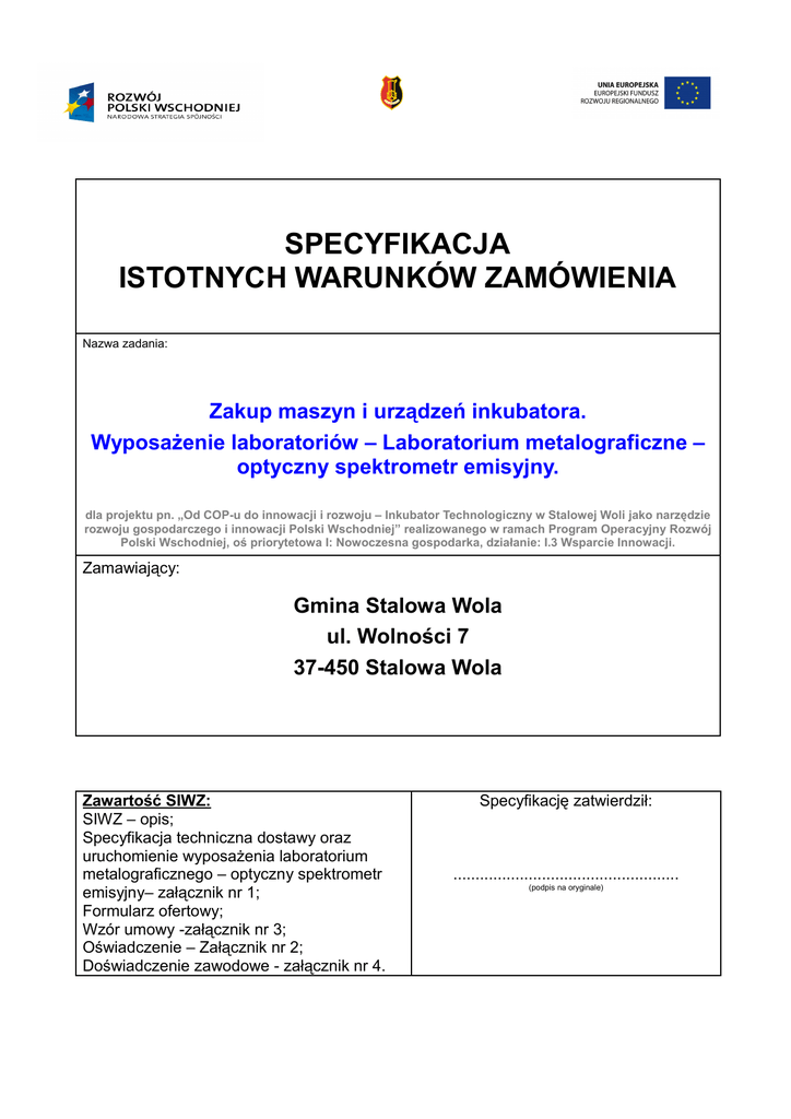 SPECYFIKACJA ISTOTNYCH WARUNKÓW ZAMÓWIENIA Nazwa zadania: Zakup maszyn i urządzeń inkubatora. Wyposażenie laboratoriów – Laboratorium metalograficzne – optyczny spektrometr emisyjny. dla projektu pn. „Od COP-u do innowacji i rozwoju – Inkubator Technologiczny w Stalowej Woli jako narzędzie rozwoju gospodarczego i innowacji Polski Wschodniej” realizowanego w ramach Program Operacyjny Rozwój Polski Wschodniej, oś priorytetowa I: Nowoczesna gospodarka, działanie: I.3 Wsparcie Innowacji. Zamawiający: Gmina Stalowa Wola ul. Wolności 7 37-450 Stalowa Wola Zawartość SIWZ: SIWZ – opis; Specyfikacja techniczna dostawy oraz uruchomienie wyposażenia laboratorium metalograficznego – optyczny spektrometr emisyjny– załącznik nr 1; Formularz ofertowy; Wzór umowy -załącznik nr 3; Oświadczenie – Załącznik nr 2; Doświadczenie zawodowe - załącznik nr 4. Specyfikację zatwierdził: ................................................... (podpis na oryginale) Specyfikacja Istotnych Warunków Zamówienia 1. NAZWA I ADRES ZAMAWIAJĄCEGO: Zamawiający: Gmina Stalowa Wola ul. Wolności 7 37-450 Stalowa Wola Tel.(0-15) 643-34-56, Fax (0-15) 634-34-12, e-mail [email protected], adres strony internetowej Zamawiającego - http://www.bip.stalowawola.pl/ rodzaj zamawiającego – administracja samorządowa 2. TRYB UDZIELENIA ZAMÓWIENIA: Postępowanie prowadzone jest w trybie przetargu nieograniczonego o wartości szacunkowej poniżej progów ustalonych na podstawie art. 11 ust. 8 ustawy z dnia 29 stycznia 2004 r. - Prawo zamówień publicznych /Dz. U. z 2007 r., Nr 223, poz. 1655 z późn. zm./ tj. o wartości zamówienia nie przekraczającej wyrażoną w złotych równowartość kwoty 193 000 euro. 3. OPIS PRZEDMIOTU ZAMÓWIENIA: Przedmiotem Zamówienia jest: Przedmiotem dostawy jest wyposażenie laboratorium badań metalograficznych - optyczny spektrometr emisyjny, przeznaczony dla Inkubatora Technologicznego w Stalowej Woli. Wykonywane prace/próbki muszą charakteryzować się dużą precyzją oraz powtarzalnością. Wysoka jakość wykonania prac/próbek jest niezwykle ważna dla dalszych prac badawczych. W celu potwierdzenia, parametrów oferowanego przedmiotu zamówienia należy do oferty dołączyć opisy w formie papierowej, które w sposób jednoznaczny pozwolą stwierdzić, że parametry eksploatacyjno – techniczne oferowanego urządzenia będą zgodne z wymaganiami Zamawiającego. Urządzenie musi spełniać wymagania dyrektywy "Nowego Podejścia UE” znak CE. 3.1. Przedmiot zadania określony jest kodami CPV: Główny przedmiot: 38433210-4 Spektrometr emisyjny 3.2. Okresy gwarancji: Okres pełnej gwarancji na urządzenia stanowiące wyposażenie laboratorium badań metalograficznych - optyczny spektrometr emisyjny oraz na wszystkie części składowe musi wynosić minimum 12 miesięcy. 3.3. Dostawa i instalacja Urządzenia/aparatura w wersji do transportu i/lub instalacji (montażu) w pomieszczeniu warsztatowym Inkubatora ma umożliwić zamontowanie jej w pomieszczeniu. Koszt transportu, ustawienia, instalacji i uruchomienia urządzeń stanowiących wyposażenie laboratorium badań metalograficznych - optyczny spektrometr emisyjny ponosi Dostawca. Dokumentacja budowlana, montażowa i przyłączeniowa musi być udostępniona przez Dostawcę nie później niż 90 dni przed planowanym terminem instalacji. Uruchomienie i odbiór urządzeń stanowiących wyposażenie laboratorium badań metalograficznych - optyczny spektrometr emisyjny nastąpi w oparciu o przygotowanie technologii i przeprowadzenie prób na detalach wskazanych przez Zamawiającego. Kompletne informacje o detalu odbiorowym zostaną udostępnione Dostawcy nie później niż 60 dni przed planowanym terminem instalacji i uruchomieniem. 3.4. Zamawiający nie przewiduje możliwości składania ofert częściowych; 3.5 Zamawiający nie przewiduje składania ofert wariantowych; 3.6 zamawiający nie przewiduje wyboru oferty za pomocą aukcji elektronicznej 4. TERMIN i MIEJSCE WYKONANIA ZAMÓWIENIA. 4.1. Czas realizacji dostawy urządzeń: Urządzenia stanowiące wyposażenie laboratorium badań metalograficznych - optyczny spektrometr emisyjny oraz wszystkie części składowe powinny być dostarczone w terminie od 5 września do 20 września 2010 roku. Data końcowa 20 września 2010 roku jest terminem ostatecznym realizacji zamówienia. 4.2. Miejsce dostarczenia przedmiotu zamówienia: Stalowa Wola, ul. Kwiatkowskiego 1 w nowo powstającej hali Inkubatora Technologicznego. 5. WARUNKI UDZIAŁU W POSTĘPOWANIU ORAZ OPIS SPOSOBU DOKONYWANIA OCENY SPEŁNIANIA TYCH WARUNKÓW. 5.1. O udzielenie zamówienia mogą ubiegać się wykonawcy, którzy spełniają warunki, dotyczące: 1. Posiadania uprawnień do wykonywania określonej działalności lub czynności, jeżeli przepisy prawa nakładają obowiązek ich posiadania; 2. Posiadania wiedzy i doświadczenia; 3. Dysponowania odpowiednim potencjałem technicznym oraz osobami zdolnymi do wykonania zamówienia; 4. Sytuacji ekonomicznej i finansowej 5.2. Wykonawcy winni spełnić następujące warunki: 1. są uprawnieni do występowania w obrocie prawnym, 2. zrealizowali w okresie ostatnich trzech lat a jeżeli okres prowadzenia jest krótszy w tym okresie, przed upływem terminu składania ofert co najmniej jedno zamówienie, (dostawa wraz z instalacją, urządzeń stanowiących wyposażenie laboratorium badań metalograficznych - optyczny spektrometr emisyjny), na kwotę co najmniej 100 000 zł. 3. posiadają sytuację finansową zapewniającą realizację zamówienia tj posiadają środki finansowe lub zdolność kredytową w wysokości co najmniej100 000 złotych, 4. winni być ubezpieczeni w zakresie prowadzonej działalności, 5. zaakceptują warunki udziału w postępowaniu i postanowienia umieszczone we wzorze umowy stanowiącym załącznik do niniejszej specyfikacji, 6. nie są wykluczeni z ubiegania się o udzielenie zamówienia publicznego na podstawie art.