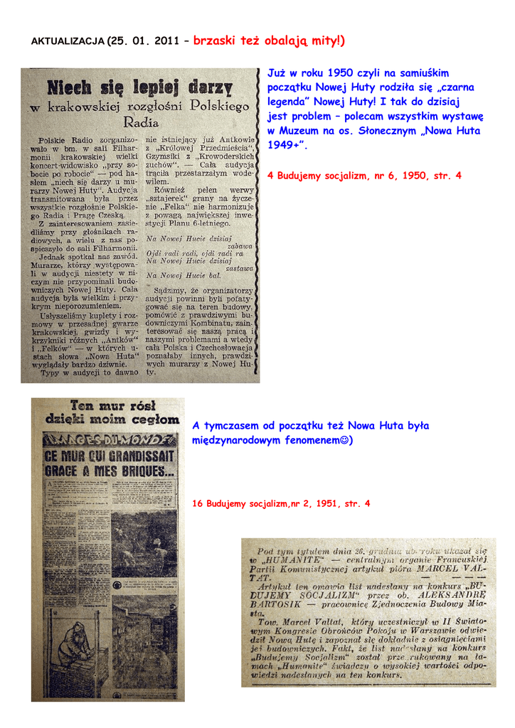 AKTUALIZACJA (25. 01. 2011 – brzaski też obalają mity!) Już w roku 1950 czyli na samiuśkim początku Nowej Huty rodziła się „czarna legenda” Nowej Huty! I tak do dzisiaj jest problem – polecam wszystkim wystawę w Muzeum na os. Słonecznym „Nowa Huta 1949+”. 4 Budujemy socjalizm, nr 6, 1950, str. 4 A tymczasem od początku też Nowa Huta była międzynarodowym fenomenem) 16 Budujemy socjalizm,nr 2, 1951, str. 4 41 Budujemy socjalizm, nr 51, 1951, str. 4 Warto przeczytać prof. Maksymiliana Siemieńskiego „Z badań nad działalnością kulturalno-oświatową w Nowej Hucie” z roku 1961. To prace Komisji Nauk Pedagogicznych PAN, oddział w Krakowie. Ze zdumieniem przeczytałam, że w wyniku tych badań profesor lansuje fakt, iż do Nowej Huty przybywali ludzie z prostych przyczyn: poprawy życia materialnego, przeżyć przygodę. Natomiast – zdaniem Profesora już w 1961 r. – nie da się obronić tezy, że przybywali tu budowniczowie z przyczyn ideologicznych: budować socjalizm. Tak jest napisane w tej książce!!! A kultura w Nowej Hucie od zawsze – widać - miała pod górkę! 113 Budujemy socjalizm, nr 55, 1954, str. 2 106 Budujemy socjalizm, nr 22, 1954, str. 2 Mam szczerą nadzieję, że w XXI wieku to się zmieni i Stowarzyszenie Muzyczne „Jazz&Beat&Rock” Nowa Huta znajdzie sponsorów, patronów i będzie jasnym punktem na mapie kulturalnej Nowej Huty! 62 Głos Nowej Huty, 1958, nr 67 Zorganizowany przez Kto to ta ładna dziewczyna? Stowarzyszenie Muzyczne „Jazz&Beat&Rock” Nowa Huta amatorski konkurs śpiewaczy „Szukamy młodych talentów”, „Mikrofon dla wszystkich” odkrył wiele talentów piosenkarskich Nowej Huty i Krakowa (potem Małopolski, Polski, et cetera, et cetera!!!:) Można przecież pomarzyć Pozdrawiam serdecznie, Krystyna Downar