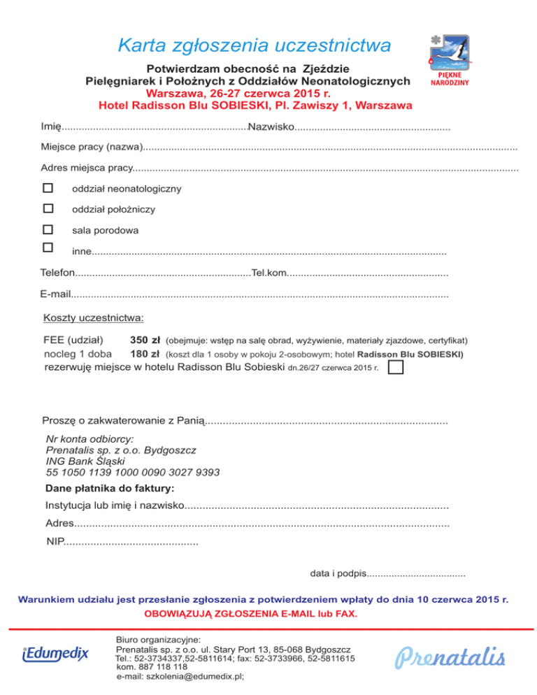 Karta zgłoszenia uczestnictwa Potwierdzam obecność na Zjeździe Pielęgniarek i Położnych z Oddziałów Neonatologicznych Warszawa, 26-27 czerwca 2015 r. Hotel Radisson Blu SOBIESKI, Pl. Zawiszy 1, Warszawa Imię..................................................................Nazwisko....................................................... Miejsce pracy (nazwa).................................................................................................................................... Adres miejsca pracy........................................................................................................................................ oddział neonatologiczny oddział położniczy sala porodowa inne............................................................................................................................. Telefon..............................................................Tel.kom......................................................... E-mail..................................................................................................................................... Koszty uczestnictwa: FEE (udział) 350 zł (obejmuje: wstęp na salę obrad, wyżywienie, materiały zjazdowe, certyfikat) nocleg 1 doba 180 zł (koszt dla 1 osoby w pokoju 2-osobowym; hotel Radisson Blu SOBIESKI) rezerwuję miejsce w hotelu Radisson Blu Sobieski dn.26/27 czerwca 2015 r. Proszę o zakwaterowanie z Panią................................................................................. Nr konta odbiorcy: Prenatalis sp. z o.o. Bydgoszcz ING Bank Śląski 55 1050 1139 1000 0090 3027 9393 Dane płatnika do faktury: Instytucja lub imię i nazwisko........................................................................................ Adres............................................................................................................................. NIP............................................. data i podpis.................................... Warunkiem udziału jest przesłanie zgłoszenia z potwierdzeniem wpłaty do dnia 10 czerwca 2015 r. OBOWIĄZUJĄ ZGŁOSZENIA E-MAIL lub FAX. _________________________________________ Biuro organizacyjne: Prenatalis sp. z o.o. ul. Stary Port 13, 85-068 Bydgoszcz Tel.: 52-3734337,52-5811614; fax: 52-3733966, 52-5811615 kom. 887 118 118 e-mail: [email protected];