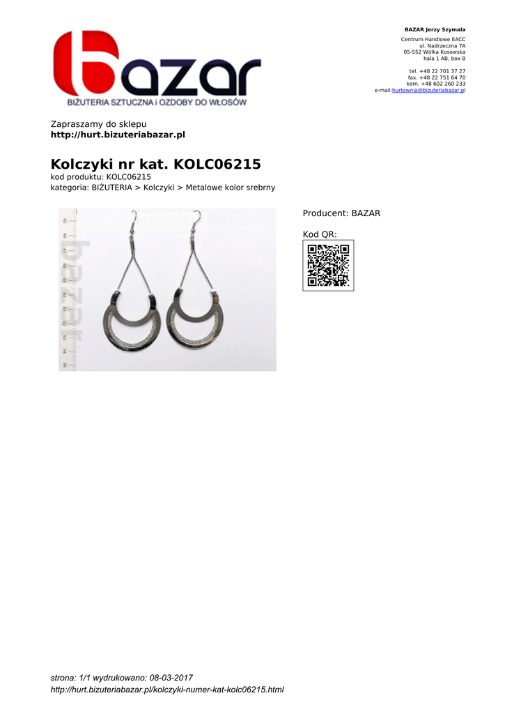 BAZAR Jerzy Szymala Centrum Handlowe EACC ul. Nadrzeczna 7A 05-552 Wólka Kosowska hala 1 AB, box B tel. +48 22 701 37 27 fax. +48 22 751 64 70 kom. +48 602 260 233 e-mail:[email protected] Zapraszamy do sklepu http://hurt.bizuteriabazar.pl Kolczyki nr kat. KOLC06215 kod produktu: KOLC06215 kategoria: BIŻUTERIA > Kolczyki > Metalowe kolor srebrny Producent: BAZAR Kod QR: strona: 1/1 wydrukowano: 08-03-2017 http://hurt.bizuteriabazar.pl/kolczyki-numer-kat-kolc06215.html