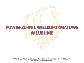 MODART OUTDOOR Sp. z o.o., 20-487 Lublin, ul. Romera 15, NIP 712-308-25-07 www.outdoor.modart.com.pl Powierzchnia: 63 m2 Format: 16,55m x 3,80m Oświetlenie: nie Powierzchnia przy jednej z najbardziej ruchliwych ulic w Lublinie Bardzo intensywny ruch samochodowy i pieszy W bezpośrednim sąsiedztwie liczne firmy oraz dworzec główny PKP i Targi Lublin W pobliżu targowisko przy dworcu oraz liczne sklepy i punkty usługowe MODART OUTDOOR Sp. z o.o., 20-487 Lublin, ul. Romera 15, NIP 712-308-25-07 www.outdoor.modart.com.pl MODART OUTDOOR Sp. z o.o., 20-487 Lublin, ul. Romera 15, NIP 712-308-25-07 www.outdoor.modart.com.pl Powierzchnia: 170 m2 Format: 13,6m x 12,5m Oświetlenie: nie Lokalizacja: dzielnica Śródmieście Powierzchnia w ścisłym Śródmieściu Bardzo intensywny ruch pieszy i samochodowy W bezpośrednim sąsiedztwie Centrum Kultury W pobliżu liczne kancelarie prawne, banki, sklepy, punkty usługowe, lokale gastronomiczne, dyskoteki MODART OUTDOOR Sp. z o.o., 20-487 Lublin, ul. Romera 15, NIP 712-308-25-07 www.outdoor.modart.com.pl MODART OUTDOOR Sp. z o.o., 20-487 Lublin, ul. Romera 15, NIP 712-308-25-07 www.outdoor.modart.com.pl Powierzchnia: 212,75 m2 Format: 18,5m x 11,5m Oświetlenie: nie Lokalizacja: dzielnica Śródmieście Powierzchnia w ścisłym Śródmieściu Bardzo intensywny ruch pieszy i samochodowy W bezpośrednim sąsiedztwie Centrum Kultury W pobliżu liczne kancelarie prawne, banki, sklepy, punkty usługowe, lokale gastronomiczne, dyskoteki MODART OUTDOOR Sp. z o.o., 20-487 Lublin, ul. Romera 15, NIP 712-308-25-07 www.outdoor.modart.com.pl MODART OUTDOOR Sp. z o.o., 20-487 Lublin, ul. Romera 15, NIP 712-308-25-07 www.outdoor.modart.com.pl Powierzchnia: 16 m2 Format: 2 m x 8 m Oświetlenie: nie Lokalizacja: dzielnica Śródmieście Powierzchnia przy jednym z najbardziej ruchliwych skrzyżowań w Śródmieściu (ul. Piłsudskiego/ ul. Lipowa/ ul. Narutowicza) Bardzo intensywny ruch pieszy i samochodowy W bezpośrednim sąsiedztwie hotel Victoria W pobliżu C.H. Plaza, Katolicki Uniwersytet Lubelski, UMCS, Politechnika Lubelska, Akademia Rolnicza oraz liczne kancelarie prawne, banki, sklepy, punkty usługowe, lokale gastronomiczne, dyskoteki MODART OUTDOOR Sp. z o.o., 20-487 Lublin, ul. Romera 15, NIP 712-308-25-07 www.outdoor.modart.com.pl MODART OUTDOOR Sp. z o.o., 20-487 Lublin, ul. Romera 15, NIP 712-308-25-07 www.outdoor.modart.com.pl Powierzchnia: 174,5 m2 Format: 10,45 m x 16,70 m Oświetlenie: nie Powierzchnia w pobliżu jednego z bardzo ruchliwych skrzyżowań na terenie miasteczka akademickiego Bardzo intensywny ruch samochodowy i pieszy W bezpośrednim sąsiedztwie Uniwersytet Marii Curie-Skłodowskiej, Katolicki Uniwersytet Lubelski, Uniwersytet Przyrodniczy W pobliżu liczne sklepy, punkty usługowe i lokale gastronomiczne MODART OUTDOOR Sp. z o.o., 20-487 Lublin, ul. Romera 15, NIP 712-308-25-07 www.outdoor.modart.com.pl MODART OUTDOOR Sp. z o.o., 20-487 Lublin, ul. Romera 15, NIP 712-308-25-07 www.outdoor.modart.com.pl Powierzchnia: 44,5 m2 Format: 8,9 m x 5 m Oświetlenie: tak Lokalizacja: dzielnica Śródmieście Cena wynajmu: 4000 zł netto miesięcznie Koszt montażu i demontażu: 1200 zł netto Koszt oświetlenia: 250 zł netto miesięcznie Koszt wydruku: 25 zł netto/m2 Powierzchnia przy jednym z najbardziej ruchliwych skrzyżowań w Śródmieściu (ul. Krakowskie Przedmieście/ ul. Lipowa/ al. Racławickie) Bardzo intensywny ruch pieszy i samochodowy W bezpośrednim sąsiedztwie Park Saski, KFC, Rossman, klub muzyczny Hades W pobliżu C.H. Plaza, Katolicki Uniwersytet Lubelski, UMCS, Uniwersytet Medyczny, Filharmonia Lubelska, Teatr Muzyczny oraz liczne kancelarie prawne, banki, sklepy, punkty usługowe, lokale gastronomiczne, dyskoteki MODART OUTDOOR Sp. z o.o., 20-487 Lublin, ul. Romera 15, NIP 712-308-25-07 www.outdoor.modart.com.pl MODART OUTDOOR Sp. z o.o., 20-487 Lublin, ul. Romera 15, NIP 712-308-25-07 www.outdoor.modart.com.pl Powierzchnia: 47 m2 Format: 11,4 m x 4,1 m Oświetlenie: nie Lokalizacja: dzielnica Śródmieście Cena wynajmu: 3500 zł netto miesięcznie Koszt montażu i demontażu: 1000 zł netto Koszt wydruku: 25 zł netto/m2 Powierzchnia przy jednym z najbardziej ruchliwych skrzyżowań w Śródmieściu (ul. Piłsudskiego/ ul. Lipowa/ ul. Narutowicza) Bardzo intensywny ruch pieszy i samochodowy W bezpośrednim sąsiedztwie hotel Victoria W pobliżu C.H. Plaza, Katolicki Uniwersytet Lubelski, UMCS, Politechnika Lubelska, Akademia Rolnicza oraz liczne kancelarie prawne, banki, sklepy, punkty usługowe, lokale gastronomiczne, dyskoteki MODART OUTDOOR Sp. z o.o., 20-487 Lublin, ul. Romera 15, NIP 712-308-25-07 www.outdoor.modart.com.pl MODART OUTDOOR Sp. z o.o., 20-487 Lublin, ul. Romera 15, NIP 712-308-25-07 www.outdoor.modart.com.pl Powierzchnia: 52,5 m2 Format: 7,5 m x 7 m Oświetlenie: nie Lokalizacja: dzielnica Węglin Cena wynajmu: 1200 zł netto miesięcznie Koszt montażu i demontażu: 400 zł netto Koszt wydruku: 25 zł netto/m2 Powierzchnia przy wyjeździe z Tesco, OBI, Galeria Orkana, Galeria Zone Bardzo intensywny ruch pieszy i samochodowy W bezpośrednim sąsiedztwie Tesco, OBI, Galeria Orkana, Galeria Zone W pobliżu droga wyjazdowa z Lublina w kierunku Rzeszowa i Kielc MODART OUTDOOR Sp. z o.o., 20-487 Lublin, ul. Romera 15, NIP 712-308-25-07 www.outdoor.modart.com.pl MODART OUTDOOR Sp. z o.o., 20-487 Lublin, ul. Romera 15, NIP 712-308-25-07 www.outdoor.modart.com.pl Powierzchnia: 78 m2 Format: 18,5 m x 4,2 m Oświetlenie: nie Cena wynajmu: 3500 zł netto miesięcznie Koszt montażu i demontażu: 800 zł netto Koszt wydruku: 25 zł netto/m2 Powierzchnia w pobliżu jednego z najbardziej ruchliwych skrzyżowań w Lublinie (al. Solidarności/ al. Unii Lubelskiej) Bardzo intensywny ruch samochodowy W bezpośrednim sąsiedztwie stacja paliw Statoil oraz dworzec główny PSK, Zamek Lubelski Przy drodze nr 12 z Lublina w kierunku Zamościa, Chełma oraz Kijowa i Lwowa W pobliżu targowisko przy zamku i przy dworc