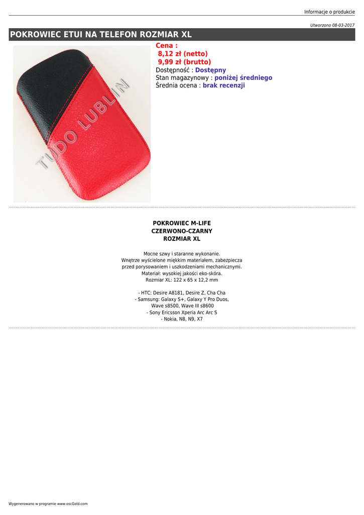 Informacje o produkcie Utworzono 08-03-2017 POKROWIEC ETUI NA TELEFON ROZMIAR XL Cena : 8,12 zł (netto) 9,99 zł (brutto) Dostępność : Dostępny Stan magazynowy : poniżej średniego Średnia ocena : brak recenzji POKROWIEC M-LIFE CZERWONO-CZARNY ROZMIAR XL Mocne szwy i staranne wykonanie. Wnętrze wyścielone miękkim materiałem, zabezpiecza przed porysowaniem i uszkodzeniami mechanicznymi. Materiał: wysokiej jakości eko-skóra. Rozmiar XL: 122 x 65 x 12,2 mm - HTC: Desire A8181, Desire Z, Cha Cha - Samsung: Galaxy S+, Galaxy Y Pro Duos, Wave s8500, Wave III s8600 - Sony Ericsson Xperia Arc Arc S - Nokia, N8, N9, X7 Wygenerowano w programie www.oscGold.com