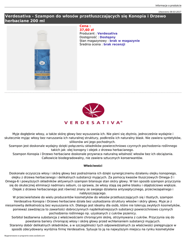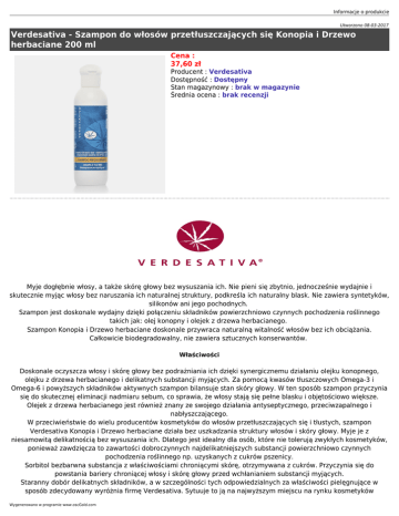 Informacje o produkcie Utworzono 08-03-2017 Verdesativa - Szampon do włosów przetłuszczających się Konopia i Drzewo herbaciane 200 ml Cena : 37,60 zł Producent : Verdesativa Dostępność : Dostępny Stan magazynowy : brak w magazynie Średnia ocena : brak recenzji Myje dogłębnie włosy, a także skórę głowy bez wysuszania ich. Nie pieni się zbytnio, jednocześnie wydajnie i skutecznie myjąc włosy bez naruszania ich naturalnej struktury, podkreśla ich naturalny blask. Nie zawiera syntetyków, silikonów ani jego pochodnych. Szampon jest doskonale wydajny dzięki połączeniu składników powierzchniowo czynnych pochodzenia roślinnego takich jak: olej konopny i olejek z drzewa herbacianego. Szampon Konopia i Drzewo herbaciane doskonale przywraca naturalną witalność włosów bez ich obciążania. Całkowicie biodegradowalny, nie zawiera sztucznych konserwantów. Właściwości Doskonale oczyszcza włosy i skórę głowy bez podrażniania ich dzięki synergicznemu działaniu olejku konopnego, olejku z drzewa herbacianego i delikatnych substancji myjących. Za pomocą kwasów tłuszczowych Omega-3 i Omega-6 i powyższych składników aktywnych szampon bilansuje stan skóry głowy. W ten sposób szampon przyczynia się do skutecznej eliminacji nadmiaru sebum, co sprawia, że włosy stają się pełne blasku i objętościowo większe. Olejek z drzewa herbacianego jest również znany ze swojego działania antyseptycznego, przeciwzapalnego i nabłyszczającego. W przeciwieństwie do wielu producentów kosmetyków do włosów przetłuszczających się i tłustych, szampon Verdesativa Konopia i Drzewo herbaciane działa bez uszkadzania struktury włosów i skóry głowy. Myje je z niesamowitą delikatnością bez wysuszania ich. Dlatego jest idealny dla osób, które nie tolerują zwykłych kosmetyków, ponieważ zawdzięcza to zawartości dobroczynnych najdelikatniejszych substancji powierzchniowo czynnych pochodzenia roślinnego np. uzyskanych z cukrów pszenicy. Sorbitol bezbarwna substancja z właściwościami chroniącymi skórę, otrzymywana z cukrów. Przyczynia się do powstania bariery chroniącej włosy i skórę głowy przed wchłanianiem substancji myjących. Staranny dobór delikatnych składników, a w szczególności tych odpowiedzialnych za właściwości pielęgnujące w sposób zdecydowany wyróżnia firmę Verdesativa. Sytuuje to ją na najwyższym miejscu na rynku kosmetyków Wygenerowano w programie www.oscGold.com ekologicznych o najwyższej jakości. Poprzez jakość rozumie się ekologiczność i całkowitą nieszkodliwość produktu. DISODIUM COCOPOLYGLUCOSE CITRATE, SODIUM LAUROYL GLUTAMATE CAPRYLYL/CAPRYL GLUCOSIDE należą do składników powierzchniowo czynnych pochodzenia roślinnego, przez wielu uważanych za jedne z najbardziej kompatybilne z ludzką skórą, jakie istnieją. Mimo, iż nie są zbyt pieniące, w rzeczywistości posiadają ogromne właściwości myjące i szybko oczyszczają zabrudzenia. Pojemność 200 ml. Sposób stosowania: Zaleca się rozcieńczyć produkt, aby ułatwić jego rozprowadzenie, w szczególności na długich włosach. W celu zwiększenia jeszcze bardziej wydajności szamponu i jego dobroczynnego działania, zalecamy od czasu do czasu wcierać we włosy czystą oliwkę Verdesativa kilka godzin przed myciem. Składniki: Aqua; Disodium Cocopolyglucose Citrate; Caprylyl/Capryl Glucoside; Sorbitol; Glycerin; Hydrolyzed Wheat Protein; Sodium Lauroyl Glutamate; Lactic Acid; Cannabis Sativa; Melaleuca Alternifolia; Ascorbic Acid. Produkt certyfikowany