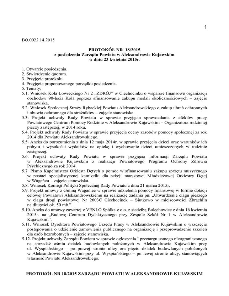 1 BO.0022.14.2015 PROTOKÓŁ NR 18/2015 z posiedzenia Zarządu Powiatu w Aleksandrowie Kujawskim w dniu 23 kwietnia 2015r. 1. Otwarcie posiedzenia. 2. Stwierdzenie quorum. 3. Przyjęcie protokołu. 4. Przyjęcie proponowanego porządku posiedzenia. 5. Tematy: 5.1. Wniosek Koła Łowieckiego Nr 2 „ZDRÓJ” w Ciechocinku o wsparcie finansowe organizacji obchodów 90-lecia Koła poprzez sfinansowanie zakupu medali okolicznościowych – zajęcie stanowiska. 5.2. Wniosek Społecznej Straży Rybackiej Powiatu Aleksandrowskiego o zakup ubrań ochronnych i obuwia ochronnego dla strażników – zajęcie stanowiska. 5.3. Projekt uchwały Rady Powiatu w sprawie przyjęcia sprawozdania z efektów pracy Powiatowego Centrum Pomocy Rodzinie w Aleksandrowie Kujawskim – Organizatora rodzinnej pieczy zastępczej, w 2014 roku. 5.4. Projekt uchwały Rady Powiatu w sprawie przyjęcia oceny zasobów pomocy społecznej za rok 2014 dla Powiatu Aleksandrowskiego. 5.5. Aneks do porozumienia z dnia 12 maja 2014r. w sprawie przyjęcia dzieci oraz warunków ich pobytu i wysokości wydatków na opiekę i wychowanie dzieci umieszczonych w rodzinie zastępczej. 5.6. Projekt uchwały Rady Powiatu w sprawie przyjęcia informacji Zarządu Powiatu w Aleksandrowie Kujawskim z realizacji Powiatowego Programu Ochrony Zdrowia Psychicznego za rok 2014. 5.7. Pismo Kapelmistrza Orkiestr Dętych o pomoc w sfinansowaniu zakupu sprzętu muzycznego w postaci specjalistycznej kamizelki dla sekcji marszowej Młodzieżowej Orkiestry Dętej w Wagańcu – zajęcie stanowiska. 5.8. Wniosek Komisji Polityki Społecznej Rady Powiatu z dnia 21 marca 2015r. 5.9. Projekt umowy z Gminą Waganiec w sprawie udzielenia pomocy finansowej w formie dotacji celowej Powiatowi Aleksandrowskiemu na realizację zadania pn. „Utwardzenie ciągu pieszego w ciągu drogi powiatowej Nr 2603C Ciechocinek – Siutkowo w miejscowości Zbrachlin na długości ok. 50 mb.”. 5.10. Aneks do umowy zawartej z VENLO Spółka z o.o. z siedzibą Bolechowice z dnia 16 kwietnia 2015r. na „Budowę Centrum Dydaktycznego przy Zespole Szkół Nr 1 w Aleksandrowie Kujawskim”. 5.11. Wniosek Dyrektora Powiatowego Urzędu Pracy w Aleksandrowie Kujawskim o wszczęcie postępowania o udzielenie zamówienia publicznego na organizację i przeprowadzenie szkoleń dla osób bezrobotnych – zajęcie stanowiska. 5.12. Projekt uchwały Zarządu Powiatu w sprawie ogłoszenia I przetargu ustnego nieograniczonego na sprzedaż ośmiu działek budowlanych położonych w Aleksandrowie Kujawskim przy ul. Wyspiańskiego – po prawej stronie ulicy ora pięciu działek budowlanych położonych w Aleksandrowie Kujawskim przy ul. Wyspiańskiego – po lewej stronie ulicy, stanowiących własność Powiatu Aleksandrowskiego. PROTOKÓŁ NR 18/2015 ZARZĄDU POWIATU W ALEKSANDROWIE KUJAWSKIM 2 5.13. Projekt umowy z Gminą Aleksandrów Kujawski w sprawie udzielenia pomocy finansowej w formie dotacji celowej Powiatowi Aleksandrowskiemu na realizację zadania pn. „Remont nawierzchni masą bitumiczną drogi powiatowej Nr 2530C Zduny – Opoki wraz z utwardzeniem nawierzchni pod zatoką autobusową – 0,7 km”. 5.14. Pismo z Zespołu Szkolno – Przedszkolnego w Bądkowie w sprawie dofinansowanie druku 200 szt. książeczek o bezpieczeństwie w ruchu drogowym – zajęcie stanowiska. 6. Sprawy różne. 7. Inne sprawy wniesione przez członków Zarządu Powiatu. 8. Zamknięcie posiedzenia. Ad. 1. Pan Dariusz Wochna Starosta Aleksandrowski – otwieram posiedzenie Zarządu Powiatu w Aleksandrowie Kujawskim. Witam członków Zarządu Powiatu, Wicestarostę pana Wojciecha Marjańskiego, członka Zarządu pana Lotfi Mansoura, panią Skarbnik. Posiedzenie Zarządu Powiatu zostało otwarte o godzinie 10:00. Ad. 2. Pan Dariusz Wochna – stwierdzam quorum. W posiedzeniu uczestniczą wszyscy członkowie Zarządu Powiatu. Posiedzenie jest prawomocne i Zarząd może podejmować uchwały. Lista obecności stanowi załącznik do protokołu. Ad 3. Pan Dariusz Wochna – proponuję przyjąć bez czytania protokół nr 17/2015 z posiedzenia Zarządu Powiatu z dnia 16 kwietnia 2015r. Czy są uwagi, propozycje zmian, czy uzupełnień do przedłożonego protokołu nr 17/2015 z posiedzenia Zarządu Powiatu w dniu 16 kwietnia 2015r.? Nie widzę. Proponuję przyjąć go bez czytania. Przebieg głosowania: Za – 3, Przeciw – nie było, Wstrzymujących się – nie było. Jednogłośnie. Członkowie Zarządu Powiatu, w wyniku głosowania przyjęli protokół nr 17/2015 z posiedzenia Zarządu Powiatu z dnia 16 kwietnia 2015r. Ad 4. Pan Dariusz Wochna – przechodzimy do proponowanego porządku dzisiejszego posiedzenia. Proponuję uzupełnić porządek o punkt 5.14.: 5.14. Pismo z Zespołu Szkolno – Przedszkolnego w Bądkowie w sprawie dofinansowanie druku 200 szt. książeczek o bezpieczeństwie w ruchu drogowym – zajęcie stanowiska. Czy są inne wnioski o zmianę porządku? Nie widzę. Kto jest za przyjęciem dzisiejszego porządku posiedzenia wraz z uzupełnieniem o punkt 5.14.? Dziękuję. PROTOKÓŁ NR 18/2015 ZARZĄDU POWIATU W ALEKSANDROWIE KUJAWSKIM 3 Zarząd Powiatu, przyjął porządek posiedzenia. Przebieg głosowania: Za – 3, Przeciw – nie było, Wstrzymujących się – nie było. Jednogłośnie. Porządek posiedzenia Zarządu Powiatu, stanowi załącznik do protokołu. Ad 5.1. Wniosek Koła Łowieckiego Nr 2 „ZDRÓJ” w Ciechocinku o wsparcie finansowe organizacji obchodów 90-lecia Koła poprzez sfinansowanie zakupu medali okolicznościowych – zajęcie stanowiska. Pan Dariusz Wochna – przechodzimy do punktu 5.1. Wniosek Koła Łowieckiego Nr 2 „ZDRÓJ” w Ciechocinku o wsparcie finansowe organizacji obchodów 90-lecia Koła poprzez sfinansowanie zakupu medali okolicznościowych. Obchody jubileuszu Koła zaplanowane są na 5 września 2015r. Zarząd Powiatu na posiedzeniu 18 lutego 2015r. zapoznał się z wnioskiem Koła Łowieckiego Nr 2 „Zdrój” w Ciechocinku o przyznanie śro