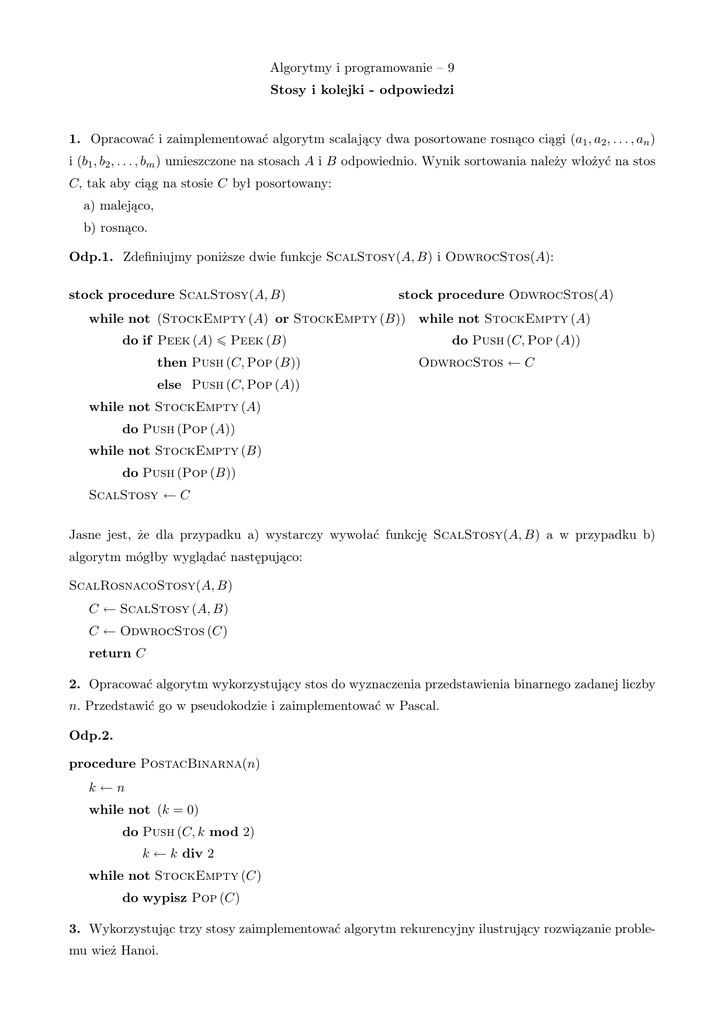 Algorytmy i programowanie – 9 Stosy i kolejki - odpowiedzi 1. Opracować i zaimplementować algorytm scalający dwa posortowane rosnąco ciągi (a1 , a2 , . . . , an ) i (b1 , b2 , . . . , bm ) umieszczone na stosach A i B odpowiednio. Wynik sortowania należy włożyć na stos C, tak aby ciąg na stosie C był posortowany: a) malejąco, b) rosnąco. Odp.1. Zdefiniujmy poniższe dwie funkcje ScalStosy(A, B) i OdwrocStos(A): stock procedure ScalStosy(A, B) stock procedure OdwrocStos(A) while not (StockEmpty (A) or StockEmpty (B)) while not StockEmpty (A) do if Peek (A) ¬ Peek (B) then Push (C, Pop (B)) do Push (C, Pop (A)) OdwrocStos ← C else Push (C, Pop (A)) while not StockEmpty (A) do Push (Pop (A)) while not StockEmpty (B) do Push (Pop (B)) ScalStosy ← C Jasne jest, że dla przypadku a) wystarczy wywołać funkcję ScalStosy(A, B) a w przypadku b) algorytm mógłby wyglądać następująco: ScalRosnacoStosy(A, B) C ← ScalStosy (A, B) C ← OdwrocStos (C) return C 2. Opracować algorytm wykorzystujący stos do wyznaczenia przedstawienia binarnego zadanej liczby n. Przedstawić go w pseudokodzie i zaimplementować w Pascal. Odp.2. procedure PostacBinarna(n) k←n while not (k = 0) do Push (C, k mod 2) k ← k div 2 while not StockEmpty (C) do wypisz Pop (C) 3. Wykorzystując trzy stosy zaimplementować algorytm rekurencyjny ilustrujący rozwiązanie problemu wież Hanoi. Odp.3. Algorytm był przedstawiony na wykładzie. procedure Hanoi(n, A, B, C) if n = 1 then Push (B, Pop (A)) tu jest miejsce na wyświetlenie stanu stosów else Hanoi (n − 1, A, C, B) Push (B, Pop (A)) tu jest miejsce na wyświetlenie stanu stosów Hanoi (n − 1, C, B, A) Implementacja w języku Pascal wieze hanoi.dpr. 4. Dodać sygnalizację błędów w implementacji kolejki kolejki.dpr. Odp.4. Należało uzupełnić procedurę Enqueue i funkcję Dequeue tak, aby możliwa była obsługa błędu przepełnienia i niedomiaru. Poniżej zaproponuję rozwiązanie wykorzystujące dodatkowy parametr kolejki jakim będzie size [Q] , początkowo ustawiony na wartość 0 : procedure Enqueue(Q, x) if size [Q] = length [Q] then error „przepenienie” Q [tail [Q]] ← x if tail [Q] = length [Q] then tail [Q] ← 1 else tail [Q] ← tail [Q] + 1 size [Q] ← size [Q] + 1 integer procedure Dequeue(Q) if size [Q] = 0 then error „niedomiar” x ← Q [head [Q]] if head [Q] = length [Q] then head [Q] ← 1 else head [Q] ← head [Q] + 1 size [Q] ← size [Q] − 1 5. Opracować i zaimplementować algorytm wyszukiwania zadanego elementu x w kolejce. Uwaga: (1) W wyniku działania algorytmu z kolejki nie mogą „zniknąć” elementy, które w niej były przed uruchomieniem algorytmu. (2) Należy rozwiązać również problem zapętlenia się algorytmu! Odp.5. QueueSearch(Q, x) tail ← tail [Q] zapamiętujemy gdzie był ogon kolejki repeat y ← Dequeue [Q] zdejmujemy z czoła kolejny element Enqueue (Q, y) i umieszczamy go na końcu kolejki until (tail = head [Q]) or (y = x) jeżeli przejrzeliśmy całą kolejkę tail = head [Q] albo znaleźliśmy element x, więc kończymy szukanie if y = x then wypisz „znaleziony” else wypisz „nieznaleziony” 6. Jak zaimplementować dwa stosy w jednej tablicy, tak aby błąd przepełnienia wystąpił dopiero, gdy cała tablica będzie wypełniona. Odp.6. Tablicę S [1..n] wypełniać będziemy w następujący sposób: (1) w polach S [1] , S [2] , . . . , S [k] tablicy S zawarte będą elementy stosu S1 , (2) w polach S [n] , S [n − 1] , . . . , S [l] tablicy S zawarte będą elementy stosu S2 , gdzie k < l, w przeciwnym przypadku następuje przepełnienie stosów. Poniżej procedury i funkcje dla obydwu stosów: StockEmpty(nr) Pop(nr) if nr = 1 if StockEmpty (nr) then if top [S1 ] = 0 then return true else return false else if top [S2 ] = n then error „niedomiar” else if nr = 1 then top [S1 ] ← top [S1 ] − 1 return S [top [S1 ] + 1] then return true else top [S2 ] ← top [S2 ] + 1 else return false return S [top [S2 ] − 1] Push(x, nr) if nr = 1 then top [S1 ] ← top [S1 ] + 1 else top [S2 ] ← top [S2 ] − 1 if top [S1 ] > top [S2 ] then error „przepełnienie” else if nr = 1 then S [top [S1 ]] ← x else S [top [S2 ]] ← x