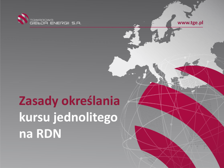www.tge.pl Zasady określania kursu jednolitego na RDN www.tge.pl Zasady budowania krzywej podaży i popytu Cenę minimalną i cenę maksymalną określa Giełda. Limit ceny i wolumen podany w zleceniach kupna określają współrzędne punktów, które poprzez połączenie za pomocą linii prostej (interpolacja liniowa) wyznaczają krzywą popytu. Krzywa popytu rozpoczyna się od punkty dla teoretycznego zlecenia kupna z limitem ceny równym cenie maksymalnej i z wolumenem równym „0” a kooczy się w punkcie dla teoretycznego zlecenia kupna z limitem ceny równym cenie minimalnej i z wolumenem równym skumulowanemu wolumenowi dla najniższego limitu ceny w zleceniach kupna. Limit ceny i wolumen podany w zleceniach sprzedaży określają współrzędne punktów, które poprzez połączenie za pomocą linii prostej (interpolacja liniowa) wyznaczają krzywą podaży. Krzywa podaży rozpoczyna się od punkty dla teoretycznego zlecenia sprzedaży z limitem ceny równym cenie minimalnej i z wolumenem równym„0” a kooczy się w teoretycznym punkcie dla zlecenia sprzedaży z limitem ceny równym cenie maksymalnej i z wolumenem równym skumulowanemu wolumenowi dla najwyższego limitu ceny w zleceniach sprzedaży www.tge.pl Parametry złożonych zleceo Parametry złożonych zleceo na podstawie, których wyznaczono krzywe podaży i popytu oraz wyznaczono kursy jednolity (kurs fixingu) : 1. Zlecenia kupna Zlecenie nr 1 - 200 zł/MWh@25 MWh; Zlecenie nr 2 - 175 zł/MWh@25MWh. Zlecenie nr 3 - 155 zł/MWh@65MWh. 2. Zlecenia sprzedaży Zlecenie nr 4 - 125 zł/MWh@20 MWh; Zlecenie nr 5 - 140zł/MWh@35MWh. Zlecenie nr 6 - 190 zł/MWh@40MWh. www.tge.pl Algorytm fixingu na RDN zł/MWh Punkty wynikające ze złożonych zleceo kupna Cena max 200 190 175 170 160 155 140 Punkty wynikające ze złożonych zleceo sprzedaży 20 25 Cena min 50 55 75 90 105 115 MWh Algorytm fixingu na RDN www.tge.pl zł/MWh Cena max Punkt dla teoretycznego zlecenia kupna z limitem ceny równym cenie maksymalnej i z wolumenem równym zero Teoretyczny punkt dla zlecenia sprzedaży z limitem ceny równym cenie maksymalnej i z wolumenem równym skumulowanemu wolumenowi dla najwyższego limitu ceny w zleceniach sprzedaży Kurs jednolity (punkt przecięcia krzywej podaży popytu) 200 190 175 170 Punkt dla teoretycznego zlecenia kupna z limitem ceny równym cenie minimalnej i z wolumenem równym skumulowanemu wolumenowi dla najniższego limitu ceny w zleceniach kupna 160 155 140 20 25 Cena min 50 55 Punkt dla teoretycznego zlecenia sprzedaży z limitem ceny równym cenie minimalnej i z wolumenem równym zero 75 90 105 115 MWh www.tge.pl Cechy charakterystyczne algorytmu fixingu na RDN 1. Przecięcie krzywej podaży i popytu następuje zawsze przy jednej cenie (kursie). 2. Limit zleceo podawany jest z dokładnością do 1 grosza. 3. Wolumen zleceo składany jest z dokładnością do 0,1 MWh. www.tge.pl Dziękuję za uwagę