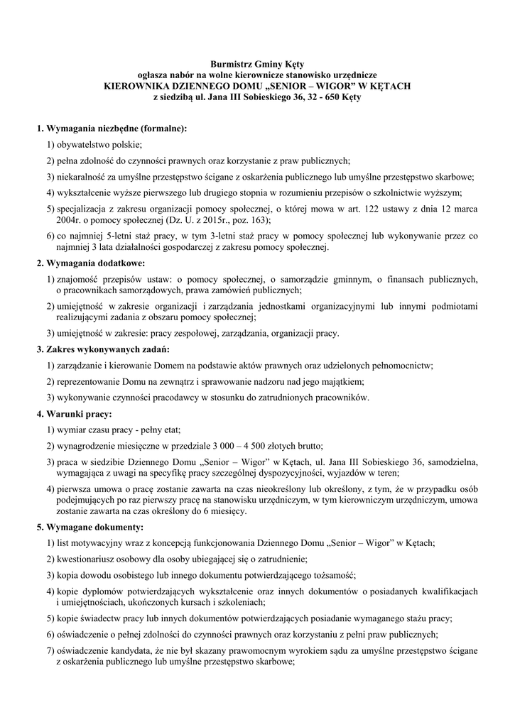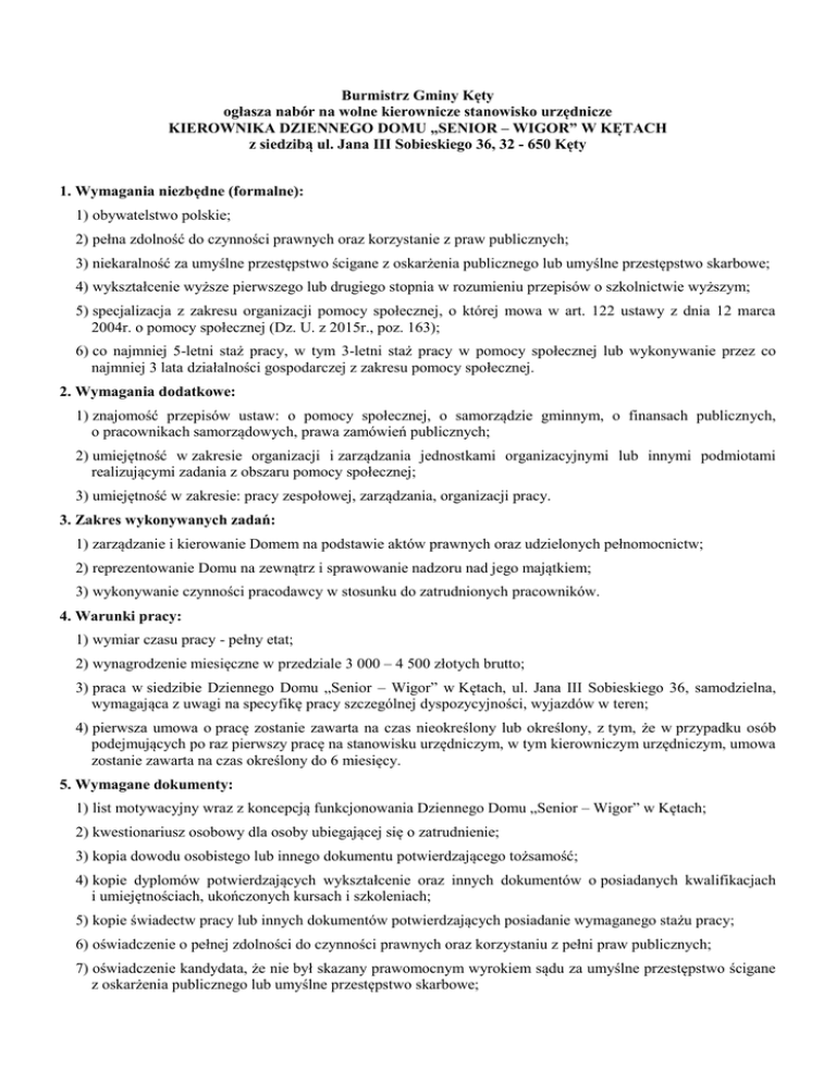 Burmistrz Gminy Kęty ogłasza nabór na wolne kierownicze stanowisko urzędnicze KIEROWNIKA DZIENNEGO DOMU „SENIOR – WIGOR” W KĘTACH z siedzibą ul. Jana III Sobieskiego 36, 32 - 650 Kęty 1. Wymagania niezbędne (formalne): 1) obywatelstwo polskie; 2) pełna zdolność do czynności prawnych oraz korzystanie z praw publicznych; 3) niekaralność za umyślne przestępstwo ścigane z oskarżenia publicznego lub umyślne przestępstwo skarbowe; 4) wykształcenie wyższe pierwszego lub drugiego stopnia w rozumieniu przepisów o szkolnictwie wyższym; 5) specjalizacja z zakresu organizacji pomocy społecznej, o której mowa w art. 122 ustawy z dnia 12 marca 2004r. o pomocy społecznej (Dz. U. z 2015r., poz. 163); 6) co najmniej 5-letni staż pracy, w tym 3-letni staż pracy w pomocy społecznej lub wykonywanie przez co najmniej 3 lata działalności gospodarczej z zakresu pomocy społecznej. 2. Wymagania dodatkowe: 1) znajomość przepisów ustaw: o pomocy społecznej, o samorządzie gminnym, o finansach publicznych, o pracownikach samorządowych, prawa zamówień publicznych; 2) umiejętność w zakresie organizacji i zarządzania jednostkami organizacyjnymi lub innymi podmiotami realizującymi zadania z obszaru pomocy społecznej; 3) umiejętność w zakresie: pracy zespołowej, zarządzania, organizacji pracy. 3. Zakres wykonywanych zadań: 1) zarządzanie i kierowanie Domem na podstawie aktów prawnych oraz udzielonych pełnomocnictw; 2) reprezentowanie Domu na zewnątrz i sprawowanie nadzoru nad jego majątkiem; 3) wykonywanie czynności pracodawcy w stosunku do zatrudnionych pracowników. 4. Warunki pracy: 1) wymiar czasu pracy - pełny etat; 2) wynagrodzenie miesięczne w przedziale 3 000 – 4 500 złotych brutto; 3) praca w siedzibie Dziennego Domu „Senior – Wigor” w Kętach, ul. Jana III Sobieskiego 36, samodzielna, wymagająca z uwagi na specyfikę pracy szczególnej dyspozycyjności, wyjazdów w teren; 4) pierwsza umowa o pracę zostanie zawarta na czas nieokreślony lub określony, z tym, że w przypadku osób podejmujących po raz pierwszy pracę na stanowisku urzędniczym, w tym kierowniczym urzędniczym, umowa zostanie zawarta na czas określony do 6 miesięcy. 5. Wymagane dokumenty: 1) list motywacyjny wraz z koncepcją funkcjonowania Dziennego Domu „Senior – Wigor” w Kętach; 2) kwestionariusz osobowy dla osoby ubiegającej się o zatrudnienie; 3) kopia dowodu osobistego lub innego dokumentu potwierdzającego tożsamość; 4) kopie dyplomów potwierdzających wykształcenie oraz innych dokumentów o posiadanych kwalifikacjach i umiejętnościach, ukończonych kursach i szkoleniach; 5) kopie świadectw pracy lub innych dokumentów potwierdzających posiadanie wymaganego stażu pracy; 6) oświadczenie o pełnej zdolności do czynności prawnych oraz korzystaniu z pełni praw publicznych; 7) oświadczenie kandydata, że nie był skazany prawomocnym wyrokiem sądu za umyślne przestępstwo ścigane z oskarżenia publicznego lub umyślne przestępstwo skarbowe; 8) oświadczenie o wyrażeniu zgody na przetwarzanie danych osobowych o treści: „Wyrażam zgodę na przetwarzanie moich danych osobowych zawartych w ofercie pracy dla potrzeb niezbędnych do realizacji procesu rekrutacji, zgodnie z ustawą z dnia 29 sierpnia 1997r. o ochronie danych osobowych (t.j.: Dz. U. z 2014r., poz. 1182). 6. Termin i miejsce składania dokumentów: Wymagane dokumenty aplikacyjne należy składać w zamkniętej kopercie z dopiskiem „Nabór na stanowisko Kierownika DD Senior – Wigor w Kętach” na Dzienniku Podawczym Urzędu Gminy Kęty, Rynek 7 - parter lub drogą pocztową na adres Urząd Gminy Kęty, Rynek 7, 32 - 650 Kęty w terminie do 21 września 2015r. godz. 15.30 (liczy się data wpływu do Urzędu Gminy). 7. Informacje dodatkowe związane z naborem na stanowisko: 1) Wymagane oświadczenia, list motywacyjny wraz z koncepcją funkcjonowania Dziennego Domu „Senior – Wigor” w Kętach, muszą być własnoręcznie podpisane. 2) Dokumenty aplikacyjne, które wpłynęły po terminie wskazanym w pkt 6 nie będą rozpatrywane. 3) Dokumenty aplikacyjne, które zostały złożone niekompletne nie podlegają uzupełnieniu, a kandydatura podlega odrzuceniu z przyczyn formalnych. 4) Osoby, które spełnią wszelkie wymagania formalne, są kwalifikowane do następnego etapu naboru, o czym zostaną poinformowane telefonicznie lub za pośrednictwem poczty elektronicznej. 5) W przypadku spełnienia wymagań formalnych przez co najmniej 10 kandydatów, dalsze postępowanie rekrutacyjne przeprowadza się w dwóch etapach: a) I etap - sprawdzian wiedzy ogólnej i specjalistycznej z zakresu zadań związanych ze stanowiskiem, który zostanie przeprowadzony w formie testu pisemnego; b) II etap - rozmowa kwalifikacyjna w ramach której oceniane będą posiadane przez kandydata predyspozycje, kwalifikacje i umiejętności, w tym posiadane wykształcenie oraz dotychczasowy przebieg pracy zawodowej. 6) W przypadku spełnienia wymagań formalnych przez mniej niż 10 kandydatów, dalsze postępowanie rekrutacyjne przeprowadza się w formie rozmowy kwalifikacyjnej, jak w ppkt 5 lit b, z tym, że ocena obejmuje również zagadnienia z zakresu ogólnej i specjalistycznej wymaganej na stanowisku.