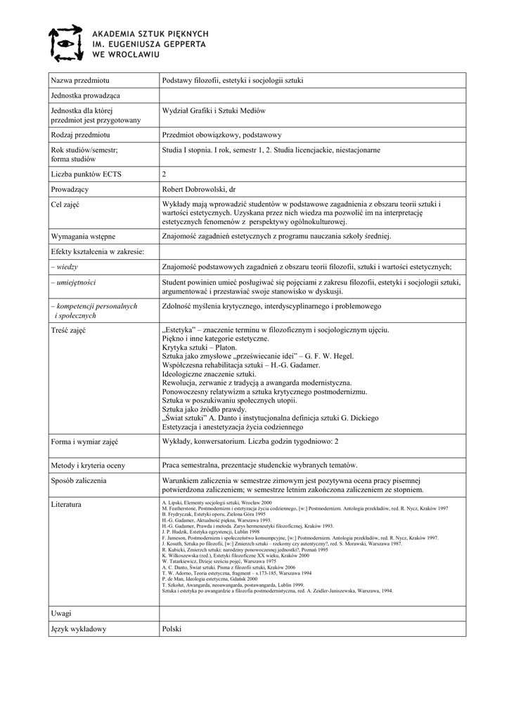 Nazwa przedmiotu Podstawy filozofii, estetyki i socjologii sztuki Jednostka prowadząca Jednostka dla której przedmiot jest przygotowany Wydział Grafiki i Sztuki Mediów Rodzaj przedmiotu Przedmiot obowiązkowy, podstawowy Rok studiów/semestr; forma studiów Studia I stopnia. I rok, semestr 1, 2. Studia licencjackie, niestacjonarne Liczba punktów ECTS 2 Prowadzący Robert Dobrowolski, dr Cel zajęć Wykłady mają wprowadzić studentów w podstawowe zagadnienia z obszaru teorii sztuki i wartości estetycznych. Uzyskana przez nich wiedza ma pozwolić im na interpretację estetycznych fenomenów z perspektywy ogólnokulturowej. Wymagania wstępne Znajomość zagadnień estetycznych z programu nauczania szkoły średniej. Efekty kształcenia w zakresie: – wiedzy Znajomość podstawowych zagadnień z obszaru teorii filozofii, sztuki i wartości estetycznych; – umiejętności Student powinien umieć posługiwać się pojęciami z zakresu filozofii, estetyki i socjologii sztuki, argumentować i przestawiać swoje stanowisko w dyskusji. – kompetencji personalnych i społecznych Zdolność myślenia krytycznego, interdyscyplinarnego i problemowego Treść zajęć „Estetyka” – znaczenie terminu w filozoficznym i socjologicznym ujęciu. Piękno i inne kategorie estetyczne. Krytyka sztuki – Platon. Sztuka jako zmysłowe „przeświecanie idei” – G. F. W. Hegel. Współczesna rehabilitacja sztuki – H.-G. Gadamer. Ideologiczne znaczenie sztuki. Rewolucja, zerwanie z tradycją a awangarda modernistyczna. Ponowoczesny relatywizm a sztuka krytycznego postmodernizmu. Sztuka w poszukiwaniu społecznych utopii. Sztuka jako źródło prawdy. „Świat sztuki” A. Danto i instytucjonalna definicja sztuki G. Dickiego Estetyzacja i anestetyzacja życia codziennego Forma i wymiar zajęć Wykłady, konwersatorium. Liczba godzin tygodniowo: 2 Metody i kryteria oceny Praca semestralna, prezentacje studenckie wybranych tematów. Sposób zaliczenia Warunkiem zaliczenia w semestrze zimowym jest pozytywna ocena pracy pisemnej potwierdzona zaliczeniem; w semestrze letnim zakończona zaliczeniem ze stopniem. Literatura A. Lipski, Elementy socjologii sztuki, Wrocław 2000 M. Featherstone, Postmodernizm i estetyzacja życia codziennego, [w:] Postmodernizm. Antologia przekładów, red. R. Nycz, Kraków 1997 B. Frydryczak, Estetyki oporu, Zielona Góra 1995 H.-G. Gadamer, Aktualność piękna, Warszawa 1993. H.-G. Gadamer, Prawda i metoda. Zarys hermeneutyki filozoficznej, Kraków 1993. J. P. Hudzik, Estetyka egzystencji, Lublin 1998 F. Jameson, Postmodernizm i społeczeństwo konsumpcyjne, [w:] Postmodernizm. Antologia przekładów, red. R. Nycz, Kraków 1997. J. Kosuth, Sztuka po filozofii, [w:] Zmierzch sztuki – rzekomy czy autentyczny?, red. S. Morawski, Warszawa 1987. R. Kubicki, Zmierzch sztuki: narodziny ponowoczesnej jednostki?, Poznań 1995 K. Wilkoszewska (red.), Estetyki filozoficzne XX wieku, Kraków 2000 W. Tatarkiewicz, Dzieje sześciu pojęć, Warszawa 1975 A. C. Danto, Świat sztuki. Pisma z filozofii sztuki, Kraków 2006 T. W. Adorno, Teoria estetyczna, fragment – s.173-185, Warszawa 1994 P. de Man, Ideologia estetyczna, Gdańsk 2000 T. Szkołut, Awangarda, neoawangarda, postawangarda, Lublin 1999. Sztuka i estetyka po awangardzie a filozofia postmodernistyczna, red. A. Zeidler-Janiszewska, Warszawa, 1994. Uwagi Język wykładowy Polski