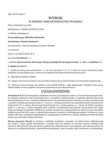 Sygn. akt IC 1499/12 WYROK W IMIENIU RZECZYPOSPOLITEJ POLSKIEJ Dnia 20 listopada 2014 roku Sąd Rejonowy w Kłodzku Wydział I Cywilny w składzie następującym: Przewodniczący: SSR Eliza Skotnicka Protokolant: Damian Szabunio po rozpoznaniu w dniu 18 listopada 2014 roku w Kłodzku na rozprawie sprawy z powództwa P. Ś., T. J. przeciwko Powiatowi (...) z udziałem interwenienta ubocznego, który przystąpił do strony pozwanej - (...)S.A. z siedzibą w W. o zapłatę 20 000 zł I. zasądza od strony pozwanej Powiatu (...) na rzecz powodów P. Ś. i T. J. kwotę 16 700,00 (szesnaście tysięcy siedemset 00/100) złotych wraz z ustawowymi odsetkami liczonymi od dnia 29 stycznia 2013r.; II. dalej idące powództwo oddala; III. zasądza od strony pozwanej na rzecz powodów kwotę 3 603,91 złotych tytułem zwrotu kosztów postępowania; IV. nakazuje stronie pozwanej, aby uiściła na rzecz Skarbu Państwa – Sądu Rejonowego w Kłodzku kwotę 135,05 złotych tytułem zwrotu wydatków tymczasowo poniesionych przez Skarb Państwa. UZASADNIENIE Powodowie P. Ś.i T. J.domagali się zasądzenia od strony pozwanej kwoty 20000,- zł wraz kosztami postępowania. Na ostatniej rozprawie w dniu 18 listopada 2014 r. powodowie wnieśli ponadto o zasądzenie odsetek ustawowych liczonych od kwoty 20 000,- zł od dnia wniesienia pozwu. W uzasadnieniu pozwu wskazano, że w dniu 15 sierpnia 2012 r. powód P. Ś.jechał samochodem marki F. (...)nr rej. (...), którego powodowie są współwłaścicielami z kierunku K.do miejscowości W.i w miejscu skrzyżowania drogi krajowej nr(...)z drogą gminną nr (...)doszło do kolizji z pojazdem marki V. (...)nr rej. (...), który niespodziewanie wyjechał z niewidocznej drogi gminnej. Droga gminna jest wąską droga prowadzącą do ogródków działkowych, zupełnie niewidoczną z drogi powiatowej, stąd nawet przy niewielkiej prędkości powód nie był w stanie w odpowiednim momencie zauważyć wyjeżdżającego pojazdu i wyhamować, chcąc uniknąć zderzenia z podjazdem nadjeżdżającym z drogi gminnej, wjechał w rów i skarpę. Zdaniem powodów do kolizji doszło z powodu braku oznakowania dróg. Strona pozwana Powiat (...)wniosła o oddalenie powództwa zarzucając, że żądana kwota odszkodowania nie została w żaden sposób udowodniona, a ponadto brak jest podstaw by pozwaną obarczać skutkami tego zdarzenia. Skrzyżowanie dróg powiatowej i gminnej jest skrzyżowaniem równorzędnym, czyli skrzyżowaniem, na którym nie wyróżniono kierunku z pierwszeństwem przejazdu, zatem wszystkie wloty traktowane są równorzędnie, a pierwszeństwo przejazdu określone jest na zasadzie prawej strony. Skrzyżowanie równorzędne może nie być dodatkowo oznakowane lub jeśli takiego skrzyżowania kierowca mógłby się nie spodziewać oznakowane znakiem ostrzegawczym A-5. Skrzyżowania równorzędne często występują w strefach ruchu uspokojonego, ponieważ wpływają na ograniczenie prędkości pojazdów. Takim jest skrzyżowanie, na którym doszło do zdarzenia w dniu 15 sierpnia 2012r. Powód P. Ś.jadąc z kierunku K.do miejscowości W.drogą powiatową nr (...)wlot drogi gminnej nr (...)miał po prawej stronie, co zgodnie z ogólną zasadą powoduje, że powinien ustąpić pierwszeństwa pojazdowi wyjeżdżającemu z drogi gminnej. Ponadto zdaniem pozwanej zgodnie z art. 25 ust. 1 ustawy prawo o ruchu drogowym kierujący pojazdem, zbliżając się do skrzyżowania jest obowiązany zachować szczególną ostrożność ustąpić pierwszeństwa pojazdowi nadjeżdżającemu z prawej strony. Zdaniem pozwanej brak jest po jej stronie bezprawnego działania lub zaniechania, gdyż położenie opisanego skrzyżowania, jego kategoria, nie nakładają na pozwanego obowiązków, których by pozwana nie wykonała. Przyczyną zdarzenia był sposób prowadzenia pojazdu przez powoda P. Ś., a w konsekwencji jego zawinienie. Powodowie w piśmie z dnia 13 czerwca 2013r. wskazali, że po zaistniałym zdarzeniu zarządca umieścił oznakowania pionowe na obu krzyżujących się drogach, przyjmując, że droga powiatowa jest drogą główną, a droga gminna podporządkowaną. W związku z tym powód zażądał, aby strona pozwana przedłożyła zatwierdzony i obowiązujący plan organizacji ruchu na skrzyżowaniu dróg powiatowej nr (...) z gminną nr (...). W odpowiedzi na zobowiązanie Sądu, strona pozwana w piśmie z dnia 9 sierpnia 2013r. wskazała, że skrzyżowanie dróg powiatowej nr (...)z gminną nr (...)w miejscowości W.nie ma zatwierdzonego planu organizacji ruchu. Skrzyżowanie to jako skrzyżowanie dróg równorzędnych nie wymaga dodatkowego oznakowania. Strona pozwana w piśmie z dnia 12 września 2013r. na wezwanie Sądu odpowiedziała, że po doręczeniu pozwanej w dniu 29 stycznia 2013r. odpisu pozwu pozwana skierowała służby drogowe na miejsce zdarzenia. Służby miały stwierdzić w terenie, czy w miejscu zdarzenia jest oznakowanie pionowe lub poziome. Niezrozumienie polecenia lub brak jego precyzji spowodował, że ustawiono znaki pionowe na wyżej wymienionym skrzyżowaniu. Interwenient uboczny, który przystąpił do strony pozwanej (...)S.A. z siedzibą w W.wniósł o oddalenie powództwa z argumentacją analogiczną do zarzutów strony pozwanej. Sąd ustalił następujący stan faktyczny: Powód P. Ś.w dniu 15 sierpnia 2012r., ok. godziny 20 – 21 jechał samochodem marki F. (...)nr rej.(...), drogą powiatową nr (...)z miejscowości K.w kierunku W.. Powód nie znał drogi, którą jechał. Droga była nierówna i w złym stanie technicznym, po obu stronach pobocza były skarpy porośnięte krzewami. Przed skrzyżowaniem drogi powiatowej nr (...)z drogą gminną nr (...)był łuk i spad. Widoczność na tym skrzyżowaniu była bardzo ograniczona do ok. 20m. Skrzyżowanie nie było oznakowane. Powód jechał z góry, nie wiedział, że zbliża się do skrzyżowania z droga gminną, to skrzyżowanie nie było w ogóle widoczne. Z drogi gminnej 