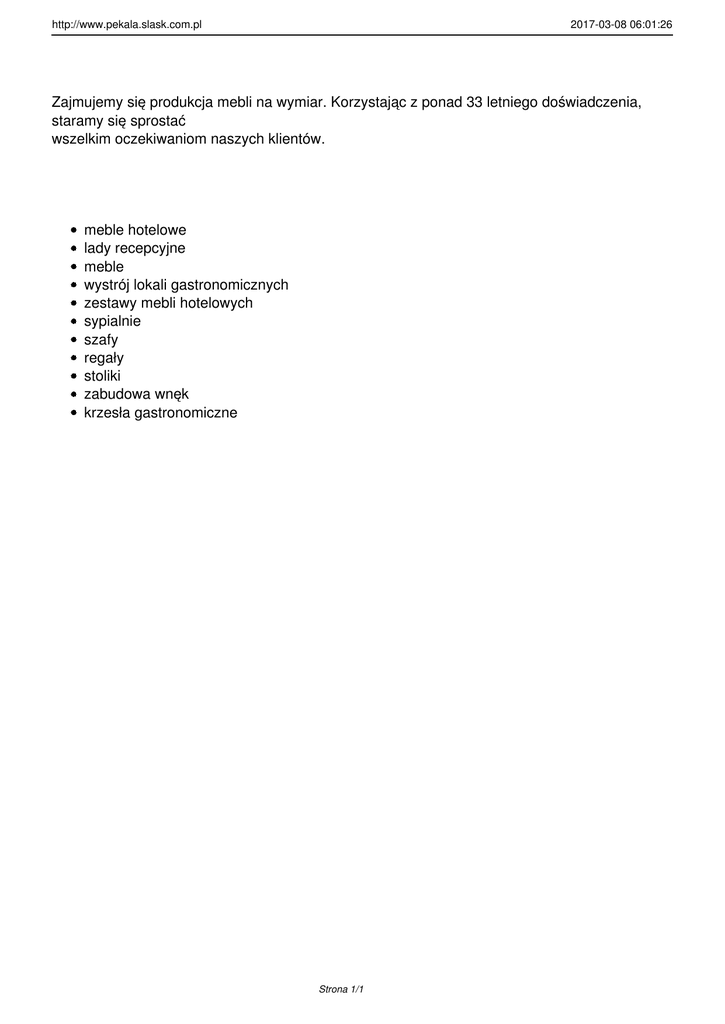 http://www.pekala.slask.com.pl 2017-03-08 06:01:26 Zajmujemy się produkcja mebli na wymiar. Korzystając z ponad 33 letniego doświadczenia, staramy się sprostać wszelkim oczekiwaniom naszych klientów. meble hotelowe lady recepcyjne meble wystrój lokali gastronomicznych zestawy mebli hotelowych sypialnie szafy regały stoliki zabudowa wnęk krzesła gastronomiczne Strona 1/1