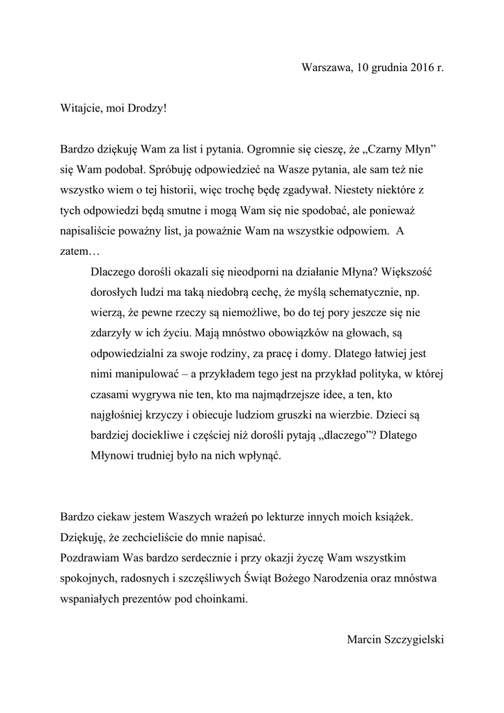 Warszawa, 10 grudnia 2016 r. Witajcie, moi Drodzy! Bardzo dziękuję Wam za list i pytania. Ogromnie się cieszę, że „Czarny Młyn” się Wam podobał. Spróbuję odpowiedzieć na Wasze pytania, ale sam też nie wszystko wiem o tej historii, więc trochę będę zgadywał. Niestety niektóre z tych odpowiedzi będą smutne i mogą Wam się nie spodobać, ale ponieważ napisaliście poważny list, ja poważnie Wam na wszystkie odpowiem. A zatem… Dlaczego dorośli okazali się nieodporni na działanie Młyna? Większość dorosłych ludzi ma taką niedobrą cechę, że myślą schematycznie, np. wierzą, że pewne rzeczy są niemożliwe, bo do tej pory jeszcze się nie zdarzyły w ich życiu. Mają mnóstwo obowiązków na głowach, są odpowiedzialni za swoje rodziny, za pracę i domy. Dlatego łatwiej jest nimi manipulować – a przykładem tego jest na przykład polityka, w której czasami wygrywa nie ten, kto ma najmądrzejsze idee, a ten, kto najgłośniej krzyczy i obiecuje ludziom gruszki na wierzbie. Dzieci są bardziej dociekliwe i częściej niż dorośli pytają „dlaczego”? Dlatego Młynowi trudniej było na nich wpłynąć. Bardzo ciekaw jestem Waszych wrażeń po lekturze innych moich książek. Dziękuję, że zechcieliście do mnie napisać. Pozdrawiam Was bardzo serdecznie i przy okazji życzę Wam wszystkim spokojnych, radosnych i szczęśliwych Świąt Bożego Narodzenia oraz mnóstwa wspaniałych prezentów pod choinkami. Marcin Szczygielski