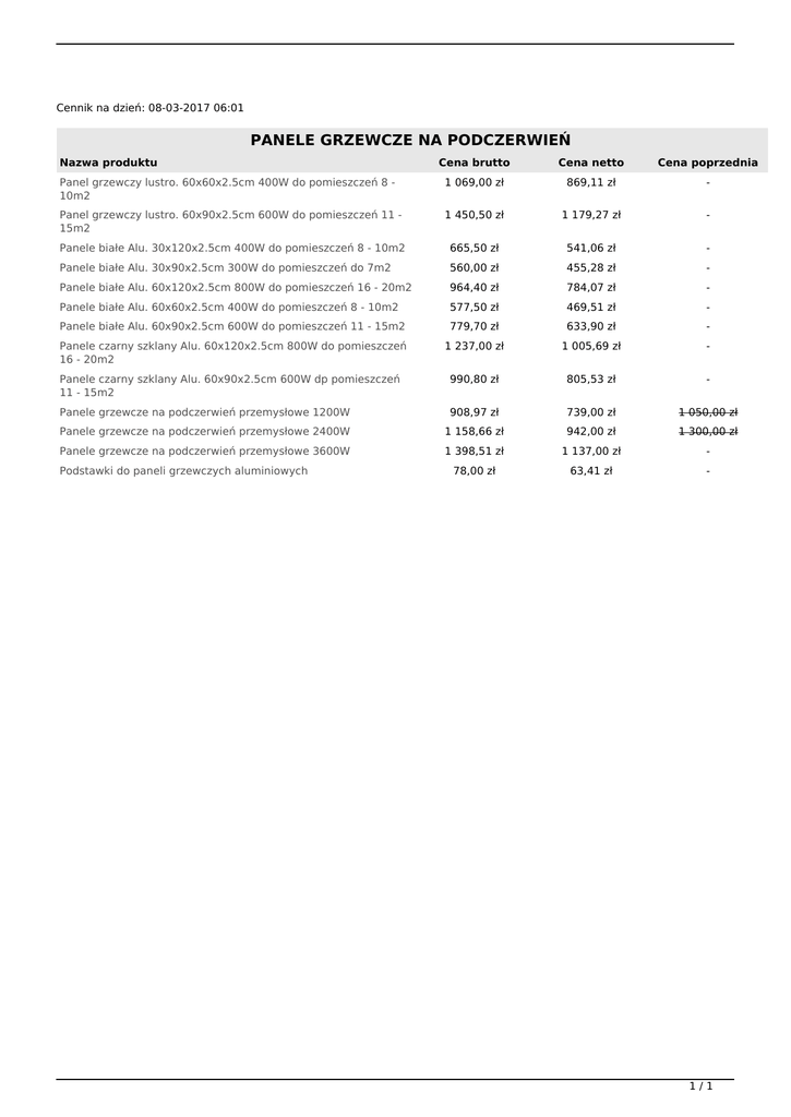 Cennik na dzień: 08-03-2017 06:01 PANELE GRZEWCZE NA PODCZERWIEŃ Nazwa produktu Cena brutto Cena netto Cena poprzednia Panel grzewczy lustro. 60x60x2.5cm 400W do pomieszczeń 8 10m2 1 069,00 zł 869,11 zł - Panel grzewczy lustro. 60x90x2.5cm 600W do pomieszczeń 11 15m2 1 450,50 zł 1 179,27 zł - Panele białe Alu. 30x120x2.5cm 400W do pomieszczeń 8 - 10m2 665,50 zł 541,06 zł - Panele białe Alu. 30x90x2.5cm 300W do pomieszczeń do 7m2 560,00 zł 455,28 zł - Panele białe Alu. 60x120x2.5cm 800W do pomieszczeń 16 - 20m2 964,40 zł 784,07 zł - Panele białe Alu. 60x60x2.5cm 400W do pomieszczeń 8 - 10m2 577,50 zł 469,51 zł - Panele białe Alu. 60x90x2.5cm 600W do pomieszczeń 11 - 15m2 779,70 zł 633,90 zł - Panele czarny szklany Alu. 60x120x2.5cm 800W do pomieszczeń 16 - 20m2 1 237,00 zł 1 005,69 zł - Panele czarny szklany Alu. 60x90x2.5cm 600W dp pomieszczeń 11 - 15m2 990,80 zł 805,53 zł - Panele grzewcze na podczerwień przemysłowe 1200W 908,97 zł 739,00 zł 1 050,00 zł Panele grzewcze na podczerwień przemysłowe 2400W 1 158,66 zł 942,00 zł 1 300,00 zł Panele grzewcze na podczerwień przemysłowe 3600W 1 398,51 zł 1 137,00 zł - 78,00 zł 63,41 zł - Podstawki do paneli grzewczych aluminiowych 1/1 Powered by TCPDF (www.tcpdf.org)