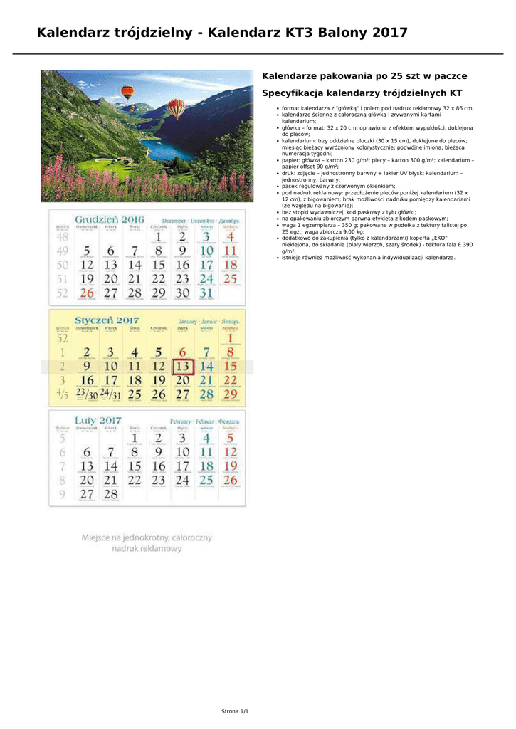 Kalendarz trójdzielny - Kalendarz KT3 Balony 2017 Kalendarze pakowania po 25 szt w paczce Specyfikacja kalendarzy trójdzielnych KT format kalendarza z "główką" i polem pod nadruk reklamowy 32 x 86 cm; kalendarze ścienne z całoroczną główką i zrywanymi kartami kalendarium; główka – format: 32 x 20 cm; oprawiona z efektem wypukłości, doklejona do pleców; kalendarium: trzy oddzielne bloczki (30 x 15 cm), doklejone do pleców; miesiąc bieżący wyróżniony kolorystycznie; podwójne imiona, bieżąca numeracja tygodni; papier: główka – karton 230 g/m²; plecy – karton 300 g/m²; kalendarium – papier offset 90 g/m²; druk: zdjęcie – jednostronny barwny + lakier UV błysk; kalendarium – jednostronny, barwny; pasek regulowany z czerwonym okienkiem; pod nadruk reklamowy: przedłużenie pleców poniżej kalendarium (32 x 12 cm), z bigowaniem; brak możliwości nadruku pomiędzy kalendariami (ze względu na bigowanie); bez stopki wydawniczej, kod paskowy z tyłu główki; na opakowaniu zbiorczym barwna etykieta z kodem paskowym; waga 1 egzemplarza – 350 g; pakowane w pudełka z tektury falistej po 25 egz.; waga zbiorcza 9.00 kg; dodatkowo do zakupienia (tylko z kalendarzami) koperta „EKO” nieklejona, do składania (biały wierzch, szary środek) - tektura fala E 390 g/m²; istnieje również możliwość wykonania indywidualizacji kalendarza. Strona 1/1 Powered by TCPDF (www.tcpdf.org)