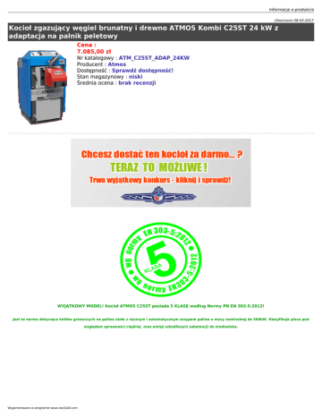 Informacje o produkcie Utworzono 08-03-2017 Kocioł zgazujący węgiel brunatny i drewno ATMOS Kombi C25ST 24 kW z adaptacja na palnik peletowy Cena : 7.085,00 zł Nr katalogowy : ATM_C25ST_ADAP_24KW Producent : Atmos Dostępność : Sprawdź dostępność! Stan magazynowy : niski Średnia ocena : brak recenzji WYJĄTKOWY MODEL! Kocioł ATMOS C25ST posiada 5 KLASĘ według Normy PN EN 303-5:2012! Jest to norma dotycząca kotłów grzewczych na paliwa stałe z ręcznym i automatycznym zasypem paliwa o mocy nominalnej do 500kW. Klasyfikuje piece pod względem sprawności cieplnej oraz emisji szkodliwych substancji do środowiska. Wygenerowano w programie www.oscGold.com Kotły ATMOS Kombi charakteryzują się specjalnym paleniskiem z tylnym doprowadzeniem wstępnie podgrzanego powietrza pierwotnego, rusztem obrotowym chłodzonym przez przepływające jego wnętrzem powietrze wtórne. Centralnie umieszczony zgazujący ruszt obrotowy zastępuje dyszę ceramiczną. Dolna część kotła wyposażona jest w kulistą kształtkę ceramiczną. Korpus kotła jest spawany z wysokiej jakości blachy stalowej o grubości od 6 mm do 3 mm. Model C25ST posiada dodatkowy wymiennik w kanale spalinowym co pozwala na osiąganie jeszcze wyższej sprawności! ATMOS C z adaptacją na palnik! W tej ofercie kocioł ponadto przygotowany jest do zamontowania palnika na pelet firmy ATMOS lub palnika innego producenta (tzw. kocioł z adaptacją na palnik). Oznacza to, że z kotła możemy korzystać w klasyczny sposób (zgazując w nim węgiel/drewno) ale w razie potrzeby górne drzwiczki przygotowane są już pod montaż palnika na pellet! W przypadku opalania węglem/drewnem, zawsze trzeba wyjąć palnik z drzwiczek kotła i zaślepić otwór Informacje o produkcie dostarczonym wieczkiem z izolacją cieplną. Kocioł zgazujący nowej generacji ATMOS Kombi, wnosi nowe spojrzenie na proces spalania węgla w kombinacji z drewnem. Kombinowany kocioł czyni z węgla paliwo, które ma przyszłość. Jeżeli nie ma wystarczającej ilości węgla, można spalać drewno, natomiast jeżeli nie ma wystarczającej ilości drewna, można spalać węgiel. Można również spalać w kotle oba paliwa jednocześnie. Płomień w dolnej komorze spalania EKOLOGIA: Dzięki zgazowaniu węgla w nowym kotle ATMOS Kombi, osiągnięto niski poziom emisji zanieczyszczeń. Płynna regulacja mocy w połączeniu z wysoką sprawnością pozwala osiągnąć znaczne oszczędności opału. Odwrotne spalanie oraz ceramiczna komora spalania, umożliwiają w praktyce doskonałe spalanie z minimum szkodliwych wyziewów. Kocioł pracujący z mocą nominalną gwarantuje osiąganie najwyższych parametrów ekologicznych. Kotły zaliczają się według normy PN EN 303-5 do 5 klasy. PRACA I KONSERWACJA: Zalecanym paliwem jest węgiel brunatny orzech 1 oraz suche polana drewna. Paliwem zastępczym mogą być pozostałe rodzaje węgla brunatnego, brykiety drzewne oraz brykiety ze słomy, zrębków i trocin. Zalecamy spalanie kombinowane drewna i węgla brunatnego razem. Paliwo dokłada się średnio 2 do 4 razy w ciągu dnia, w zależności od zastosowanego paliwa. Popiół wystarczy wybrać co 1 do 7 dni, w zależności od zastosowanego rodzaju paliwa. Wentylator wyciągowy ułatwia rozpalanie i ogranicza do minimum ilość dymu przedostającego się do kotłowni. Wygenerowano w programie www.oscGold.com INSTALACJA: LADDOMAT (o cenę proszę pytać!) Kotły ATMOS muszą być podłączone przez LADDOMAT albo zawór termoregulacyjny ESBE, w celu osiągnięcia minimalnej temperatury wody powrotnej do kotła na poziomie 65'C. W związku z tym temperatura kotła musi być utrzymywana na stałym poziomie 80-90'C. ZABEZP.TERM.KOTŁA STS.S20,3/4"97C 1,3M (o cenę proszę pytać) Termiczny upustowy zawór bezpieczeństwa STS.S 20, z kapilara L=1,3m, sonda w osłonie 145 mm z gwintem zewnętrznym 1/2 Ponadto wszystkie kotły są dostarczane z pętlą chłodzenia uniemożliwiającą przegrzanie. Aby jednak zadziałała ona tak jak powinna należy zainstalować ją wraz z termicznym upustowym zaworem bezpieczeństwa (zdjęcie powyżej)! Zalecamy też instalację kotła z akumulacją ciepłej wody! Informacje o produkcie Wentylator odciągu minimalizuje dymienie podczas dokładania i pracy kotła Pętla chłodząca przeciw przegrzaniu DANE TECHNICZNE: - moc (kW): 24 - waga kotła (kg): 379 - pojemność komory załadowczej (kg): 100 - wysokość (mm): 1435 - szerokość (mm): 758 - głębokość (mm): 675 - klasa kotła: 5 GWARANCJA: 2 lata ŚWIADECTWA I CERTYFIKATY: Wszystkie kotły ATMOS posiadają odpowiednie certyfikaty dla poszczególnych krajów: SZÚ Brno, TÜV München - Niemcy, Litwa, Ukraina, Szwecja SP, Polska, Austria, Słowacja, Węgry, ČSN EN 303 - 5. Dodatkowe informacje na temat produktów firmy ATMOS: www.atmos.cz/pl Wygenerowano w programie www.oscGold.com