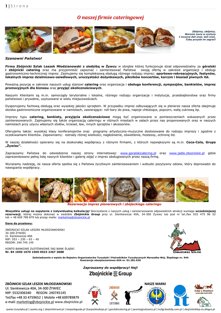 1|Strona O naszej firmie cateringowej Zbójnicy, zbójnicy, Warzom owce w zyntycy I muzyce dali znać, dali znać, Coby przysła im zagrać! Szanowni Państwo! Firma Zbójnicki Szlak Leszek Młodzianowski z siedzibą w Żywcu w obrębie której funkcjonuje dział odpowiedzialny za góralski i zbójnicki catering oraz ma przyjemność zapoznać i zainteresować Państwa swoją ofertą w zakresie organizacji i obsługi gastronomiczno-technicznej imprez. Zajmujemy się kompleksową obsługą różnego rodzaju imprez: sportowo-rekreacyjnych, festynów, lokalnych imprez dzielnicowo-osiedlowych, uroczystości dożynkowych, pikników koncertów, karczm i biesiad piwnych itd. Poważną pozycję w zakresie naszych usług stanowi catering oraz organizacja i obsługa konferencji, sympozjów, bankietów, imprez promocyjnych dla biznesu oraz przyjęć okolicznościowych. Naszymi Klientami są m.in. samorządy terytorialne i lokalne, różnego rodzaju organizacje i instytucje, przedsiębiorstwa oraz firmy państwowe i prywatne, usytuowane w wielu miejscowościach. Dysponujemy fachową obsługą oraz wysokiej jakości sprzętem. W przypadku imprez odbywających się w plenerze nasza oferta obejmuje stoiska gastronomiczne organizowane w namiotach, zawierające: roll-bary do piwa, napoje chłodzące, popcorn, watę cukrową itp. Imprezy typu catering, bankiety, przyjęcia okolicznościowe mogą być organizowane w pomieszczeniach wskazanych przez zainteresowanych. Zajmujemy się także organizacją cateringu w różnych miastach w salach przez nas proponowanych oraz w naszych namiotach przy użyciu własnych stołów, krzeseł, ław, innych sprzętów i akcesoriów. Oferujemy także: wysokiej klasy konferansjerów oraz programy artystyczno-muzyczne dostosowane do rodzaju imprezy i zgodnie z oczekiwaniami Klientów. Zapewniamy: estrady różnej wielkości, nagłośnienie, oświetlenie, hostessy, ochronę itd. W naszej działalności opieramy się na doskonałej współpracy z różnymi firmami, z których największymi są m.in. Coca-Cola, Grupa „Żywiec”. Zapraszamy Państwa do odwiedzenia naszej strony internetowej: www.goralskicatering.pl oraz zaprezentowano pełną listę naszych klientów i galerię zdjęć z imprez obsługiwanych przez naszą firmę. www.jadlo.zbojnickie.pl gdzie Wyrażamy nadzieję, że nasza oferta spotka się z Państwa życzliwym zainteresowaniem i wzbudzi pozytywny odzew, który doprowadzi do nawiązania współpracy. Rezerwacja imprez plenerowych i zbójeckiego cateringu Wszystkie usługi na zapytanie z indywidualną kalkulacją! Skorzystanie z naszych usług i zarezerwowanie odpowiednich atrakcji wymaga wcześniejszej rezerwacji, której można dokonać w siedzibie Zbójnickie Group przy ul. Sienkiewicza 40A, 34-300 Żywiec lub pod nr tel./fax 033 475 96 52 lub + 48 609 789 879 lub pisząc maila: [email protected] Dane do przelewu: ZBÓJNICKI SZLAK LESZEK MŁODZIANOWSKI 34-300 ŻYWIEC Ul. Sienkiewicza 40A NIP: 553 – 230 – 63 – 40 REGON: 240 745 145 KONTO BANKOWE ZŁOTÓWKOWE ING BANK ŚLĄSKI Nr. 84 1050 1070 1000 0023 2267 3688 Zaświadczenie o wpisie do Rejestru Organizatorów Turystyki i Pośredników Turystycznych Marszałka Woj. Śląskiego nr. 944 Gwarancja ubezpieczeniowa AXA nr. 01.281.630 Zapraszamy do współpracy! Hej! ZBÓJNICKI SZLAK LESZEK MŁODZIANOWSKI Ul. Sienkiewicza 40A, 34-300 ŻYWIEC NIP: 5532306340 REGON: 240745145 Tel/fax +48 33 4759652 | Mobile +48 609789879 e-mail: [email protected] www.zbojnickie.pl NASZE MARKI zywiec.turystyka.pl | zywiec.org | zbojnickitravel.pl | karpackigazda.pl |karpackiezboje.pl | goralskicatering.pl | jacentyignatowicz.pl | kuligi.beskidy.com.pl | zbojnickisklep.na.allegro.pl