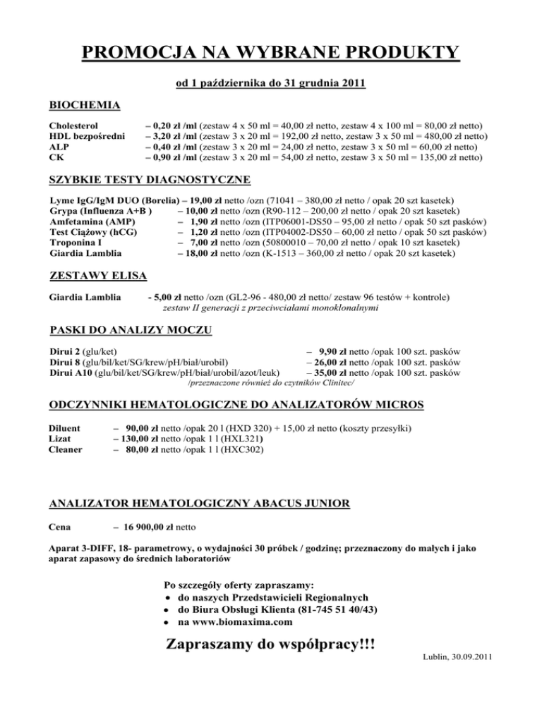 PROMOCJA NA WYBRANE PRODUKTY od 1 października do 31 grudnia 2011 BIOCHEMIA Cholesterol HDL bezpośredni ALP CK – 0,20 zł /ml (zestaw 4 x 50 ml = 40,00 zł netto, zestaw 4 x 100 ml = 80,00 zł netto) – 3,20 zł /ml (zestaw 3 x 20 ml = 192,00 zł netto, zestaw 3 x 50 ml = 480,00 zł netto) – 0,40 zł /ml (zestaw 3 x 20 ml = 24,00 zł netto, zestaw 3 x 50 ml = 60,00 zł netto) – 0,90 zł /ml (zestaw 3 x 20 ml = 54,00 zł netto, zestaw 3 x 50 ml = 135,00 zł netto) SZYBKIE TESTY DIAGNOSTYCZNE Lyme IgG/IgM DUO (Borelia) – 19,00 zł netto /ozn (71041 – 380,00 zł netto / opak 20 szt kasetek) Grypa (Influenza A+B ) – 10,00 zł netto /ozn (R90-112 – 200,00 zł netto / opak 20 szt kasetek) – 1,90 zł netto /ozn (ITP06001-DS50 – 95,00 zł netto / opak 50 szt pasków) Amfetamina (AMP) Test Ciążowy (hCG) – 1,20 zł netto /ozn (ITP04002-DS50 – 60,00 zł netto / opak 50 szt pasków) Troponina I – 7,00 zł netto /ozn (50800010 – 70,00 zł netto / opak 10 szt kasetek) – 18,00 zł netto /ozn (K-1513 – 360,00 zł netto / opak 20 szt kasetek) Giardia Lamblia ZESTAWY ELISA Giardia Lamblia - 5,00 zł netto /ozn (GL2-96 - 480,00 zł netto/ zestaw 96 testów + kontrole) zestaw II generacji z przeciwciałami monoklonalnymi PASKI DO ANALIZY MOCZU Dirui 2 (glu/ket) Dirui 8 (glu/bil/ket/SG/krew/pH/biał/urobil) Dirui A10 (glu/bil/ket/SG/krew/pH/biał/urobil/azot/leuk) – 9,90 zł netto /opak 100 szt. pasków – 26,00 zł netto /opak 100 szt. pasków – 35,00 zł netto /opak 100 szt. pasków /przeznaczone również do czytników Clinitec/ ODCZYNNIKI HEMATOLOGICZNE DO ANALIZATORÓW MICROS Diluent Lizat Cleaner – 90,00 zł netto /opak 20 l (HXD 320) + 15,00 zł netto (koszty przesyłki) – 130,00 zł netto /opak 1 l (HXL321) – 80,00 zł netto /opak 1 l (HXC302) ANALIZATOR HEMATOLOGICZNY ABACUS JUNIOR Cena – 16 900,00 zł netto Aparat 3-DIFF, 18- parametrowy, o wydajności 30 próbek / godzinę; przeznaczony do małych i jako aparat zapasowy do średnich laboratoriów Po szczegóły oferty zapraszamy: do naszych Przedstawicieli Regionalnych do Biura Obsługi Klienta (81-745 51 40/43) na www.biomaxima.com Zapraszamy do współpracy!!! Lublin, 30.09.2011