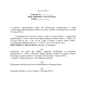 -projektUchwała Nr ...................... Rady Miejskiej w Starym Sączu z dnia .......................... w sprawie: zatwierdzenia taryfy dla zbiorowego zaopatrzenia w wodę i zbiorowego odprowadzenia ścieków na okres od dnia 1 kwietnia 2014 do dnia 31 marca 2015 r. Na podstawie art. 24 ust.1 ustawy z dnia 7 czerwca 2001 r. o zbiorowym zaopatrzeniu w wodę i zbiorowym odprowadzeniu ścieków (Dz.U. z 2006 r. Nr 123 poz. 858 ze zm. ) , art. 18 ust. 2 pkt 15 ustawy z dnia 8 marca 1990 r. o samorządzie gminnym (tj. Dz. U. z 2013 r. poz. 594 z późn. zm.), Rada Miejska w Starym Sączu uchwala, co następuje: §1 Zatwierdza się taryfy dla Spółki „Sądeckie Wodociągi” za zbiorowe zaopatrzenie w wodę i zbiorowe odprowadzenie ścieków na terenie Gminy Stary Sącz na okres od dnia 1 kwietnia 2014 do dnia 31 marca 2015r – zgodnie z załącznikiem nr 1 do niniejszej uchwały. §2 Wykonanie uchwały powierza się Burmistrzowi Starego Sącza §3 Uchwała wchodzi w życie z dniem 1 kwietnia 2014 r. Uzasadnienie Taryfy zostały opracowane zgodnie z przepisami ustawy z dnia 7 czerwca 2001r. o zbiorowym zaopatrzeniu w wodę i zbiorowym odprowadzeniu ścieków (Dz. U. z 2006 r. Nr 123 poz. 858 ze zm.) oraz rozporządzeniem Ministra Budownictwa z dnia 28 czerwca 2006 r. w sprawie określenia taryf, wzoru wniosku o zatwierdzenie taryf oraz warunków rozliczeń za zbiorowe zaopatrzenie w wodę i zbiorowe odprowadzenie ścieków (Dz. u. z 2006 r. Nr 127 poz. 886) i przedłożone do zatwierdzenia przez Spółkę z o.o. „Sądeckie Wodociągi”, która prowadzi na terenie gminy Stary Sącz działalność w zakresie zbiorowego zaopatrzenia w wodę i zbiorowego odprowadzenia ścieków. Spółka zaplanowała koszty eksploatacji i utrzymania urządzeń wodociągowych i urządzeń kanalizacyjnych na okres obowiązywania taryf, tj. od 1.04.2013 – 31.03.2014, na podstawie kosztów roku obrachunkowego (2013) powiększonych o wskaźniki wzrostu cen produkcji przemysłowej (2,4%) oraz wielkość średniorocznego wskaźnika towarów i usług konsumpcyjnych (2,8%) W taryfie uwzględniono również kwotę obsługi odsetek od kredytu zaciągniętego na inwestycje z Funduszu Spójności. Przyjęto taryfę dwuczłonową uwzględniająca miesięczną opłatę abonamentową oraz ceny za 1m3 wody oraz 1 m3 ścieków, dla trzech grup odbiorców: gospodarstw domowych, pozostałych odbiorców, przemysł. Wprowadzone nowe taryfy za wodę przedstawiają się następująco: - dla gospodarstw domowych 5,23 zł/m3 netto wzrost o 0,14 zł netto, - pozostali odbiorcy 5,25 zł/m3 netto, wzrost 0,15 zł netto, - przemysł 5,30 zł/m3 netto, wzrost 0,04 zł, - stawka opłaty abonamentowej 4,09 zł netto, wzrost 0,11 zł netto, - stawka za odbiór ścieków 5,92 zł/m3 netto, obniżka 0,05 zł netto, - stawka opłaty abonamentowej 5,63 zł nett, obniżka 0,07 zł netto.