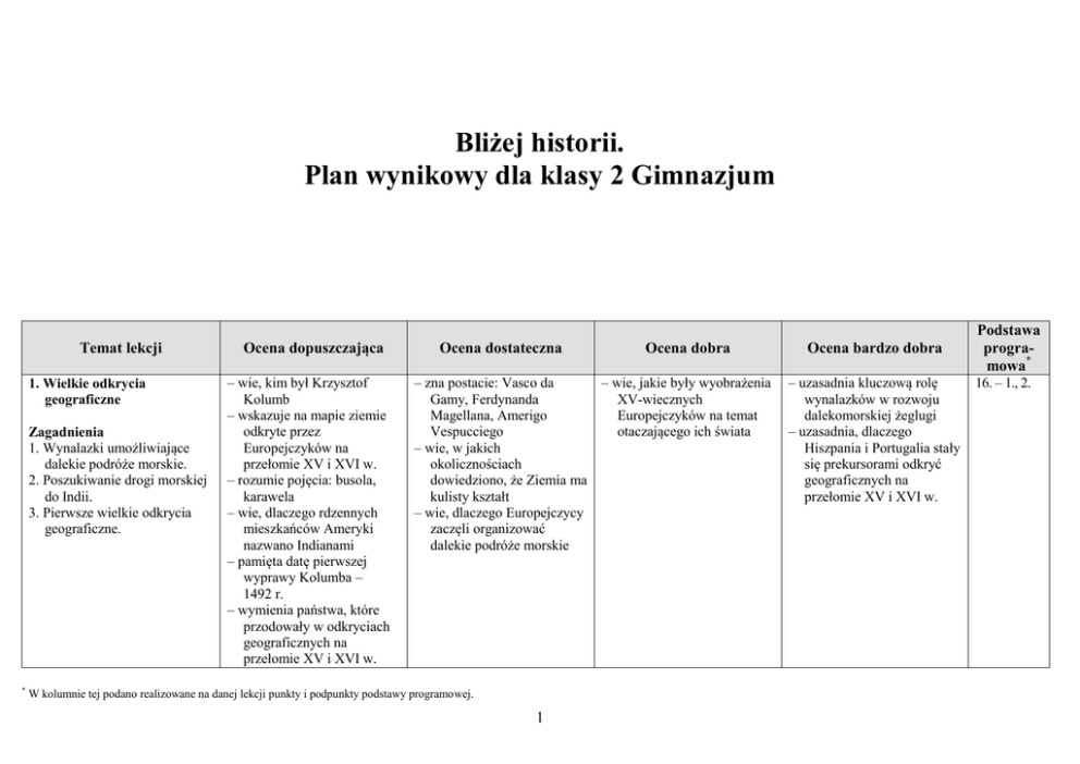 Bliżej historii. Plan wynikowy dla klasy 2 Gimnazjum Temat lekcji 1. Wielkie odkrycia geograficzne Zagadnienia 1. Wynalazki umożliwiające dalekie podróże morskie. 2. Poszukiwanie drogi morskiej do Indii. 3. Pierwsze wielkie odkrycia geograficzne. * Ocena dopuszczająca – wie, kim był Krzysztof Kolumb – wskazuje na mapie ziemie odkryte przez Europejczyków na przełomie XV i XVI w. – rozumie pojęcia: busola, karawela – wie, dlaczego rdzennych mieszkańców Ameryki nazwano Indianami – pamięta datę pierwszej wyprawy Kolumba – 1492 r. – wymienia państwa, które przodowały w odkryciach geograficznych na przełomie XV i XVI w. Ocena dostateczna Ocena dobra Ocena bardzo dobra – zna postacie: Vasco da Gamy, Ferdynanda Magellana, Amerigo Vespucciego – wie, w jakich okolicznościach dowiedziono, że Ziemia ma kulisty kształt – wie, dlaczego Europejczycy zaczęli organizować dalekie podróże morskie – wie, jakie były wyobrażenia XV-wiecznych Europejczyków na temat otaczającego ich świata – uzasadnia kluczową rolę wynalazków w rozwoju dalekomorskiej żeglugi – uzasadnia, dlaczego Hiszpania i Portugalia stały się prekursorami odkryć geograficznych na przełomie XV i XVI w. W kolumnie tej podano realizowane na danej lekcji punkty i podpunkty podstawy programowej. 1 Podstawa programowa* 16. – 1., 2. Temat lekcji 2. Konsekwencje wielkich odkryć geograficznych Zagadnienia 1. Majowie, Aztekowie, Inkowie i ich państwa. 2. Europejskie podboje i kolonie zamorskie. 3. Konsekwencje wielkich odkryć geograficznych dla Europy. 3. Kultura odrodzenia we Włoszech Zagadnienia 1. Włochy kolebką renesansu. 2. Charakterystyczne zjawiska kultury odrodzenia. 3. Najwybitniejsi twórcy włoskiego renesansu. Ocena dopuszczająca Ocena dobra Ocena bardzo dobra – wymienia cywilizacje prekolumbijskie oraz podaje ich osiągnięcia – rozumie pojęcia: konkwistador, towary kolonialne, dualizm gospodarczy – wylicza towary sprowadzane do Europy z kolonii – opowiada o działaniach konkwistadorów – charakteryzuje organizację państw Majów, Azteków i Inków – rozumie i omawia wpływ posiadania kolonii na gospodarkę państw europejskich – docenia osiągnięcia cywilizacji pozaeuropejskich i porównuje je z osiągnięciami cywilizacji europejskiej – wie, skąd wzięła się nazwa „Ameryka Łacińska” – rozumie, dlaczego konkwistadorom udało się w krótkim czasie podbić imperia indiańskie w Ameryce 16. – 2. – rozumie pojęcia: odrodzenie (renesans), humanizm, człowiek renesansu, mecenat – zna postacie: Leonarda da Vinci, Michała Anioła, Rafaela Santi oraz wymienia ich najwybitniejsze dzieła – wymienia cechy kultury renesansowej – wskazuje na mapie kolebkę odrodzenia – uzasadnia, dlaczego kultura renesansu narodziła się we Włoszech – porównuje kulturę epok renesansu i średniowiecza – rozumie, na czym polegało „odrodzenie” kultury antycznej w czasach renesansu – wyjaśnia źródła rozwoju kultury renesansowej we Włoszech 17. – 1., 2. – zna najwybitniejszych przedstawicieli europejskiego renesansu – rozumie pojęcie system heliocentryczny – rozpoznaje modele geocentryczny i heliocentryczny – rozumie znaczenie druku dla rozwoju kultury – rozumie znaczenie odkrycia dokonanego przez Mikołaja Kopernika – wyjaśnia, dlaczego dzieło O obrotach sfer niebieskich znalazło się na liście ksiąg zakazanych przez Kościół 17. – 2., 3. – wie, kto i kiedy wynalazł ruchomą czcionkę drukarską – opowiada o życiu Zagadnienia 1. Wynalazek druku. i dokonaniach Mikołaja 2. Wielcy humaniści europejscy. Kopernika 3. Przewrót kopernikański. 4. Renesans w Europie i przewrót kopernikański Ocena dostateczna Podstawa programowa 2 Temat lekcji 5. Początki reformacji Zagadnienia 1. Sytuacja Kościoła katolickiego w XV w. 2. Marcin Luter i jego nauka. 3. Powstanie i rozwój luteranizmu. 6. Rozwój reformacji Zagadnienia 1. Kalwinizm. 2. Wojny religijne we Francji. 3. Powstanie Kościoła anglikańskiego. 4. Inne wyznania protestanckie. 7. Reforma katolicka Zagadnienia 1. Sobór trydencki. 2. Powstanie i działalność zakonu jezuitów. 3. Konsekwencje reform chrześcijaństwa. Ocena dopuszczająca Ocena dostateczna Ocena dobra Ocena bardzo dobra Podstawa programowa – rozumie pojęcia: reformacja, – charakteryzuje główne sekularyzacja, luteranie, założenia luteranizmu protestanci – wyjaśnia, dlaczego Luter – zna postanowienia pokoju wystąpił z krytyką augsburskiego papiestwa – zna daty: wystąpienia Lutra, – wyjaśnia przyczyny wojen podpisania pokoju religijnych w Niemczech augsburskiego – porównuje główne założenia – rozumie wpływ sytuacji nauki głoszonej przez społeczno-politycznej zwolenników luteranizmu w Niemczech na rozwój oraz przez Kościół luteranizmu katolicki – rozumie i analizuje – opisuje cele i działania długofalowe znaczenie Marcina Lutra pokoju augsburskiego 18. – 1., 2. – wie, kim byli: Jan Kalwin, Henryk VIII – rozumie pojęcia: hugenoci, kalwinizm, anglikanizm, arianie – wymienia różne wyznania protestanckie – wie, co się wydarzyło w 1534 r. – przedstawia okoliczności powstania Kościoła anglikańskiego – charakteryzuje wojny religijne we Francji – porównuje podłoże społeczno-polityczne reformacji w Niemczech, Francji i Anglii – rozumie, dlaczego radykalni protestanci spotykali się z niechęcią ze strony przedstawicieli innych wyznań – udowadnia wpływ wydarzeń z XVI w. na dzisiejszą sytuację wyznaniową 18. – 2. – rozumie pojęcia: sobór trydencki, inkwizycja, jezuici, tolerancja religijna, kontrreformacja – zna postanowienia soboru trydenckiego – charakteryzuje działania podejmowane przez zakony w celu odbudowy pozycji katolicyzmu – wyjaśnia cele zwołania soboru trydenckiego – wskazuje postanowienia soboru trydenckiego służące wzmocnieniu katolicyzmu – wskazuje postanowienia soboru trydenckie