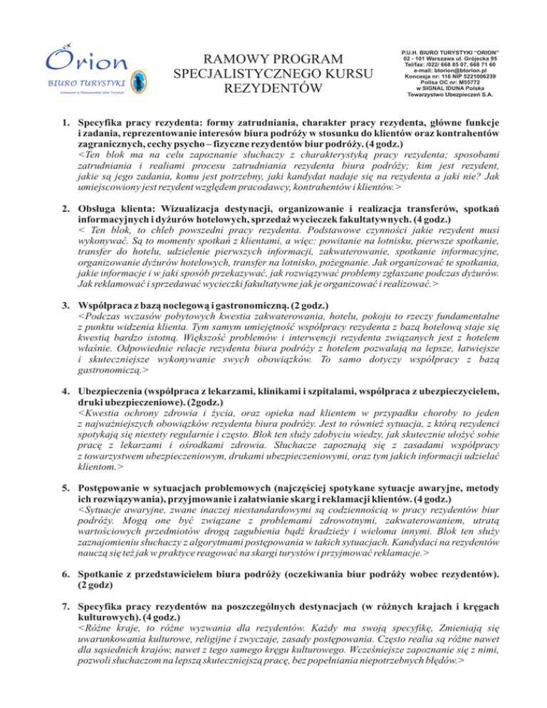 WAR SZA W S YKI C HA O F TO U W SA RISM W AR zrzeszone w Warszawskiej Izbie Turystyki IZBA ST RY TU BIURO TURYSTYKI KA M BE R RAMOWY PROGRAM SPECJALISTYCZNEGO KURSU REZYDENTÓW P.U.H. BIURO TURYSTYKI “ORION” 02 - 101 Warszawa ul. Grójecka 95 Tel/fax: /022/ 668 85 07, 668 71 60 e-mail: [email protected] Koncesja nr: 116 NIP 5221006239 Polisa OC nr: M55772 w SIGNAL IDUNA Polska Towarzystwo Ubezpieczeñ S.A. 1. Specyfika pracy rezydenta: formy zatrudniania, charakter pracy rezydenta, g³ówne funkcje i zadania, reprezentowanie interesów biura podró¿y w stosunku do klientów oraz kontrahentów zagranicznych, cechy psycho – fizyczne rezydentów biur podró¿y. (4 godz.) <Ten blok ma na celu zapoznanie s³uchaczy z charakterystyk¹ pracy rezydenta; sposobami zatrudniania i realiami procesu zatrudniania rezydenta biura podró¿y; kim jest rezydent, jakie s¹ jego zadania, komu jest potrzebny, jaki kandydat nadaje siê na rezydenta a jaki nie? Jak umiejscowiony jest rezydent wzglêdem pracodawcy, kontrahentów i klientów.> 2. Obs³uga klienta: Wizualizacja destynacji, organizowanie i realizacja transferów, spotkañ informacyjnych i dy¿urów hotelowych, sprzeda¿ wycieczek fakultatywnych. (4 godz.) < Ten blok, to chleb powszedni pracy rezydenta. Podstawowe czynnoœci jakie rezydent musi wykonywaæ. S¹ to momenty spotkañ z klientami, a wiêc: powitanie na lotnisku, pierwsze spotkanie, transfer do hotelu, udzielenie pierwszych informacji, zakwaterowanie, spotkanie informacyjne, organizowanie dy¿urów hotelowych, transfer na lotnisko, po¿egnanie. Jak organizowaæ te spotkania, jakie informacje i w jaki sposób przekazywaæ, jak rozwi¹zywaæ problemy zg³aszane podczas dy¿urów. Jak reklamowaæ i sprzedawaæ wycieczki fakultatywne jak je organizowaæ i realizowaæ.> 3. Wspó³praca z baz¹ noclegow¹ i gastronomiczn¹. (2 godz.) <Podczas wczasów pobytowych kwestia zakwaterowania, hotelu, pokoju to rzeczy fundamentalne z punktu widzenia klienta. Tym samym umiejêtnoœæ wspó³pracy rezydenta z baz¹ hotelow¹ staje siê kwesti¹ bardzo istotn¹. Wiêkszoœæ problemów i interwencji rezydenta zwi¹zanych jest z hotelem w³aœnie. Odpowiednie relacje rezydenta biura podró¿y z hotelem pozwalaj¹ na lepsze, ³atwiejsze i skuteczniejsze wykonywanie swych obowi¹zków. To samo dotyczy wspó³pracy z baz¹ gastronomicz¹.> 4. Ubezpieczenia (wspó³praca z lekarzami, klinikami i szpitalami, wspó³praca z ubezpieczycielem, druki ubezpieczeniowe). (2godz.) <Kwestia ochrony zdrowia i ¿ycia, oraz opieka nad klientem w przypadku choroby to jeden z najwa¿niejszych obowi¹zków rezydenta biura podró¿y. Jest to równie¿ sytuacja, z któr¹ rezydenci spotykaj¹ siê niestety regularnie i czêsto. Blok ten s³u¿y zdobyciu wiedzy, jak skutecznie u³o¿yæ sobie pracê z lekarzami i oœrodkami zdrowia. S³uchacze zapoznaj¹ siê z zasadami wspó³pracy z towarzystwem ubezpieczeniowym, drukami ubezpieczeniowymi, oraz tym jakich informacji udzielaæ klientom.> 5. Postêpowanie w sytuacjach problemowych (najczêœciej spotykane sytuacje awaryjne, metody ich rozwi¹zywania), przyjmowanie i za³atwianie skarg i reklamacji klientów. (4 godz.) <Sytuacje awaryjne, zwane inaczej niestandardowymi s¹ codziennoœci¹ w pracy rezydentów biur podró¿y. Mog¹ one byæ zwi¹zane z problemami zdrowotnymi, zakwaterowaniem, utrat¹ wartoœciowych przedmiotów drog¹ zagubienia b¹dŸ kradzie¿y i wieloma innymi. Blok ten s³u¿y zaznajomieniu s³uchaczy z algorytmami postêpowania w takich sytuacjach. Kandydaci na rezydentów naucz¹ siê te¿ jak w praktyce reagowaæ na skargi turystów i przyjmowaæ reklamacje.> 6. Spotkanie z przedstawicielem biura podró¿y (oczekiwania biur podró¿y wobec rezydentów). (2 godz) 7. Specyfika pracy rezydentów na poszczególnych destynacjach (w ró¿nych krajach i krêgach kulturowych). (4 godz.) <Ró¿ne kraje, to ró¿ne wyzwania dla rezydentów. Ka¿dy ma swoj¹ specyfikê, Zmieniaj¹ siê uwarunkowania kulturowe, religijne i zwyczaje, zasady postêpowania. Czêsto realia s¹ ró¿ne nawet dla s¹siednich krajów, nawet z tego samego krêgu kulturowego. Wczeœniejsze zapoznanie siê z nimi, pozwoli s³uchaczom na lepsz¹ skuteczniejsz¹ pracê, bez pope³niania niepotrzebnych b³êdów.>