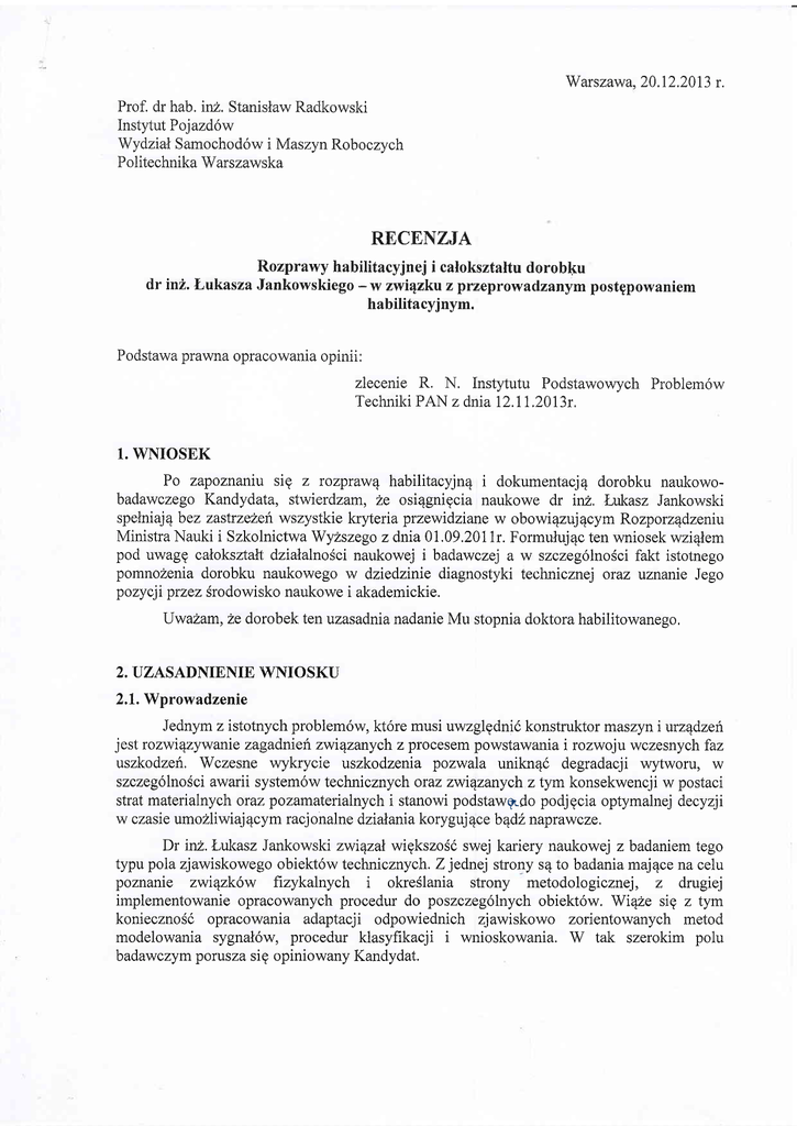 Po zapoznaniusig z rozpraw4habilitacyjnqi dokumentacj4dorobku naukowobadawczegoKandydata,stwierdzam,ze osi4gnigcianaukowe dr inz. tr-ukaszJankowski