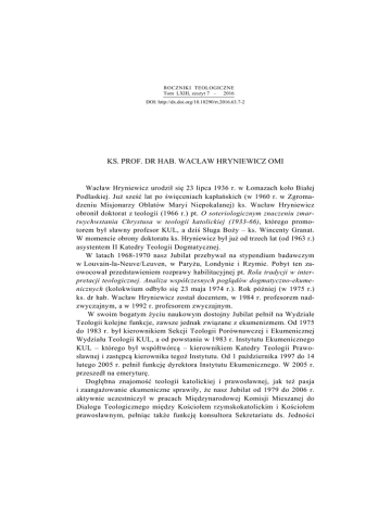 ROCZNIKI TEOLOGICZNE Tom LXIII, zeszyt 7 – 2016 DOI: http://dx.doi.org/10.18290/rt.2016.63.7-2 KS. PROF. DR HAB. WACŁAW HRYNIEWICZ OMI Wacław Hryniewicz urodził się 23 lipca 1936 r. w Łomazach koło Białej Podlaskiej. Już sześć lat po święceniach kapłańskich (w 1960 r. w Zgromadzeniu Misjonarzy Oblatów Maryi Niepokalanej) ks. Wacław Hryniewicz obronił doktorat z teologii (1966 r.) pt. O soteriologicznym znaczeniu zmartwychwstania Chrystusa w teologii katolickiej (1933-66), którego promotorem był sławny profesor KUL, a dziś Sługa Boży – ks. Wincenty Granat. W momencie obrony doktoratu ks. Hryniewicz był już od trzech lat (od 1963 r.) asystentem II Katedry Teologii Dogmatycznej. W latach 1968-1970 nasz Jubilat przebywał na stypendium badawczym w Louvain-la-Neuve/Leuven, w Paryżu, Londynie i Rzymie. Pobyt ten zaowocował przedstawieniem rozprawy habilitacyjnej pt. Rola tradycji w interpretacji teologicznej. Analiza współczesnych poglądów dogmatyczno-ekumenicznych (kolokwium odbyło się 23 maja 1974 r.). Rok później (w 1975 r.) ks. dr hab. Wacław Hryniewicz został docentem, w 1984 r. profesorem nadzwyczajnym, a w 1992 r. profesorem zwyczajnym. W swoim bogatym życiu naukowym dostojny Jubilat pełnił na Wydziale Teologii kolejne funkcje, zawsze jednak związane z ekumenizmem. Od 1975 do 1983 r. był kierownikiem Sekcji Teologii Porównawczej i Ekumenicznej Wydziału Teologii KUL, a od powstania w 1983 r. Instytutu Ekumenicznego KUL – którego był współtwórcą – kierownikiem Katedry Teologii Prawosławnej i zastępcą kierownika tegoż Instytutu. Od 1 października 1997 do 14 lutego 2005 r. pełnił funkcję dyrektora Instytutu Ekumenicznego. W 2005 r. przeszedł na emeryturę. Dogłębna znajomość teologii katolickiej i prawosławnej, jak też pasja i zaangażowanie ekumeniczne sprawiły, że nasz Jubilat od 1979 do 2006 r. aktywnie uczestniczył w pracach Międzynarodowej Komisji Mieszanej do Dialogu Teologicznego między Kościołem rzymskokatolickim i Kościołem prawosławnym, pełniąc także funkcję konsultora Sekretariatu ds. Jedności 10 KS. PROF. DR HAB. WACŁAW HRYNIEWICZ OMI Chrześcijan w Rzymie (1979-1984) oraz będąc członkiem Komisji Episkopatu Polski ds. Ekumenizmu (1984-1994). O Jego znaczącym wkładzie w teologiczne zbliżenie między „dwoma płucami chrześcijaństwa” najwięcej mogliby powiedzieć inni uczestnicy tegoż dialogu, po części zaś czynią to jego książki. Ksiądz Profesor jest członkiem wielu towarzystw naukowych w kraju i za granicą, m.in. Towarzystwa Naukowego KUL (od 1983 r.), European Society for Ecumenical Research Societas Oecumenica (od 1988 r.) oraz Instytutu Europy Środkowo-Wschodniej w Lublinie (od 1992 r.). Szeroko znana jest również jego działalność dydaktyczna. Dość wspomnieć, że gościł z wykładami między innymi w Szwajcarii, Stanach Zjednoczonych, Niemczech, Francji, Belgii i Austrii. Dał się też poznać jako organizator i współorganizator sympozjów naukowych, krajowych i międzynarodowych, o charakterze ekumenicznym. Waga naukowego dorobku ks. prof. Wacława Hryniewicza została doceniona nie tylko na Wydziale Teologii KUL. W latach 1975-1978 był on redaktorem naczelnym „Zeszytów Naukowych KUL”. Bogaty dorobek naukowy Księdza Profesora Hryniewicza został przedstawiony w księdze jubileuszowej Instaurare omnia in Christo. O zbawieniu, teologii, dialogu i nadziei Profesorowi Wacławowi Hryniewiczowi OMI w 70. rocznicę urodzin (red. Przemysław Kantyka, Lublin: Wydawnictwo KUL 2006), późniejszy zaś w kolejnych tomach „Roczników Teologii Ekumenicznej” oraz „Roczników Teologicznych” z. 7: Teologia ekumeniczna. Ks. Przemysław Kantyka