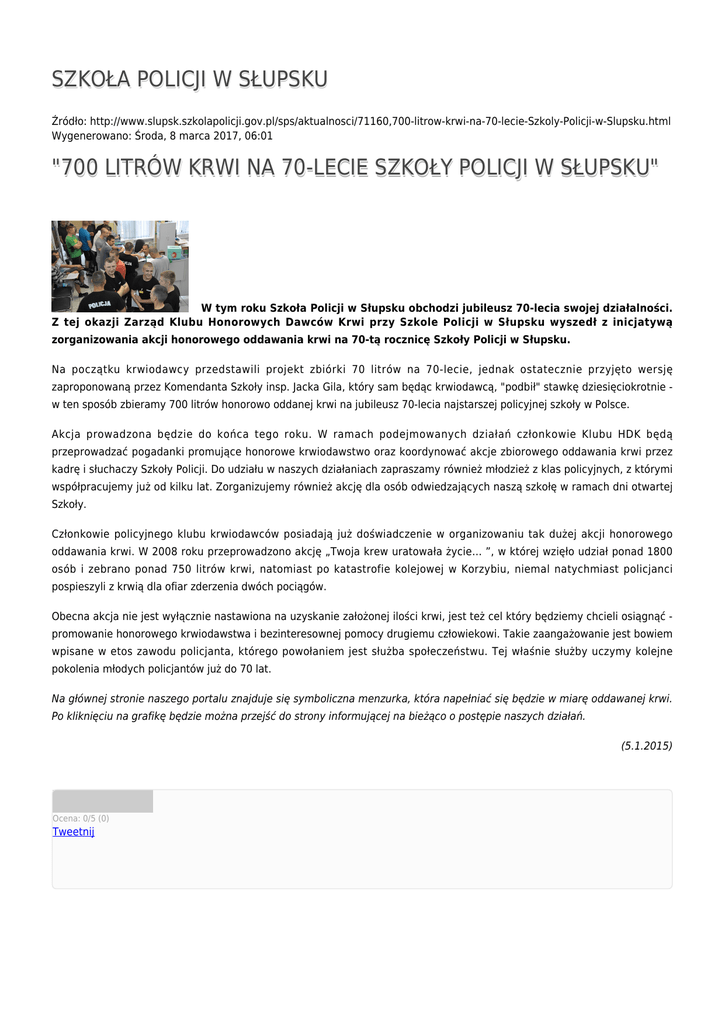 SZKOŁA POLICJI W SŁUPSKU Źródło: http://www.slupsk.szkolapolicji.gov.pl/sps/aktualnosci/71160,700-litrow-krwi-na-70-lecie-Szkoly-Policji-w-Slupsku.html Wygenerowano: Środa, 8 marca 2017, 06:01 "700 LITRÓW KRWI NA 70-LECIE SZKOŁY POLICJI W SŁUPSKU" W tym roku Szkoła Policji w Słupsku obchodzi jubileusz 70-lecia swojej działalności. Z tej okazji Zarząd Klubu Honorowych Dawców Krwi przy Szkole Policji w Słupsku wyszedł z inicjatywą zorganizowania akcji honorowego oddawania krwi na 70-tą rocznicę Szkoły Policji w Słupsku. Na początku krwiodawcy przedstawili projekt zbiórki 70 litrów na 70-lecie, jednak ostatecznie przyjęto wersję zaproponowaną przez Komendanta Szkoły insp. Jacka Gila, który sam będąc krwiodawcą, "podbił" stawkę dziesięciokrotnie w ten sposób zbieramy 700 litrów honorowo oddanej krwi na jubileusz 70-lecia najstarszej policyjnej szkoły w Polsce. Akcja prowadzona będzie do końca tego roku. W ramach podejmowanych działań członkowie Klubu HDK będą przeprowadzać pogadanki promujące honorowe krwiodawstwo oraz koordynować akcje zbiorowego oddawania krwi przez kadrę i słuchaczy Szkoły Policji. Do udziału w naszych działaniach zapraszamy również młodzież z klas policyjnych, z którymi współpracujemy już od kilku lat. Zorganizujemy również akcję dla osób odwiedzających naszą szkołę w ramach dni otwartej Szkoły. Członkowie policyjnego klubu krwiodawców posiadają już doświadczenie w organizowaniu tak dużej akcji honorowego oddawania krwi. W 2008 roku przeprowadzono akcję „Twoja krew uratowała życie… ”, w której wzięło udział ponad 1800 osób i zebrano ponad 750 litrów krwi, natomiast po katastrofie kolejowej w Korzybiu, niemal natychmiast policjanci pospieszyli z krwią dla ofiar zderzenia dwóch pociągów. Obecna akcja nie jest wyłącznie nastawiona na uzyskanie założonej ilości krwi, jest też cel który będziemy chcieli osiągnąć promowanie honorowego krwiodawstwa i bezinteresownej pomocy drugiemu człowiekowi. Takie zaangażowanie jest bowiem wpisane w etos zawodu policjanta, którego powołaniem jest służba społeczeństwu. Tej właśnie służby uczymy kolejne pokolenia młodych policjantów już do 70 lat. Na głównej stronie naszego portalu znajduje się symboliczna menzurka, która napełniać się będzie w miarę oddawanej krwi. Po kliknięciu na grafikę będzie można przejść do strony informującej na bieżąco o postępie naszych działań. (5.1.2015) Ocena: 0/5 (0) Tweetnij