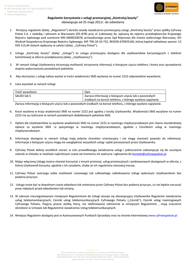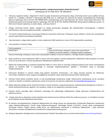 Centrum Obsługi Klienta 801 08 08 08, 222 127 222 lub 699 00 2222 (opłata wg taryfy operatora) www.cyfrowypolsat.pl Regulamin korzystania z usługi promocyjnej „Kontroluj koszty” obowiązuje od 25 maja 2011r. do odwołania 1. Niniejszy regulamin (dalej: „Regulamin”) określa zasady świadczenia promocyjnej usługi „Kontroluj koszty” przez spółkę Cyfrowy Polsat S.A. z siedzibą i adresem w Warszawie (03–878) przy ul. Łubinowej 4a, wpisaną do rejestru przedsiębiorców Krajowego Rejestru Sądowego pod numerem KRS 0000010078, prowadzonego przez Sąd Rejonowy dla miasta stołecznego Warszawy, XIII Wydział Gospodarczy Krajowego Rejestru Sądowego, NIP 796‐18‐10‐732, REGON 670925160, której kapitał zakładowy wynosi: 13 934 113,44 złotych wpłacony w całości (dalej: ,,Cyfrowy Polsat”). 2. Usługa „Kontroluj koszty” (dalej: „Usługa”) to usługa promocyjna dostępna dla użytkowników korzystających z telefonii komórkowej w ofercie przedpłaconej (dalej: „Użytkownicy”). 3. W ramach Usługi Użytkownicy otrzymują możliwość otrzymania informacji o bieżącym użyciu telefonu i konta oraz sprawdzenia stopnia wykorzystania posiadanych pakietów. 4. Aby skorzystać z usługi należy wysłać w treści wiadomości SMS wysłanej na numer 2222 odpowiednie wywołanie. 5. Lista wywołań w ramach Usługi: Treść wywołania SALDO lub S Opis Zwraca informację o bieżącym użyciu lub o pozostałych środkach na koncie telefonu, z którego wysłano zapytanie. Zwraca informację o bieżącym użyciu lub o pozostałych środkach na koncie telefonu, z którego wysłano zapytanie. 6. Koszt wysłania w kraju wiadomości SMS na numer 2222 jest zgodny z taryfą Użytkownika. Wiadomości SMS wysyłane na numer 2222 nie są rozliczane w ramach posiadanych dodatkowych pakietów SMS. 7. Opłata dla Użytkowników za wysłanie wiadomości SMS na numer 2222 w roamingu międzynarodowym jest równa standardowej opłacie za wysłanie SMS –a specjalnego w roamingu międzynarodowym, zgodnie z Cennikiem usług w roamingu międzynarodowym. 8. Informacje dostępne w ramach Usługi mają jedynie charakter orientacyjny i nie mogą stanowić powodu do reklamacji. Informacje o bieżącym użyciu mogą nie uwzględniać wszystkich usług i opłat ponoszonych przez Użytkownika. 9. Cyfrowy Polsat dołoży wszelkich starań, w celu prawidłowego świadczenia usługi i jednocześnie zobowiązuje się do usunięcia usterek w Usłudze w możliwie najkrótszym czasie od momentu ich wykrycia i zgłoszenia do [email protected]. 10. Mając włączoną Usługę można również korzystać z innych promocji, usług promocyjnych i podstawowych dostępnych w ofercie, z której Użytkownik korzysta, zgodnie z ich zasadami, chyba że ich regulaminy stanowią inaczej. 11. Cyfrowy Polsat zastrzega sobie możliwość czasowego lub całkowitego zablokowania Usługi wybranym Użytkownikom bez podania przyczyn. 12. Usługa może być w dowolnym czasie odwołana lub zmieniona przez Cyfrowy Polsat bez podania przyczyn, co nie będzie naruszać praw nabytych przed odwołaniem lub zmianą. 13. W zakresie nieuregulowanym niniejszym Regulaminem do Usługi stosuje się obowiązujący Użytkownika Regulamin świadczenia usług telekomunikacyjnych, Cennik usług telekomunikacyjnych Cyfrowego Polsatu („Cennik”), Cennik usług roamingowych Cyfrowego Polsatu. Pojęcia pisane wielką literą, nie zdefiniowane odmiennie w niniejszym Regulaminie , mają znaczenie określone w Umowie lub Regulaminie świadczenia Usług telekomunikacyjnych. 14. Niniejszy Regulamin dostępny jest w Autoryzowanych Punktach Sprzedaży oraz na stronie internetowej www.cyfrowypolsat.pl. Cyfrowy Polsat S.A. z siedzibą w Warszawie, ul. Łubinowa 4a, 03-878 Warszawa Sąd Rejonowy dla m.st. Warszawy, XIII Wydział Gospodarczy Krajowego Rejestru Sądowego KRS 0000010078, NIP 796-18-10-732, REGON 670925160, GIOŚ – E0001824WZBW Kapitał zakładowy 13 934 113,44 zł w pełni wpłacony