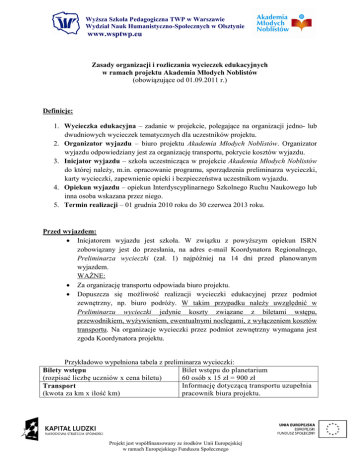 Wyższa Szkoła Pedagogiczna TWP w Warszawie Wydział Nauk Humanistyczno-Społecznych w Olsztynie www.wsptwp.eu Zasady organizacji i rozliczania wycieczek edukacyjnych w ramach projektu Akademia Młodych Noblistów (obowiązujące od 01.09.2011 r.) Definicje: 1. Wycieczka edukacyjna – zadanie w projekcie, polegające na organizacji jedno- lub dwudniowych wycieczek tematycznych dla uczestników projektu. 2. Organizator wyjazdu – biuro projektu Akademia Młodych Noblistów. Organizator wyjazdu odpowiedziany jest za organizację transportu, pokrycie kosztów wyjazdu. 3. Inicjator wyjazdu – szkoła uczestnicząca w projekcie Akademia Młodych Noblistów do której należy, m.in. opracowanie programu, sporządzenia preliminarza wycieczki, karty wycieczki, zapewnienie opieki i bezpieczeństwa uczestnikom wyjazdu. 4. Opiekun wyjazdu – opiekun Interdyscyplinarnego Szkolnego Ruchu Naukowego lub inna osoba wskazana przez niego. 5. Termin realizacji – 01 grudnia 2010 roku do 30 czerwca 2013 roku. Przed wyjazdem: Inicjatorem wyjazdu jest szkoła. W związku z powyższym opiekun ISRN zobowiązany jest do przesłania, na adres e-mail Koordynatora Regionalnego, Preliminarza wycieczki (zał. 1) najpóźniej na 14 dni przed planowanym wyjazdem. WAŻNE: Za organizację transportu odpowiada biuro projektu. Dopuszcza się możliwość realizacji wycieczki edukacyjnej przez podmiot zewnętrzny, np. biuro podróży. W takim przypadku należy uwzględnić w Preliminarzu wycieczki jedynie koszty związane z biletami wstępu, przewodnikiem, wyżywieniem, ewentualnymi noclegami, z wyłączeniem kosztów transportu. Na organizacje wycieczki przez podmiot zewnętrzny wymagana jest zgoda Koordynatora projektu. Przykładowo wypełniona tabela z preliminarza wycieczki: Bilet wstępu do planetarium Bilety wstępu (rozpisać liczbę uczniów x cena biletu) 60 osób x 15 zł = 900 zł Informację dotyczącą transportu uzupełnia Transport (kwota za km x ilość km) pracownik biura projektu. Projekt jest współfinansowany ze środków Unii Europejskiej w ramach Europejskiego Funduszu Społecznego Wyższa Szkoła Pedagogiczna TWP w Warszawie Wydział Nauk Humanistyczno-Społecznych w Olsztynie www.wsptwp.eu Wyżywienie (kwota za jedną osobę x liczba osób) Ewentualny nocleg (cena za osobę x liczba osób) Całkowity koszt wycieczki (suma wszystkich wydatków) 10 zł x 60 osób = 600 zł 100 zł x 60 osób = 6000 zł 10.000 zł 1. Szczegóły dotyczące udziału uczniów i zasady finansowania: a) Organizację i program wyjazdów należy dostosować do obszaru tematycznego laboratoriów w ramach projektu. W związku z powyższym wycieczki organizowane w ramach projektu powinny mieć charakter edukacyjny i być powiązane z laboratoriami (matematyczno-fizycznym, biologiczno-chemicznym, języka obcego, geograficznym, ICT). WAŻNE: Wyjazdy edukacyjne mogą być organizowane m.in. do ogrodu botanicznego, oceanarium, obserwatorium, itp. Wyjścia do kina nie mogą być jedynym celem wycieczki. Podczas wycieczki kino powinno być dodatkową atrakcją dla uczestników projektu. Możliwe filmy do wyboru w ramach wycieczek to: dokumentalne, w wersji 3D lub w języku obcym. b) Każdy uczeń powinien mieć możliwość w ramach projektu do bezpłatnego uczestnictwa w 6 jednodniowych wycieczkach (w przypadku organizacji wycieczki dwudniowej jest ona liczona jako dwie wycieczki). c) W wyjeździe mogą uczestniczyć uczniowie z kilku laboratoriów jednocześnie (laboratoria z różnych obszarów tematycznych). d) Uczniowie niepełnosprawni, o ile nie ma przeciwskazań zdrowotnych, mogą brać udział w wyjazdach, a organizator wyjazdu powinien zapewnić im warunki odpowiednie do specyficznych potrzeb, wynikających z rodzaju i stopnia niepełnosprawności. e) Uczniowie nieobecni mają obowiązek dostarczenia do opiekuna wycieczki usprawiedliwienia podpisanego przez rodzica/opiekuna prawnego. Niewykorzystana z tego tytułu kwota jednostkowa na ucznia nie może być wykorzystana na poczet innych wycieczek edukacyjnych w ramach projektu. f) Organizacja wycieczki powinna być zgodna z Rozporządzeniami i Ustawami w zakresie Organizowania turystyki młodzieżowej, BHP, i innymi obowiązującymi dotyczącymi organizacji czasu wolnego dzieci i młodzieży. g) Maksymalny koszt 6 jednodniowych wycieczek w przeliczeniu na jednego uczestnika wynosi 390 zł. h) Szkoła nie otrzymuje gotówki na wyjazd. i) Podczas organizacji wycieczki należy pamiętać, że: Wyjazd zostaje rozliczony przelewem na podstawie faktur VAT z 21-dniowym terminem płatności. Projekt jest współfinansowany ze środków Unii Europejskiej w ramach Europejskiego Funduszu Społecznego Wyższa Szkoła Pedagogiczna TWP w Warszawie Wydział Nauk Humanistyczno-Społecznych w Olsztynie www.wsptwp.eu Faktury muszą być wystawione z poniższymi danymi: Dane do faktury: Wyższa Szkoła Pedagogiczna TWP w Warszawie ul. Pandy 13, 02-202 Warszawa NIP: 526-17-23-036 REGON: 010291998 W przypadku braku możliwości rozliczenia przelewem na podstawie faktur VAT z 21-dniowym terminem płatności, istnieje możliwość refinansowania poniesionych kosztów na podstawie faktury VAT opłaconej gotówką, np. przez opiekuna wyjazdu. Fakturę należy opisać zwracając uwagę, aby znalazł się na niej wpis „Zapłacono gotówką”. Do faktury należy dołączyć „Prośbę opiekuna wyjazdu o zwrot poniesionych kosztów na konto prywatne”, której wzór stanowi załącznik 2. Opis faktury: Zakup ………………………………………………….. (nazwa usługi lub towaru) w ramach wycieczki edukacyjnej do ………………………………… w dniu …………………………. dla laboratorium(ów) ……………………….. dla ……… (liczba osób) osób z ……………………………………… (nazwa szkoły). ………………………………............ Czytelny podpis opiekuna wyjazdu j) Nauczyciel biorący udział w wycieczce ma obowiązek wp