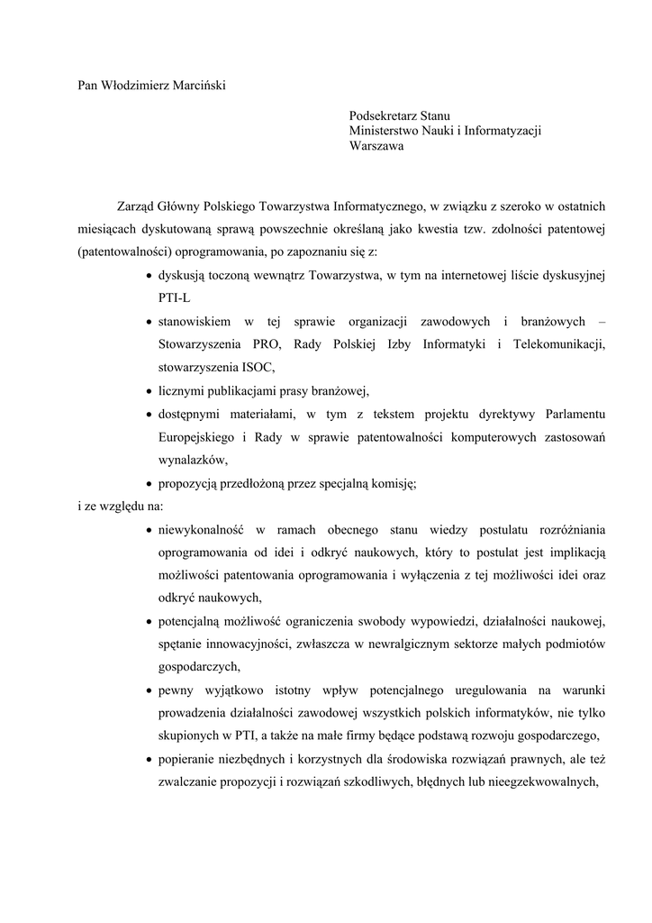 Pan Włodzimierz Marciński Podsekretarz Stanu Ministerstwo Nauki i Informatyzacji Warszawa Zarząd Główny Polskiego Towarzystwa Informatycznego, w związku z szeroko w ostatnich miesiącach dyskutowaną sprawą powszechnie określaną jako kwestia tzw. zdolności patentowej (patentowalności) oprogramowania, po zapoznaniu się z: • dyskusją toczoną wewnątrz Towarzystwa, w tym na internetowej liście dyskusyjnej PTI-L • stanowiskiem w tej sprawie organizacji zawodowych i branżowych – Stowarzyszenia PRO, Rady Polskiej Izby Informatyki i Telekomunikacji, stowarzyszenia ISOC, • licznymi publikacjami prasy branżowej, • dostępnymi materiałami, w tym z tekstem projektu dyrektywy Parlamentu Europejskiego i Rady w sprawie patentowalności komputerowych zastosowań wynalazków, • propozycją przedłożoną przez specjalną komisję; i ze względu na: • niewykonalność w ramach obecnego stanu wiedzy postulatu rozróżniania oprogramowania od idei i odkryć naukowych, który to postulat jest implikacją możliwości patentowania oprogramowania i wyłączenia z tej możliwości idei oraz odkryć naukowych, • potencjalną możliwość ograniczenia swobody wypowiedzi, działalności naukowej, spętanie innowacyjności, zwłaszcza w newralgicznym sektorze małych podmiotów gospodarczych, • pewny wyjątkowo istotny wpływ potencjalnego uregulowania na warunki prowadzenia działalności zawodowej wszystkich polskich informatyków, nie tylko skupionych w PTI, a także na małe firmy będące podstawą rozwoju gospodarczego, • popieranie niezbędnych i korzystnych dla środowiska rozwiązań prawnych, ale też zwalczanie propozycji i rozwiązań szkodliwych, błędnych lub nieegzekwowalnych, • powszechny w Towarzystwie i poza nim negatywny stosunek zarówno do propozycji dyrektywy jak i do szeregu okoliczności towarzyszących związanej z nią procedurą; przedstawia stanowisko w tej sprawie. Polskie Towarzystwo Informatyczne, którego jednym z naczelnych celów statutowych jest popieranie działalności naukowej i naukowo-technicznej we wszystkich dziedzinach informatyki i doskonalenia metod jej efektywnego wykorzystania, uważa propozycje dyrektywy, i samo uregulowanie za zbyteczne, a wręcz szkodliwe. Stosowne uzasadnienie jest załączone do stanowiska. Wyrażając tak wyraźne stanowisko PTI zdaje sobie sprawę, że w dużym stopniu odbiega ono od pewnych istotnych uwarunkowań, w tym ekonomicznych i politycznych, hipotetycznie mogących wskazywać poważne argumenty na rzecz danego uregulowania. Pomimo tego, iż taki aspekt spraw bardziej leży w kompetencji i odpowiedzialności wymienionych organizacji branżowych, Towarzystwo było i jest gotowe rozważyć takie uwarunkowania przedstawione w sposób otwarty, kompetentny i jak to możliwe wszechstronny. Niestety, nic nie wiadomo o takich uwarunkowaniach. Wręcz przeciwnie, większość dostępnych opracowań i opinii utwierdza w słuszności zdecydowanego stanowiska PTI, tym bardziej iż ważny i rzeczowy postulat trzech działań Rady PIIiT pomimo upływu trzech miesięcy od jego wysunięcia nie doczekał się realizacji. Ponieważ aspekt czasu w sytuacji uruchomionej procedury legislacyjnej jest kluczowy, to nie wnioskując o zaniechanie powyższych działań, uważamy że należy zaufać odczuciom ważnej i aktywnej opiniotwórczo grupy polskich informatyków zawodowych. Domagamy się, aby rząd RP, stojąc na gruncie interesów polskich informatyków zawodowych, branży informatycznej, stanął na stanowisku całkowitej wystarczalności ochrony oprogramowania prawem autorskim, i działał we wszelki dostępny sposób, w tym proceduralny, w celu odrzucenia dyrektywy w całości. W imieniu Zarządu Głównego Polskiego Towarzystwa Informatycznego Jerzy Nowak Sekretarz Generalny Uzasadnienie stanowiska PTI w sprawie patentowalności oprogramowania Przedstawione stanowisko Polskiego Towarzystwa Informatycznego zdecydowanie i bezkompromisowo odrzuca koncepcję potocznie zwaną patentowaniem oprogramowania. Stanowisko takie zostało wypracowane w kilkumiesięcznej dyskusji informatyków zrzeszonych i niezrzeszonych reprezentujących własne wolne opinie jako ludzi, dla których informatyka jest głównym rodzajem osobistej aktywności. Dyskusja ta skupiała się w oczywisty sposób na takim, osobistym podejściu do problemu, aczkolwiek pojawiały się w niej rozważania o aspektach ekonomicznych, prawnych i politycznych, co spowodowało, że ogólnej opinii dyskutantów nie można określić jako absolutnej jednomyślności w odrzuceniu idei patentowania oprogramowania, a jako zdecydowaną przewagę takiego poglądu. Wyrażając takie stanowisko uzasadniamy je poniższymi argumentami: 1. PTI od chwili powstania w 1980 r. było aktywnym, konsekwentnym i nieomalże osamotnionym zwolennikiem ochrony praw własności intelektualnej i twórczej. W całkowicie niesprzyjających temu warunkach poprzedniego ustroju otwarcie głosiło konieczność i nieuchronność objęcia w Polsce oprogramowania – obcego i rodzimego, ochroną prawną. Wprowadzenie, wprawdzie z pewna zwłoką i w postaci dość osobliwej konstrukcji dołączenia oprogramowania do szeregu przejawów aktywności artystycznej jako przedmiotów prawa autorskiego, zostało przyjęte jako sprawa oczywista, i też jako potwierdzenie słuszności naszych zabiegów. Okres stosowania tego prawa upoważnia do stwierdzenia, że jest to uregulowanie - na poziomie werbalnych ocen etycznych - powszechnie akceptowane, że uregulowanie to jest sprawne, zabezpiecza interesy zaangażowanych stron, nie jest też jakimkolwiek elementem hamującym aktywność, zmiany czy rozwój. Pozwala to stwierdzić, że obecna ochrona oprogramowania w Polsce tworzy swego rodzaju stan równowagi. W układzie takim funkcjonuje, w zgodzie z prawem coraz ważniejsze zjawisko, nie tyle technologiczne ile społeczne, w postaci oprogramowania z otwartym kodem. Stan taki zapewne ma miejsce równie