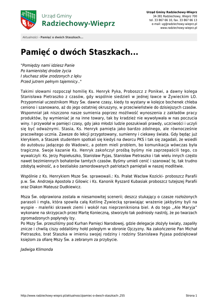 Urząd Gminy Radziechowy-Wieprz 34-381 Radziechowy, Wieprz 700 tel. 33 867 66 10, fax. 33 867 66 13 e-mail: [email protected] www.radziechowy-wieprz.pl Aktualności › Pamięć o dwóch Staszkach... Pamięć o dwóch Staszkach... "Pomiędzy nami idziesz Panie Po kamienistej drodze życia I słuchasz słów zrodzonych z lęku Przed jutrem pełnym tajemnicy.." Takimi słowami rozpoczął homilię Ks. Henryk Pyka, Proboszcz z Ponikwi, a dawny kolega Stanisława Pietraszko z czasów, gdy wspólnie siedzieli w jednej ławce w Żywieckim LO. Przypomniał uczestnikom Mszy Św. dawne czasy, kiedy to wystany w kolejce bochenek chleba ceniono i szanowano, aż do jego ostatniej okruszyny, w przeciwieństwie do dzisiejszych czasów. Wspomniał jak niszczono nasze sumienia poprzez możliwość wynoszenia z zakładów pracy produktów, by wymieniać je na inne towary, tak by kradzież nie wywoływała w nas poczucia winy. I przywołał w pamięci czasy, gdy jako młodzi ludzie poszukiwali prawdy, uczciwości i uczyli się być odważnymi. Stasia, Ks. Henryk pamięta jako bardzo zdolnego, ale równocześnie pracowitego ucznia. Zawsze do lekcji przygotowany, sumienny i ciekawy świata. Gdy będąc już klerykiem, a Staszek studentem spotkali się kiedyś na dworcu PKS i tak się zagadali, że wsiedli do autobusu jadącego do Wadowic, a potem mieli problem, bo komunikacja wówczas była tragiczna. Swoje kazanie Ks. Henryk zakończył prośbą byśmy nie zaprzepaścili tego, co wywalczyli: Ks. Jerzy Popiełuszko, Stanisław Pyjas, Stanisław Pietraszko i tak wielu innych często nawet bezimiennych bohaterów tamtych czasów. Byśmy umieli cenić i szanować tę, tak trudno zdobytą wolność, a o bestialsko zamordowanych patriotach pamiętali w naszej modlitwie. Wspólnie z Ks. Henrykiem Msze Św. sprawowali.: Ks. Prałat Wacław Kozicki- proboszcz Parafii p.w. Św. Andrzeja Apostoła z Gilowic i Ks. Kanonik Ryszard Kubasiak proboszcz tutejszej Parafii oraz Diakon Mateusz Dudkiewicz. Msza Św. odprawiona została w niesamowitej scenerii; deszcz stukający o czasze rozłożonych parasoli i mgła, która spowiła całą Kotlinę Żywiecką sprawiając wrażenie jakbyśmy byli na wyspie - maleńki skrawek ziemi i wokół nas nieprzenikniona biel. A do tego ,,Ale Maryja” wykonane na skrzypcach przez Martę Konieczną, stworzyło tak podniosły nastrój, że po twarzach zgromadzonych popłynęły łzy. Po Mszy Św. przeszliśmy pod Kurhan Pamięci Narodowej, gdzie delegacje złożyły kwiaty, zapaliły znicze i chwilą ciszy oddaliśmy hołd poległym w obronie Ojczyzny. Na zakończenie Pan Michał Pietraszko, brat Staszka w imieniu swojej rodziny i rodziny Stanisława Pyjasa podziękował księżom za ofiarę Mszy Św. a zebranym za przybycie. Jadwiga Klimonda http://www.radziechowy-wieprz.pl/aktualnosci/pamiec-o-dwoch-staszkach-,255 Strona 1