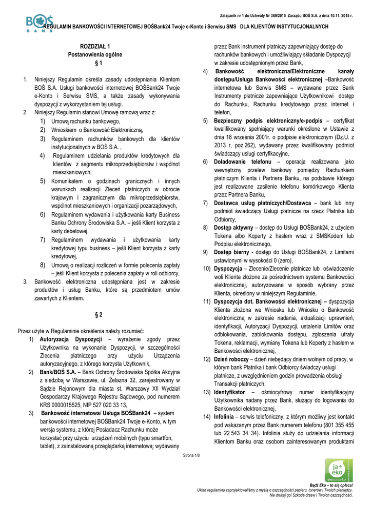 Załącznik nr 1 do Uchwały Nr 389/2015 Zarządu BOŚ S.A. z dnia 10.11. 2015 r. REGULAMIN BANKOWOŚCI INTERNETOWEJ BOŚBank24 Twoje e-Konto i Serwisu SMS DLA KLIENTÓW INSTYTUCJONALNYCH ROZDZIAŁ 1 Postanowienia ogólne §1 4) 1. 2. 3. Niniejszy Regulamin określa zasady udostępniania Klientom BOŚ S.A. Usługi bankowości internetowej BOŚBank24 Twoje e-Konto i Serwisu SMS, a także zasady wykonywania dyspozycji z wykorzystaniem tej usługi. Niniejszy Regulamin stanowi Umowę ramową wraz z: 1) Umową rachunku bankowego, 2) Wnioskiem o Bankowość Elektroniczną, 3) Regulaminem rachunków bankowych dla klientów instytucjonalnych w BOŚ S.A. , 4) Regulaminem udzielania produktów kredytowych dla klientów z segmentu mikroprzedsiębiorstw i wspólnot mieszkaniowych, 5) Komunikatem o godzinach granicznych i innych warunkach realizacji Zleceń płatniczych w obrocie krajowym i zagranicznym dla mikroprzedsiębiorstw, wspólnot mieszkaniowych i organizacji pozarządowych, 6) Regulaminem wydawania i użytkowania karty Business Banku Ochrony Środowiska S.A. – jeśli Klient korzysta z karty debetowej, 7) Regulaminem wydawania i użytkowania karty kredytowej typu business – jeśli Klient korzysta z karty kredytowej, 8) Umową o realizacji rozliczeń w formie polecenia zapłaty – jeśli Klient korzysta z polecenia zapłaty w roli odbiorcy, Bankowość elektroniczna udostępniana jest w zakresie produktów i usług Banku, które są przedmiotem umów zawartych z Klientem. 5) 6) 7) 8) 9) 10) 11) §2 Przez użyte w Regulaminie określenia należy rozumieć: 1) Autoryzacja Dyspozycji – wyrażenie zgody przez Użytkownika na wykonanie Dyspozycji, w szczególności Zlecenia płatniczego przy użyciu Urządzenia autoryzacyjnego, z którego korzysta Użytkownik, 2) Bank/BOŚ S.A. – Bank Ochrony Środowiska Spółka Akcyjna z siedzibą w Warszawie, ul. Żelazna 32, zarejestrowany w Sądzie Rejonowym dla miasta st. Warszawy XII Wydział Gospodarczy Krajowego Rejestru Sądowego, pod numerem KRS 0000015525, NIP 527 020 33 13, 3) Bankowość internetowa/ Usługa BOŚBank24 – system bankowości internetowej BOŚBank24 Twoje e-Konto, w tym wersja systemu, z której Posiadacz Rachunku może korzystać przy użyciu urządzeń mobilnych (typu smartfon, tablet), z zainstalowaną przeglądarką internetową; wydawany 12) 13) 14) przez Bank instrument płatniczy zapewniający dostęp do rachunków bankowych i umożliwiający składanie Dyspozycji w zakresie udostępnionym przez Bank, Bankowość elektroniczna/Elektroniczne kanały dostępu/Usługa Bankowości elektronicznej –Bankowość internetowa lub Serwis SMS – wydawane przez Bank Instrumenty płatnicze zapewniające Użytkownikowi dostęp do Rachunku, Rachunku kredytowego przez internet i telefon, Bezpieczny podpis elektroniczny/e-podpis – certyfikat kwalifikowany spełniający warunki określone w Ustawie z dnia 18 września 2001r. o podpisie elektronicznym (Dz.U. z 2013 r, poz.262), wydawany przez kwalifikowany podmiot świadczący usługi certyfikacyjne, Doładowanie telefonu – operacja realizowana jako wewnętrzny przelew bankowy pomiędzy Rachunkiem płatniczym Klienta i Partnera Banku, na podstawie którego jest realizowane zasilenie telefonu komórkowego Klienta przez Partnera Banku, Dostawca usług płatniczych/Dostawca – bank lub inny podmiot świadczący Usługi płatnicze na rzecz Płatnika lub Odbiorcy, Dostęp aktywny – dostęp do Usługi BOŚBank24, z użyciem Tokena albo Koperty z hasłem wraz z SMSKodem lub Podpisu elektronicznego, Dostęp bierny - dostęp do Usługi BOŚBank24, z Limitami ustawionymi w wysokości 0 (zero), Dyspozycja – Zlecenie/Zlecenie płatnicze lub oświadczenie woli Klienta złożone za pośrednictwem systemu Bankowości elektronicznej, autoryzowane w sposób wybrany przez Klienta, określony w niniejszym Regulaminie, Dyspozycja dot. Bankowości elektronicznej – dyspozycja Klienta złożona we Wniosku lub Wniosku o Bankowość elektroniczną w zakresie nadania, aktualizacji uprawnień, identyfikacji, Autoryzacji Dyspozycji, ustalenia Limitów oraz odblokowania, zablokowania dostępu, zgłoszenia utraty Tokena, reklamacji, wymiany Tokena lub Koperty z hasłem w Bankowości elektronicznej, Dzień roboczy – dzień niebędący dniem wolnym od pracy, w którym bank Płatnika i bank Odbiorcy świadczy usługi płatnicze, z uwzględnieniem godzin prowadzenia obsługi Transakcji płatniczych, Identyfikator – ośmiocyfrowy numer identyfikacyjny Użytkownika nadany przez Bank, służący do logowania do Bankowości elektronicznej, Infolinia – serwis telefoniczny, z którym możliwy jest kontakt pod wskazanym przez Bank numerem telefonu (801 355 455 lub 22 543 34 34). Infolinia służy do udzielania informacji Klientom Banku oraz osobom zainteresowanym produktami Strona 1/8 Bądź Eko – to się opłaca! Układ regulaminu zaprojektowaliśmy z myślą o oszczędności papieru, tonerów i Twoich pieniędzy. Nie drukuj go! Szkoda drzew i Twoich oszczędności. 15) 16) 17) 18) 19) 20) 21) 22) 23) 24) 25) 26) i/lub usługami Banku oraz świadczy usługi związane z prowadzeniem i obsługą produktów oferowanych przez Bank, Instrument płatniczy – zindywidualizowane urządzenie lub uzgodniony przez Użytkownika i Dostawcę zbiór procedur, wykorzystywane przez Użytkownika do złożenia Zlecenia płatniczego, Koperta z hasłem – koperta zawierająca poufny nr PIN, służący Użytkownikowi do pierwszego logowania do BOŚBank24 lub poufny nr TeleKod wykorzystywany w Serwisie SMS, Klient instytucjonalny/Klient – podmiot będący stroną zawartej z Bankiem umowy rachunku bankowego lub podmiot występujący o zawarcie umowy z Bankiem, tj. mikroprzedsiębiorstwo, wspólnota mieszkaniowa lub organizacja pozarządowa , Klucz –poufne hasło służące do logowania i/lub Autoryzacji Dyspozycji zgodnie z zasadami postępowania przy korzystaniu z BOŚBank24 obowiązującymi w Dostępie aktywnym lub Dostę