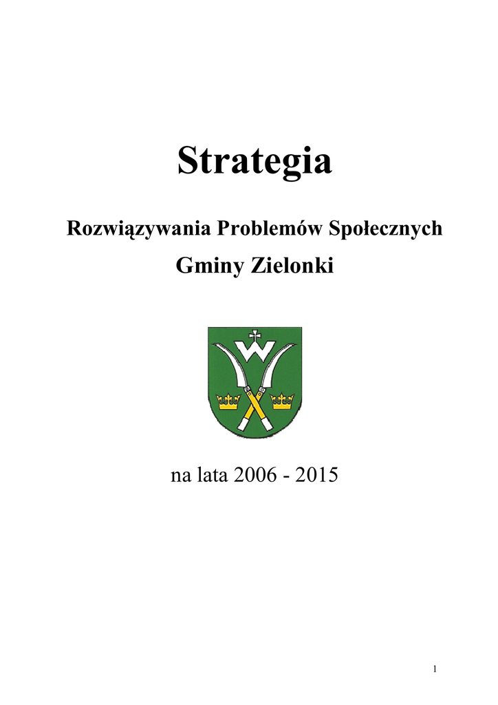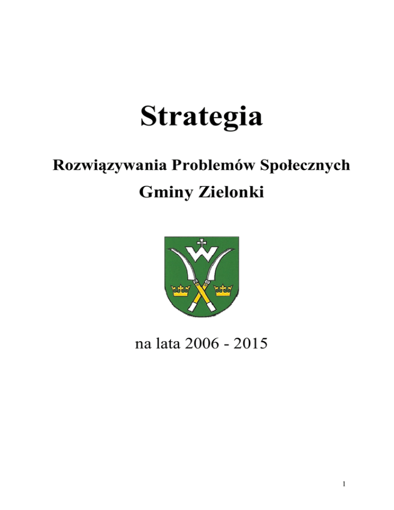 Strategia Rozwiązywania Problemów Społecznych Gminy Zielonki na lata 2006 - 2015 1 SPIS TREŚCI WSTĘP ........................................................................................................................................... 3 I. DIAGNOZA PROBLEMÓW SPOŁECZNYCH GMINY ZIELONKI. ............................ 4 1. CHARAKTERYSTYKA GMINY ZIELONKI ....................................................................... 4 1.1. PołoŜenie administracyjne i sytuacja gospodarcza ................................................................. 4 1.2. Sieć drogowa. ........................................................................................................................... 5 1.3. Komunikacja zbiorowa . .......................................................................................................... 5 1.4. Dane demograficzne ................................................................................................................ 6 1.5. Edukacja ................................................................................................................................ 11 1.6. Kultura ................................................................................................................................... 15 1.7. Ochrona zdrowia ................................................................................................................... 16 2. POMOC SPOŁECZNA .......................................................................................................... 19 2.1. Informacje ogólne. ................................................................................................................. 19 2.2. Rodzaje świadczeń. ................................................................................................................ 20 2.3. Organizacje pozarządowe. ..................................................................................................... 24 3. BEZROBOCIE. ....................................................................................................................... 27 3.1. Struktura bezrobocia ............................................................................................................. 27 4. STAROŚĆ. .............................................................................................................................. 30 5. NIEPEŁNOSPRAWNOŚĆ .................................................................................................... 31 5.1. Struktura niepełnosprawności. ............................................................................................... 31 5.2. Placówki działające na rzecz osób niepełnosprawnych ......................................................... 35 5.3. Bariery. ................................................................................................................................... 36 6. BEZPIECZEŃSTWO ............................................................................................................ 38 7. PROBLEMY UZALEśNIEŃ . ............................................................................................... 39 7.1. Przemoc domowa . ................................................................................................................. 40 8. BEZDOMNOŚĆ. .................................................................................................................... 43 9. SYTUACJA MIESZKANIOWA ........................................................................................... 43 II. ANALIZA WYNIKAJĄCA Z PRZEPROWADZONEJ DIAGNOZY PROBLEMÓW SPOŁECZNYCH ..................................................................................... 44 1. Analiza SWOT .......................................................................................................................... 45 III. STRATEGIA ROZWIĄZYWANIA PROBLEMÓW SPOŁECZNYCH . ..................... 47 1. MISJA ....................................................................................................................................... 47 2. GŁÓWNE CELE STRATEGICZNE. ....................................................................................... 47 3. Plan Działań Strategicznych lata 2006-2015. .......... ............................................................... 48 4. Finansowanie ............................................................................................................................ 59 IV. MONITORING I WDRAśANIE STRATEGII. ................................................................ 59 1. Zasady i wskaźniki monitorowania strategii. ........... ............................................................... 59 V. WNIOSKI I UWAGI KOŃCOWE ................................................................................... 60 SŁOWNICZEK UśYTYCH W DOKUMENCIE SKRÓTÓW ................................................. 61 2 WSTĘP Strategia Rozwiązywania Problemów Społecznych Gminy Zielonki w latach 2006 do 2015 jest dokumentem wyznaczającym główne kierunki działań mających na celu zapewnienie mieszkańcom gminy odpowiedniej jakości Ŝycia. Opracowana została na podstawie wytycznych zawartych w art. 17 ust. 1 pkt. 1 ustawy o pomocy społecznej, mówiących o tym, Ŝe „do zadań własnych gminy o charakterze obowiązkowym naleŜy … opracowanie i realizacja gminnej strategii rozwiązywania problemów społecznych ze szczególnym uwzględnieniem programów pomocy społecznej, profilaktyki i rozwiązywania problemów alkoholowych i innych, których celem jest integracja osób i rodzin z grup szczególnego ryzyka”. Strategia ta jest wyrazem zintegrowanego planowania społecznego. W najbardziej ogólnym ujęciu oznacza sposób osiągania wyznaczonych celów poprzez sterowanie procesem rozwoju, integracji, polityki społecznej. Formuła otwartego, ciągłego przewidywania i projektowania przyszłości, powinna stanowić przydatne pragmatyc