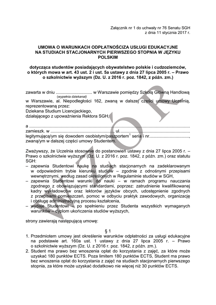 Załącznik nr 1 do uchwały nr 76 Senatu SGH z dnia 11 stycznia 2017 r. UMOWA O WARUNKACH ODPŁATNOŚCIZA USŁUGI EDUKACYJNE NA STUDIACH STACJONARNYCH PIERWSZEGO STOPNIA W JĘZYKU POLSKIM dotycząca studentów posiadających obywatelstwo polskie i cudzoziemców, o których mowa w art. 43 ust. 2 i ust. 5a ustawy z dnia 27 lipca 2005 r. – Prawo o szkolnictwie wyższym (Dz. U. z 2016 r. poz. 1842, z późn. zm.) zawarta w dniu .............................. w Warszawie pomiędzy Szkołą Główną Handlową (wypełnia dziekanat) w Warszawie, al. Niepodległości 162, zwaną w dalszej części umowy Uczelnią, reprezentowaną przez: Dziekana Studium Licencjackiego, działającego z upoważnienia Rektora SGH, a .................................................................................................................................... zamieszk. w ...................................................., ul. ......................................................... legitymującą/ym się dowodem osobistym/paszportem 1 seria i nr................................., zwaną/ym w dalszej części umowy Studentem. Zważywszy, że Uczelnia stosownie do postanowień ustawy z dnia 27 lipca 2005 r. – Prawo o szkolnictwie wyższym (Dz. U. z 2016 r. poz. 1842, z późn. zm.) oraz statutu SGH: – zapewnia Studentowi naukę na studiach stacjonarnych na zadeklarowanym w odpowiednim trybie kierunku studiów – zgodnie z odnośnymi przepisami wewnętrznymi, według zasad określonych w Regulaminie studiów w SGH, – zapewnia Studentowi warunki do nauki – w ramach programu nauczania zgodnego z obowiązującymi standardami, poprzez: zatrudnienie kwalifikowanej kadry wykładowców oraz lektorów języków obcych, udostępnienie zgodnych z przepisami pomieszczeń, pomoc w odbyciu praktyk zawodowych, organizację i obsługę administracyjną procesu kształcenia, – wydaje Studentowi – po spełnieniu przez Studenta wszystkich wymaganych warunków – dyplom ukończenia studiów wyższych, strony zawierają następującą umowę: §1 1. Przedmiotem umowy jest określenie warunków odpłatności za usługi edukacyjne na podstawie art. 160a ust. 1 ustawy z dnia 27 lipca 2005 r. – Prawo o szkolnictwie wyższym (Dz. U. z 2016 r. poz. 1842, z późn. zm.). 2. Student ma prawo bez wnoszenia opłat do korzystania z zajęć, za które może uzyskać 180 punktów ECTS. Poza limitem 180 punktów ECTS, Student ma prawo bez wnoszenia opłat do korzystania z zajęć na studiach stacjonarnych pierwszego stopnia, za które może uzyskać dodatkowo nie więcej niż 30 punktów ECTS. §2 1. Student studiujący na studiach stacjonarnych pierwszego stopnia w języku polskim zobowiązuje się do terminowego uiszczania, zgodnie z postanowieniami niniejszej umowy, opłat określonych w tabeli opłat, wymienionej w § 8 pkt 1 umowy, w szczególności za: 1) powtarzanie – z powodu niezadowalających wyników w nauce – określonych zajęć, semestru lub roku; 2) zajęcia nieobjęte planem studiów. 2. Poza opłatami, o których mowa w ust. 1, Student zobowiązany jest wnosić opłaty, których wysokość i warunki wnoszenia określa zarządzenie Rektora nr … z dnia ……………… w sprawie odpłatności za niektóre dokumenty z przebiegu studiów wydawane w Szkole Głównej Handlowej w Warszawie2. §3 1. Opłaty, o których mowa w § 2 ust. 1, obowiązują przez czas trwania umowy. 2. Opłata za naukę na studiach, o których mowa w § 2 ust. 1, odzwierciedla koszt przygotowania i realizacji programu studiów. W przypadku realizacji programu studiów w okresie krótszym niż planowy, opłata podlega uiszczeniu w całości. 3. Na udokumentowany wniosek Studenta, w sytuacjach uzasadnionych jego trudną sytuacją materialną, Dziekan może wyrazić zgodę na przesunięcie terminu płatności, jednak termin płatności nie może wykraczać poza okres studiów. Student może wnieść opłatę w ratach, w wysokości i terminach określonych w tabeli opłat, o której mowa w § 8. Wpłacając kolejną ratę student może wskazać okres, którego rata dotyczy. W przypadku braku wskazania okresu, którego rata dotyczy, a także w przypadku zalegania studenta z opłatami, o zaliczeniu poszczególnych wpłat decyduje Uczelnia. 4. Student zobowiązany jest do okazania dowodu wniesienia opłaty na wezwanie upoważnionych pracowników Uczelni. 5. Za datę wniesienia opłaty uważa się datę zaksięgowania wpłaconej kwoty na wskazanym w systemie Wirtualny Dziekanat, właściwym, indywidualnym rachunku Studenta prowadzonym w ramach konta bankowego Uczelni. 6. Każdorazowe opóźnienie w dokonaniu opłaty lub jej części, albo wniesienie jej w niepełnej kwocie, skutkuje naliczeniem przez Uczelnię odsetek ustawowych za opóźnienie od zaległej kwoty. 7. Kwoty należne Uczelni, wynikające z niniejszej umowy, Student wnosi bez wezwania w terminach określonych w umowie, tabeli opłat lub decyzji właściwego organu Uczelni, na wskazany w systemie Wirtualny Dziekanat, właściwy, indywidualny rachunek Studenta prowadzony w ramach konta bankowego Uczelni, z zaznaczeniem tytułu płatności. 8. Na wniosek Studenta Uczelnia wystawia fakturę opiewającą na wartość wniesionej opłaty. Wniosek należy złożyć do właściwego Dziekanatu w terminie wynikającym z przepisów prawa podatkowego. §4 1. W przypadku opóźnienia we wnoszeniu opłat i płatności określonych w § 2 trwającego dłużej niż 30 dni, Dziekan może podjąć decyzję o skreśleniu Studenta z listy studentów. 2. Wznowienie studiów i ponowny wpis na listę studentów wymaga zawarcia nowej umowy, zgodnie ze wzorem obowiązującym na dany semestr. 3. Warunkiem zawarcia umowy, o której mowa w ust. 2, jest uregulowanie wszystkich zaległości w opłatach wraz z odsetkami i wniesienie opłaty za postępowanie związane ze wznowieniem studiów w kwocie określonej na dany rok akademicki, zgodnie z przepisami obowiązującymi w Uczelni. 4. Rozwiązanie niniejsz