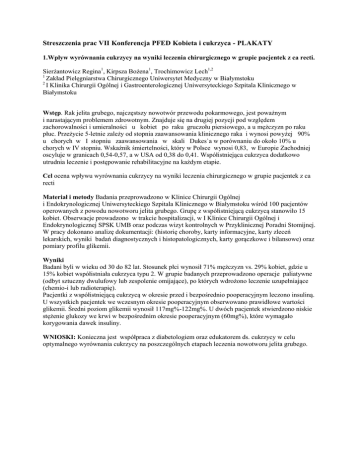 Streszczenia prac VII Konferencja PFED Kobieta i cukrzyca - PLAKATY 1.Wpływ wyrównania cukrzycy na wyniki leczenia chirurgicznego w grupie pacjentek z ca recti. Sierżantowicz Regina1, Kirpsza Bożena1, Trochimowicz Lech1,2 1 Zakład Pielęgniarstwa Chirurgicznego Uniwersytet Medyczny w Białymstoku 2 I Klinika Chirurgii Ogólnej i Gastroenterologicznej Uniwersyteckiego Szpitala Klinicznego w Białymstoku Wstęp. Rak jelita grubego, najczęstszy nowotwór przewodu pokarmowego, jest poważnym i narastającym problemem zdrowotnym. Znajduje się na drugiej pozycji pod względem zachorowalności i umieralności u kobiet po raku gruczołu piersiowego, a u mężczyzn po raku płuc. Przeżycie 5-letnie zależy od stopnia zaawansowania klinicznego raka i wynosi powyżej 90% u chorych w I stopniu zaawansowania w skali Dukes`a w porównaniu do około 10% u chorych w IV stopniu. Wskaźnik śmiertelności, który w Polsce wynosi 0,83, w Europie Zachodniej oscyluje w granicach 0,54-0,57, a w USA od 0,38 do 0,41. Współistniejąca cukrzyca dodatkowo utrudnia leczenie i postępowanie rehabilitacyjne na każdym etapie. Cel ocena wpływu wyrównania cukrzycy na wyniki leczenia chirurgicznego w grupie pacjentek z ca recti Materiał i metody Badania przeprowadzono w Klinice Chirurgii Ogólnej i Endokrynologicznej Uniwersyteckiego Szpitala Klinicznego w Białymstoku wśród 100 pacjentów operowanych z powodu nowotworu jelita grubego. Grupę z współistniejącą cukrzycą stanowiło 15 kobiet. Obserwacje prowadzono w trakcie hospitalizacji, w I Klinice Chirurgii Ogólnej i Endokrynologicznej SPSK UMB oraz podczas wizyt kontrolnych w Przyklinicznej Poradni Stomijnej. W pracy dokonano analizę dokumentacji: (historię choroby, karty informacyjne, karty zleceń lekarskich, wyniki badań diagnostycznych i histopatologicznych, karty gorączkowe i bilansowe) oraz pomiary profilu glikemii. Wyniki Badani byli w wieku od 30 do 82 lat. Stosunek płci wynosił 71% mężczyzn vs. 29% kobiet, gdzie u 15% kobiet współistniała cukrzyca typu 2. W grupie badanych przeprowadzono operacje paliatywne (odbyt sztuczny dwulufowy lub zespolenie omijające), po których wdrożono leczenie uzupełniające (chemio-i lub radioterapię). Pacjentki z współistniejącą cukrzycą w okresie przed i bezpośrednio pooperacyjnym leczono insuliną. U wszystkich pacjentek we wczesnym okresie pooperacyjnym obserwowano prawidłowe wartości glikemii. Średni poziom glikemii wynosił 117mg%-122mg%. U dwóch pacjentek stwierdzono niskie stężenie glukozy we krwi w bezpośrednim okresie pooperacyjnym (60mg%), które wymagało korygowania dawek insuliny. WNIOSKI: Konieczna jest współpraca z diabetologiem oraz edukatorem ds. cukrzycy w celu optymalnego wyrównania cukrzycy na poszczególnych etapach leczenia nowotworu jelita grubego. 2. Cukrzyca ciężarnych-opieka pielęgniarska Kostrzewa-Zabłocka Ewa¹, Kawęcka Edyta¹,³ ¹Wyższa Szkoła Zarządzania i Administracji w Zamościu. Wydział Fizjoterapii i Pedagogiki. Kierunek: Pielęgniarstwo ²Wojewódzki Szpital Specjalistyczny w Chełmie. Edukator do spraw diabetologii. ³Studentka Wydziału Pielęgniarskiego w Zamościu Wstęp: Według definicji WHO cukrzyca ciążowa (GDM) jest zaburzeniem tolerancji węglowodanów, które po raz pierwszy pojawiły się w ciąży i które może całkowicie ustąpić po jej zakończeniu lub utrzymywać się po porodzie w postaci trwałej cukrzycy. Cukrzyca ciążowa stanowi około 80% przypadków zaburzeń węglowodanów. Najczęściej po rozwiązaniu, regulacja glikemii powraca do poziomu prawidłowego. Przebycie cukrzycy ciążowej predysponuje do rozwoju nieprawidłowej tolerancji węglowodanów w przyszłości. Pielęgniarka przekazuje pacjentce wiedzę z zakresu istoty cukrzycy, kontroli glikemii, odżywiania, aktywności fizycznej oraz kształtuje umiejętności związane z podawaniem insuliny. Cel pracy: Sprawdzenie, czy kobiety z rozpoznaną cukrzycą ciążową są w pełni przygotowane do samoopieki i samokontroli. Materiał i metody: Badanie przeprowadzono metodą ankietową wśród kobiet z cukrzycą ciążową leczonych w Poradni Ginekologicznej w Krasnymstawie w 2011 roku. Ankieta składała się z 20 pytań zamkniętych. W badaniu wzięło udział 78 kobiet. 50% pań była w wieku 25-35 lat, 30% w wieku 3540. Tylko 15% znajdowała się w wieku 18-25 lat. Przeważały kobiety ze średnim wykształceniem (47,8%). Większość była w pierwszej (34,8%) lub drugiej (34,8%) ciąży. Cukrzyca ciążowa wystąpiła u 2% kobiet w poprzednich ciążach. U większości kobiet (71%) cukrzyca w rodzinie nie występowała. Leczonych dietą było 82% pań, a tylko 17% musiało przyjmować insulinę. Analiza otrzymanych wyników: Ogólny poziom wiedzy na temat cukrzycy ciążowej był dostateczny (59,7%). Większość ankietowanych (67,4%) wiedziała jaki jest prawidłowy poziom cukru we krwi oraz że dieta ma wpływ na jego poziom. Prawie żadna z pań (97,8%) nie wiedziała, jaka powinna być zawartość węglowodanów w diecie. Tylko 39% pacjentek w czasie ciąży stosowała wysiłek fizyczny. 45% zdawała sobie sprawę o konieczności wykonywania cukru i acetonu w moczu oraz powtórzenia testu obciążenia glukozą po porodzie. 84% wiedziała, że zdrowy styl życia może uchronić przed zachorowaniem na cukrzycę w przyszłości. Wnioski: Badane pacjentki nie były w pełni przygotowane do samoopieki i samokontroli w cukrzycy. Pielęgniarka edukacyjna powinna w sposób profesjonalny nauczyć kobietę z cukrzycą ciążową, zasad postępowania prowadzących do urodzenia zdrowego dziecka oraz aby w przyszłości uniknąć zachorowania na cukrzycę typu 2. 3.Dieta 1800 kcal dla kobiety z cukrzycą i nadwagą – ocena pokrycia normy na wybrane witaminy i składniki mineralne mgr Aleksandra Cichocka, prof. dr hab. med. Wiktor B. Szostak Instytut Żywności i Żywienia w Warszawie Cel: ocena pokrycia normy na wybrane witaminy i składniki mineralne