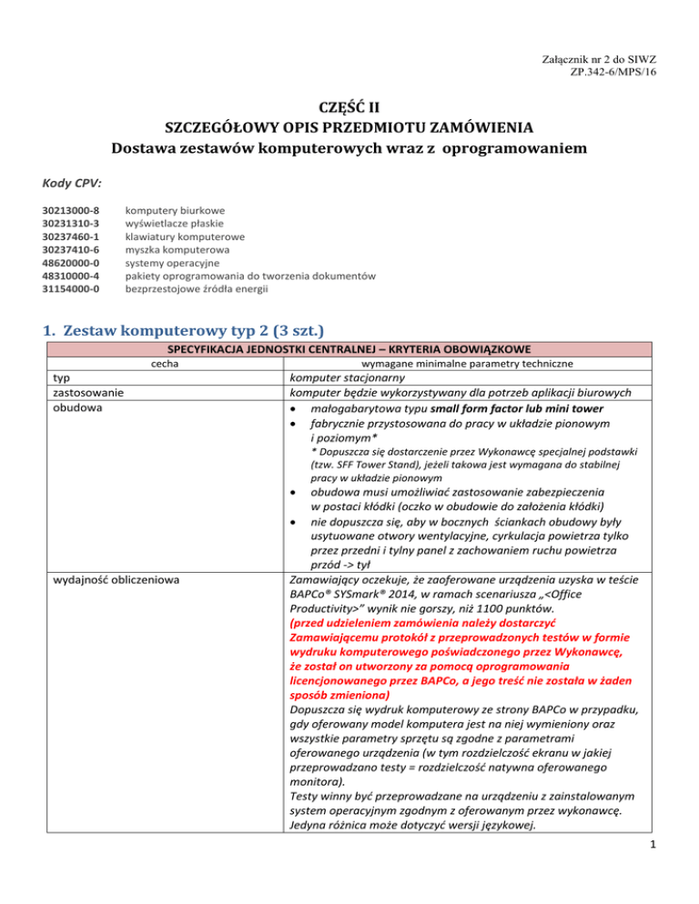 Załącznik nr 2 do SIWZ ZP.342-6/MPS/16 CZĘŚĆ II SZCZEGÓŁOWY OPIS PRZEDMIOTU ZAMÓWIENIA Dostawa zestawów komputerowych wraz z oprogramowaniem Kody CPV: 30213000-8 30231310-3 30237460-1 30237410-6 48620000-0 48310000-4 31154000-0 komputery biurkowe wyświetlacze płaskie klawiatury komputerowe myszka komputerowa systemy operacyjne pakiety oprogramowania do tworzenia dokumentów bezprzestojowe źródła energii 1. Zestaw komputerowy typ 2 (3 szt.) SPECYFIKACJA JEDNOSTKI CENTRALNEJ – KRYTERIA OBOWIĄZKOWE cecha typ zastosowanie obudowa wymagane minimalne parametry techniczne komputer stacjonarny komputer będzie wykorzystywany dla potrzeb aplikacji biurowych małogabarytowa typu small form factor lub mini tower fabrycznie przystosowana do pracy w układzie pionowym i poziomym* * Dopuszcza się dostarczenie przez Wykonawcę specjalnej podstawki (tzw. SFF Tower Stand), jeżeli takowa jest wymagana do stabilnej pracy w układzie pionowym wydajność obliczeniowa obudowa musi umożliwiać zastosowanie zabezpieczenia w postaci kłódki (oczko w obudowie do założenia kłódki) nie dopuszcza się, aby w bocznych ściankach obudowy były usytuowane otwory wentylacyjne, cyrkulacja powietrza tylko przez przedni i tylny panel z zachowaniem ruchu powietrza przód -> tył Zamawiający oczekuje, że zaoferowane urządzenia uzyska w teście BAPCo® SYSmark® 2014, w ramach scenariusza „<Office Productivity>” wynik nie gorszy, niż 1100 punktów. (przed udzieleniem zamówienia należy dostarczyć Zamawiającemu protokół z przeprowadzonych testów w formie wydruku komputerowego poświadczonego przez Wykonawcę, że został on utworzony za pomocą oprogramowania licencjonowanego przez BAPCo, a jego treść nie została w żaden sposób zmieniona) Dopuszcza się wydruk komputerowy ze strony BAPCo w przypadku, gdy oferowany model komputera jest na niej wymieniony oraz wszystkie parametry sprzętu są zgodne z parametrami oferowanego urządzenia (w tym rozdzielczość ekranu w jakiej przeprowadzano testy = rozdzielczość natywna oferowanego monitora). Testy winny być przeprowadzane na urządzeniu z zainstalowanym system operacyjnym zgodnym z oferowanym przez wykonawcę. Jedyna różnica może dotyczyć wersji językowej. 1 procesor zgodny z architekturą x86, 64-bitowy płyta główna złącza na karty rozszerzeń sprzętowe wsparcie technologii wirtualizacji firmware bezpieczeństwo RAM pojemność zainstalowanej pamięci maksymalna pojemność pamięci możliwa do zainstalowania HDD pojemność napęd optyczny zintegrowana karta graficzna zintegrowana karta dźwiękowa zintegrowana karta sieciowa złącza na panelu tylnym sprzętowe wsparcie dla szyfrowania AES min. 1 wolny slot PCI-E TAK zgodny ze specyfikacją UEFI funkcja SecureBoot zintegrowany z płytą główną dedykowany układ sprzętowy służący do tworzenia i zarządzania wygenerowanymi przez komputer kluczami szyfrowania. Zabezpieczenie to musi posiadać możliwość szyfrowania poufnych dokumentów przechowywanych na dysku twardym przy użyciu klucza sprzętowego. 8 GB (minimum jeden wolny slot na płycie głównej pod przyszłą rozbudowę) min. 16 GB minimum 500 GB HDD nagrywarka DVD +/- RW TAK możliwość pracy w konfiguracji dwumonitorowej TAK TAK Gigabit Ethernet, wspierająca obsługę WoL (funkcja włączana przez użytkownika), PXE minimum 4 x USB (z czego minimum 2 porty w standardzie USB 3.0) 2 cyfrowe wyjścia wideo: HDMI lub DisplayPort lub DVI-D* * dopuszcza się wyjścia wideo różnych typów, np. 1xDisplayPort + 1xDVI-D na panelu przednim zasilacz ergonomia 1 x RJ-45 (LAN) 1 x wyjście audio 1 x wejście audio 2 x USB 3.0 1 x wyjście słuchawkowe 1 x wejście na mikrofon zasilacz pracujący w sieci 230V 50/60Hz prądu przemiennego i efektywności min. 88% przy obciążeniu zasilacza na poziomie 50% oraz o efektywności min. 85% przy obciążeniu zasilacza na poziomie 100% (80 PLUS Bronze) głośność jednostki centralnej mierzona zgodnie z normą ISO 7779 oraz wykazana zgodnie z normą ISO 9296 w pozycji operatora w trybie jałowym (IDLE) wynosząca maksymalnie 26 dB (przed udzieleniem zamówienia należy dostarczyć Zamawiającemu oświadczenie producenta lub dokument równoważny* zawierający informację nt. poziomu głośności jednostki centralnej mierzonej zgodnie z normą ISO 7779 oraz wykazanej zgodnie z normą ISO 9296 w pozycji operatora w trybie jałowym (IDLE)) * za dokument równoważny Zamawiający uzna inny dokument stworzony przez producenta np. oficjalną kartę katalogową produktu lub deklarację środowiskową produktu zawierającą wymaganą informację urządzenia sterujące klawiatura USB w układzie polski programisty, pełnowymiarowe klawisze funkcyjne pełnowymiarowa* mysz optyczna USB z rolką (800 dpi) oraz 2 urządzenia sterujące (c.d.) system operacyjny oprogramowanie biurowe podkładka pod mysz * nie dopuszcza się zminiaturyzowanych myszy przeznaczonych dla laptopów długość przewodu (klawiatura/mysz) – min. 1.8m preinstalowany fabrycznie przez producenta oferowanych jednostek centralnych w polskiej wersji językowej w wersji 64bitowej, nie wymagający ręcznego wpisywania klucza produktu. Dołączony nośnik (lub partycja na dysku twardym) umożliwiający szybkie przywrócenie fabrycznie preinstalowanego systemu operacyjnego możliwość skonfigurowania systemu pod kątem osób niepełnosprawnych (np. słabo widzących), wbudowana funkcja narratora umożliwiająca odczytywanie (w języku polskim) zawartości elementów na ekranie takich jak tekst i przyciski oferujący obsługę logowania do domeny, profile mobilne współpracujące z kontrolerem domeny pracującym pod kontrolą Windows 2012 Server R2 kompatybilny z oprogramowaniem antywirusowym AVG Internet Security Business Edition 2016 oferujący wsparcie dla Java i .NET Framework – możliwość uruchomienia aplikacji działających we wskazanych środowiskach w najnowszej wersji lub umożliwiającej bezpłatną 