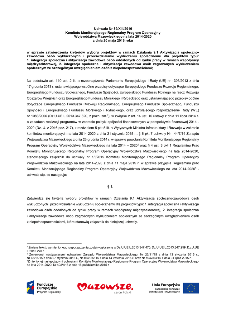 Uchwała Nr 39/XIII/2016 Komitetu Monitorującego Regionalny Program Operacyjny Województwa Mazowieckiego na lata 2014-2020 z dnia 20 maja 2016 roku w sprawie zatwierdzenia kryteriów wyboru projektów w ramach Działania 9.1 Aktywizacja społecznozawodowa osób wykluczonych i przeciwdziałanie wykluczeniu społecznemu dla projektów typu: 1. integracja społeczna i aktywizacja zawodowa osób oddalonych od rynku pracy w ramach współpracy międzysektorowej, 2. integracja społeczna i aktywizacja zawodowa osób zagrożonych wykluczeniem społecznym ze szczególnym uwzględnieniem osób z niepełnosprawnościami; Na podstawie art. 110 ust. 2 lit. a rozporządzenia Parlamentu Europejskiego i Rady (UE) nr 1303/2013 z dnia 17 grudnia 2013 r. ustanawiającego wspólne przepisy dotyczące Europejskiego Funduszu Rozwoju Regionalnego, Europejskiego Funduszu Społecznego, Funduszu Spójności, Europejskiego Funduszu Rolnego na rzecz Rozwoju Obszarów Wiejskich oraz Europejskiego Funduszu Morskiego i Rybackiego oraz ustanawiającego przepisy ogólne dotyczące Europejskiego Funduszu Rozwoju Regionalnego, Europejskiego Funduszu Społecznego, Funduszu Spójności i Europejskiego Funduszu Morskiego i Rybackiego, oraz uchylającego rozporządzenie Rady (WE) nr 1083/2006 (Dz.U.UE.L.2013.347.320, z późn. zm.1), w związku z art. 14 ust. 10 ustawy z dnia 11 lipca 2014 r. o zasadach realizacji programów w zakresie polityki spójności finansowanych w perspektywie finansowej 2014 2020 (Dz. U. z 2016 poz. 217), z rozdziałem 5 pkt 5 lit. a Wytycznych Ministra Infrastruktury i Rozwoju w zakresie komitetów monitorujących na lata 2014-2020 z dnia 21 stycznia 2015 r., § 6 pkt 7 uchwały Nr 144/7/14 Zarządu Województwa Mazowieckiego z dnia 23 grudnia 2014 r. w sprawie powołania Komitetu Monitorującego Regionalny Program Operacyjny Województwa Mazowieckiego na lata 2014 – 20202 oraz § 4 ust. 3 pkt 1 Regulaminu Prac Komitetu Monitorującego Regionalny Program Operacyjny Województwa Mazowieckiego na lata 2014-2020, stanowiącego załącznik do uchwały nr 1/I/2015 Komitetu Monitorującego Regionalny Program Operacyjny Województwa Mazowieckiego na lata 2014-2020 z dnia 11 maja 2015 r. w sprawie przyjęcia Regulaminu prac Komitetu Monitorującego Regionalny Program Operacyjny Województwa Mazowieckiego na lata 2014-20203 uchwala się, co następuje: § 1. Zatwierdza się kryteria wyboru projektów w ramach Działania 9.1 Aktywizacja społeczno-zawodowa osób wykluczonych i przeciwdziałanie wykluczeniu społecznemu dla projektów typu: 1. integracja społeczna i aktywizacja zawodowa osób oddalonych od rynku pracy w ramach współpracy międzysektorowej, 2. integracja społeczna i aktywizacja zawodowa osób zagrożonych wykluczeniem społecznym ze szczególnym uwzględnieniem osób z niepełnosprawnościami, które stanowią załącznik do niniejszej uchwały. Zmiany tekstu wymienionego rozporządzenia zostały ogłoszone w Dz.U.UE.L.2013.347.470, Dz.U.UE.L.2013.347.259, Dz.U.UE L 2015.270.1 2 Zmienionej następującymi uchwałami Zarządu Województwa Mazowieckiego: Nr 23/11/15 z dnia 13 stycznia 2015 r., Nr 66/15/15 z dnia 27 stycznia 2015 r., Nr 464/ 35/ 15 z dnia 14 kwietnia 2015 r. oraz Nr 1042/63/15 z dnia 31 lipca 2015 r. 3 Zmienionej następującymi uchwałami Komitetu Monitorującego Regionalny Program Operacyjny Województwa Mazowieckiego na lata 2014-2020: Nr 40/IV/15 z dnia 16 października 2015 r 1 § 2. Wykonanie uchwały powierza się Przewodniczącemu Komitetu Monitorującego Regionalny Program Operacyjny Województwa Mazowieckiego na lata 2014-2020. § 3. Uchwała wchodzi w życie z dniem podjęcia.