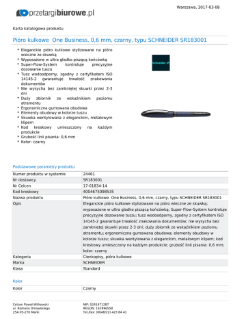 Warszawa, 2017-03-08 Karta katalogowa produktu Pióro kulkowe One Business, 0,6 mm, czarny, typu SCHNEIDER SR183001 Eleganckie pióro kulkowe stylizowane na pióro wieczne ze skuwką Wyposażone w ultra gładko piszącą końcówką Super-Flow-System kontroluje precyzyjne dozowanie tuszu Tusz wodoodporny, zgodny z certyfikatem ISO 14145-2 gwarantuje trwałość znakowania dokumentów Nie wysycha bez zamkniętej skuwki przez 2-3 dni Duży zbiornik ze wskaźnikiem poziomu atramentu Ergonomiczna gumowana obudowa Elementy obudowy w kolorze tuszu Skuwka wentylowana z eleganckim, metalowym klipem Kod kreskowy umieszczony na każdym produkcie Grubość linii pisania: 0,6 mm Kolor: czarny Podstawowe parametry produktu Numer produktu w systemie 24461 Nr dostawcy SR183001 Nr Celcen 17-01834-14 Kod kreskowy 4004675098535 Nazwa produktu Pióro kulkowe One Business, 0,6 mm, czarny, typu SCHNEIDER SR183001 Opis Eleganckie pióro kulkowe stylizowane na pióro wieczne ze skuwką; wyposażone w ultra gładko piszącą końcówką; Super-Flow-System kontroluje precyzyjne dozowanie tuszu; tusz wodoodporny, zgodny z certyfikatem ISO 14145-2 gwarantuje trwałość znakowania dokumentów; nie wysycha bez zamkniętej skuwki przez 2-3 dni; duży zbiornik ze wskaźnikiem poziomu atramentu; ergonomiczna gumowana obudowa; elementy obudowy w kolorze tuszu; skuwka wentylowana z eleganckim, metalowym klipem; kod kreskowy umieszczony na każdym produkcie; grubość linii pisania: 0,6 mm; kolor: czarny Kategoria Cienkopisy, pióra kulkowe Marka SCHNEIDER Klasa Standard Kolor Kolor Czarny Celcen Paweł Witkowski ul. Romana Dmowskiego 25A 05-270 Marki NIP: 5241471287 REGON: 142996558 Tel./fax: (0048/22) 423 84 41 Warszawa, 2017-03-08 Cecha W ofercie od 2015-04 Produkt Pióro kulkowe Typ Klasyczny Wymiary Grubość linii (mm) 0,6 Certyfikaty Hit Hit Nowy produkt w ofercie Standard Wspólny słownik zamówień CPV 30192121-5 Długopisy kulkowe Jesteśmy przekonani, że z pomocą przetargibiurowe.pl usprawnicie Państwo własne procesy biznesowe związane ze żmudnym poszukiwaniem odpowiadających Państwu produktów oraz opracowaniem specyfikacjii zapytań ofertowych. Serdecznie zapraszamy do wspópracy Zespół, PrzetargiBiurowe.pl Celcen Paweł Witkowski ul. Romana Dmowskiego 25A 05-270 Marki NIP: 5241471287 REGON: 142996558 Tel./fax: (0048/22) 423 84 41