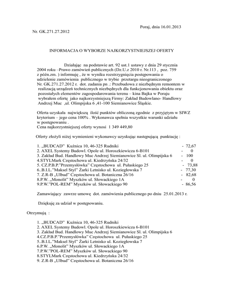 Poraj, dnia 16.01.2013 Nr. GK.271.27.2012 INFORMACJA O WYBORZE NAJKORZYSTNIEJSZEJ OFERTY Działając na podstawie art. 92 ust.1 ustawy z dnia 29 stycznia 2004 roku –Prawo zamówień publicznych (Dz.U.z 2010 r. Nr.113 , poz. 759 z późn.zm. ) informuję , że w wyniku rozstrzygnięcia postępowania o udzielenie zamówienia publicznego w trybie przetargu nieograniczonego Nr. GK.271.27.2012 r. dot. zadania pn .: Przebudowa z niezbędnym remontem w realizacją urządzeń technicznych niezbędnych dla funkcjonowania obiektu oraz pozostałych elementów zagospodarowania terenu – kina Bajka w Poraju wybrałem ofertę jako najkorzystniejszą Firmy: Zakład Budowlano- Handlowy Andrzej Muc ,ul. Olimpijska 6 ,41-100 Siemianowice Śląskie. Oferta uzyskała największą ilość punktów obliczoną zgodnie z przyjętym w SIWZ kryterium – jego cena 100% . Wykonawca spełnia wszystkie warunki udziału w postępowaniu . Cena najkorzystniejszej oferty wynosi 1 349 449,80 Oferty złożyli niżej wymienieni wykonawcy uzyskując następującą punktację : 1. „BUDCAD” Kuźnica 10, 46-325 Rudniki 2. AXEL Systemy Budowl. Opole ul. Horoszkiewicza 6-B101 3. Zakład Bud. Handlowy Muc Andrzej Siemianowice Sl. ul. Olimpijska 6 4.STYLMark Częstochowa ul. Kiedrzyńska 24/32 5. CZ.P.B.P.”Przemysłówka” Częstochowa ul. Pułaskiego 25 6..B.I.L.”Maksel Styl” Żarki Letnisko ul. Koziegłowska 7 7. Z.R-B „Ulbud” Częstochowa ul. Botaniczna 26/16 8.P.W. „Monolit” Myszków ul. Słowackiego 1A 9.P.W.”POL-REM” Myszków ul. Słowackiego 90 - 72,67 0 100 0 73,88 77,30 82,68 0 86,56 Zamawiający zawrze umowę dot. zamówienia publicznego po dniu 25.01.2013 r. Dziękuję za udział w postępowaniu. Otrzymują : 1. „BUDCAD” Kuźnica 10, 46-325 Rudniki 2. AXEL Systemy Budowl. Opole ul. Horoszkiewicza 6-B101 3. Zakład Bud. Handlowy Muc Andrzej Siemianowice Sl. ul. Olimpijska 6 4.CZ.P.B.P.”Przemysłówka” Częstochowa ul. Pułaskiego 25 5..B.I.L.”Maksel Styl” Żarki Letnisko ul. Koziegłowska 7 6.P.W. „Monolit” Myszków ul. Słowackiego 1A 7.P.W.”POL-REM” Myszków ul. Słowackiego 90 8.STYLMark Częstochowa ul. Kiedrzyńska 24/32 9. Z.R-B „Ulbud” Częstochowa ul. Botaniczna 26/16